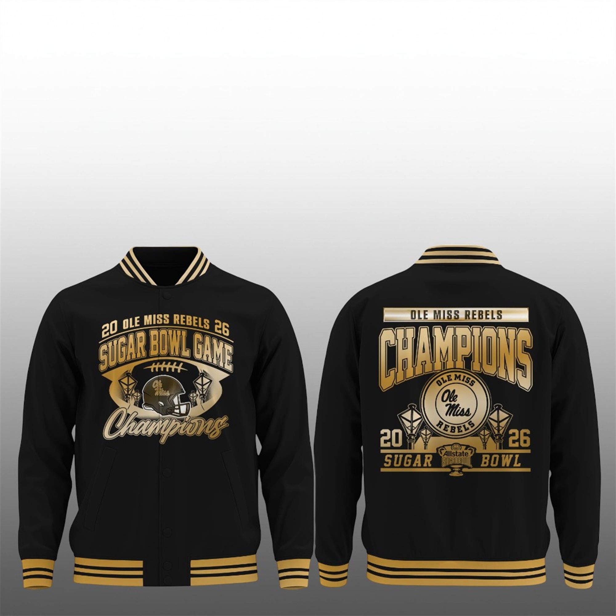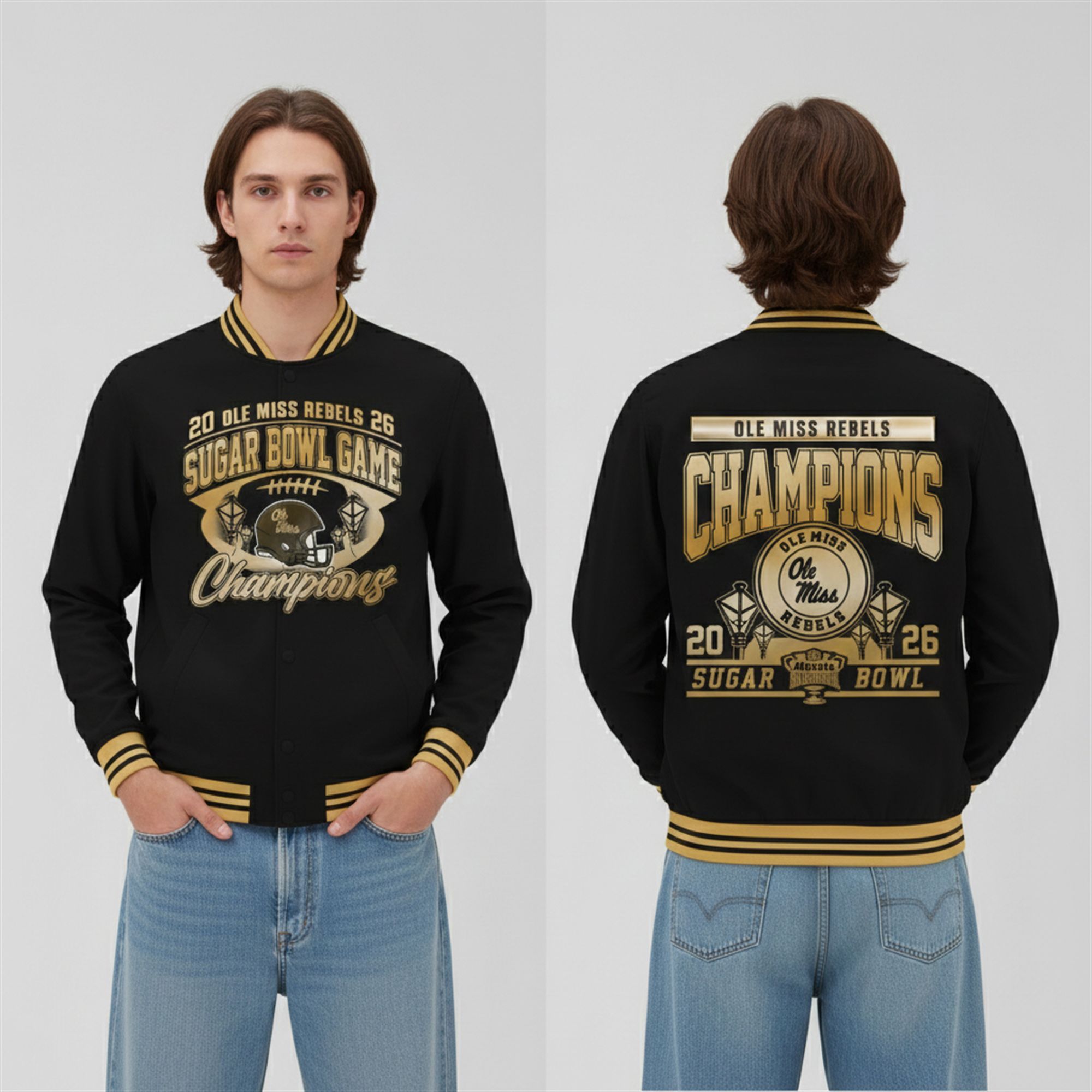 This jacket is designed as a visual narrative of the Ole Miss Rebels’ incredible journey to the 2026 Sugar Bowl title. The aesthetic is strictly “Champions Only,” utilizing a striking black canvas to allow the commemorative gold graphics to explode with vibrancy. The front of the jacket features a custom helmet graphic flanked by traditional streetlamps—a subtle nod to the setting of the Sugar Bowl—anchored by the bold “Sugar Bowl Game Champions” script. It captures the prestige of the event without saying a word, allowing the typography and iconography to tell the story of the victory.