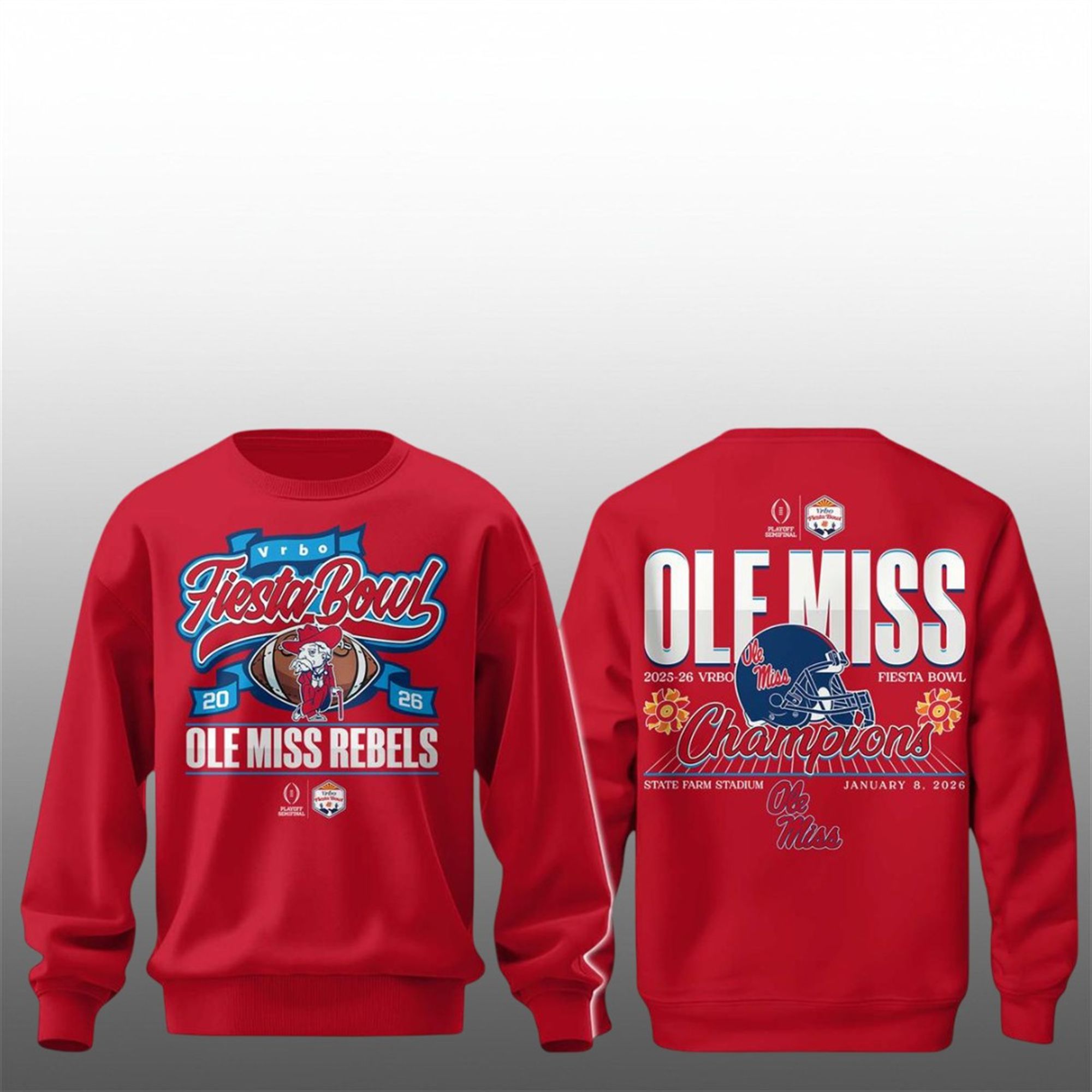 The Back: This is where the story is told. A massive “OLE MISS” header dominates the design, sitting above a detailed graphic of the Rebels’ helmet. The “Champions” script is emblazoned in a celebratory font, flanked by commemorative flower graphics that nod to the Fiesta Bowl tradition. Crucially, the text “State Farm Stadium” and the date “January 8, 2026” are printed below, forever timestamping the location and moment of victory.