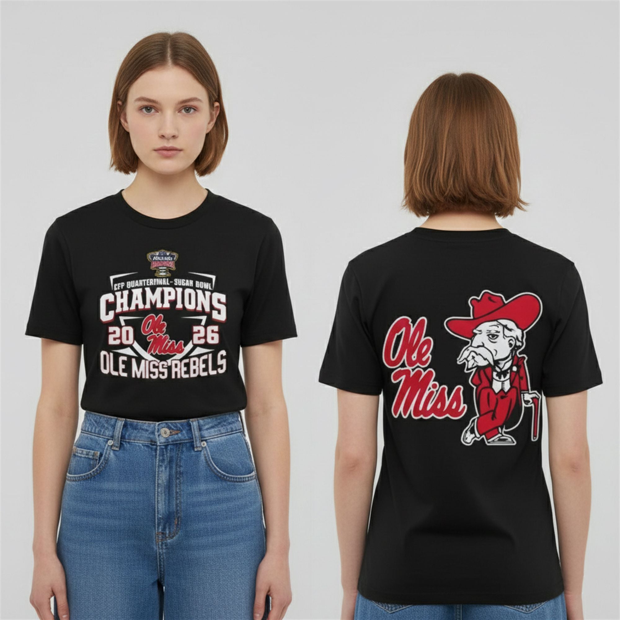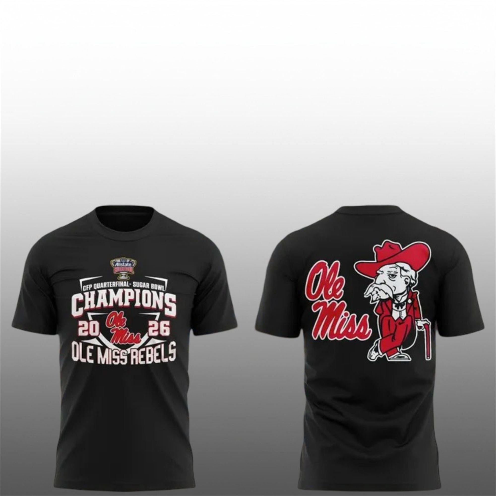The front of the shirt boldly declares “Champions 2026,” centered around the prestigious CFP Quarterfinal and Sugar Bowl insignias. It serves as a direct scoreboard reference to the 39-34 victory over Georgia. On the back, the apparel takes a nostalgic turn, featuring a large, high-definition graphic of the vintage “Colonel” mascot leaning on his cane—a nod to the deep-rooted traditions of Oxford football. This combination of modern victory and retro aesthetics makes it a unique collector’s item for any member of Rebel Nation.