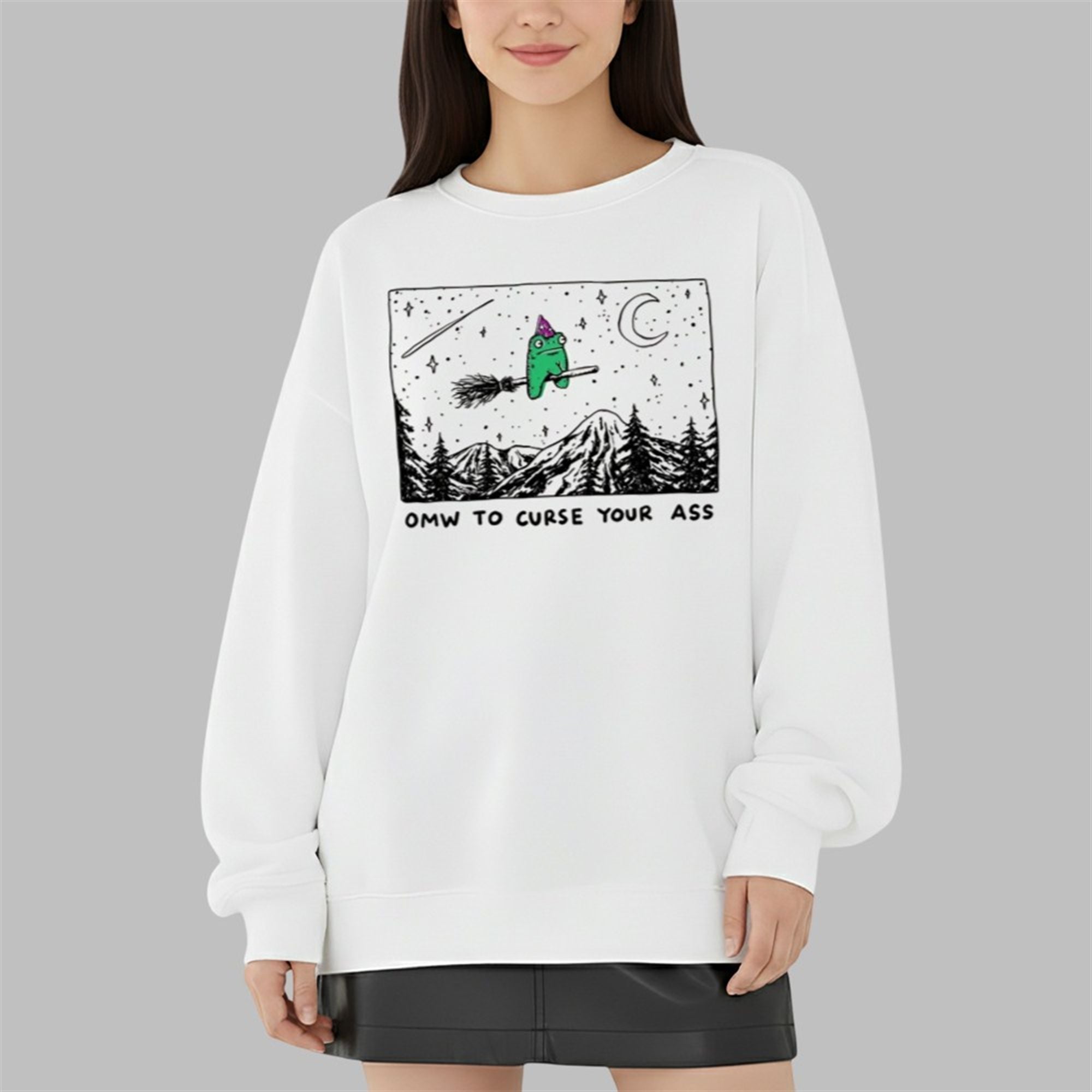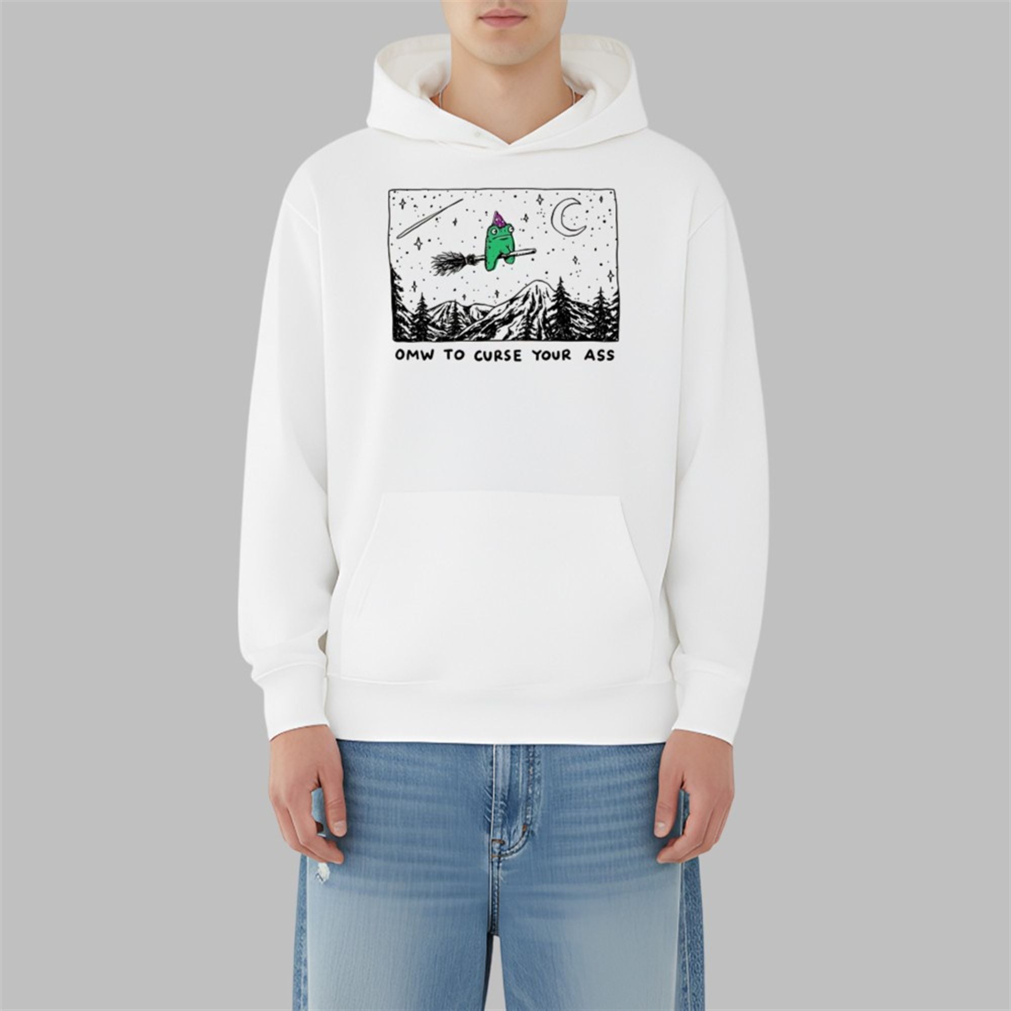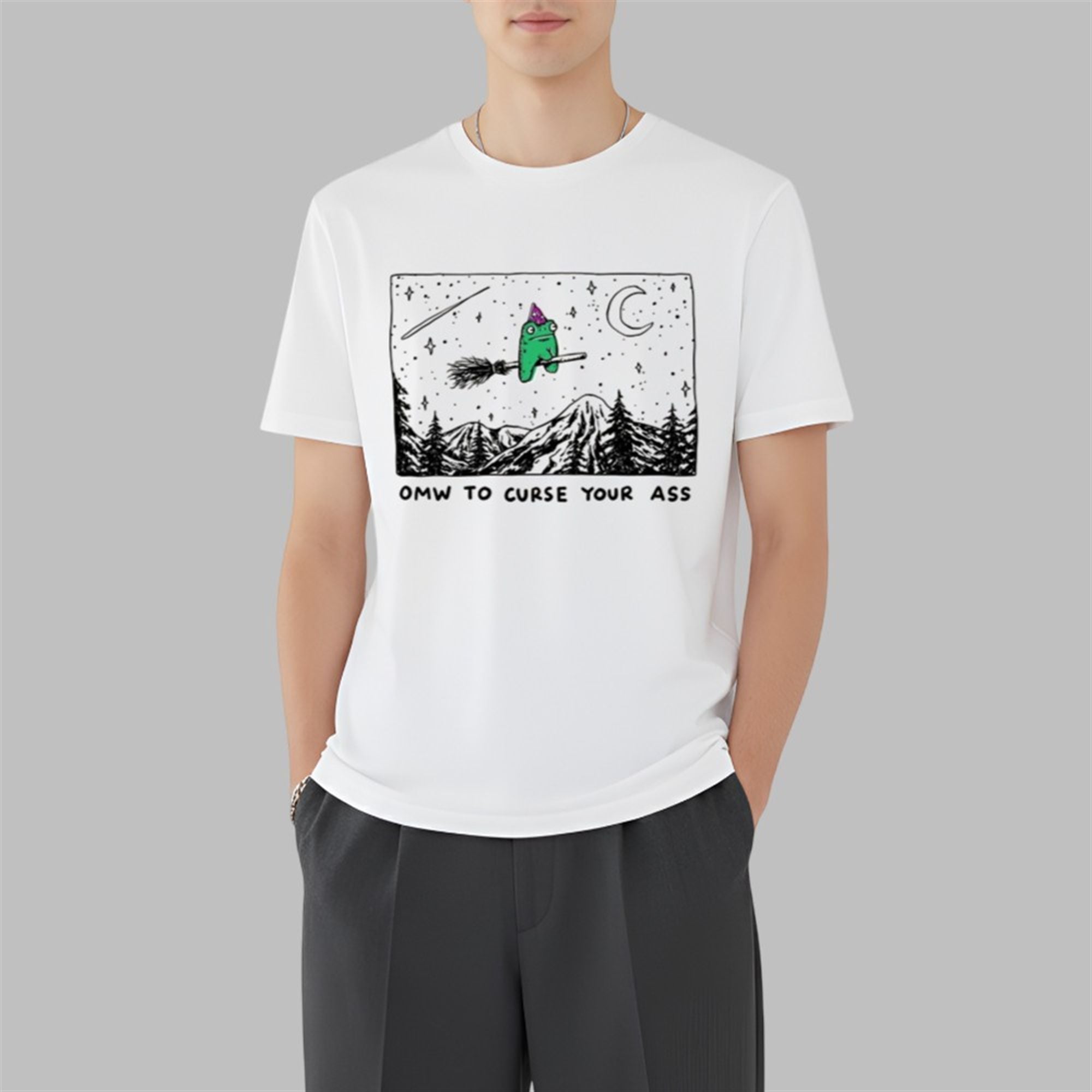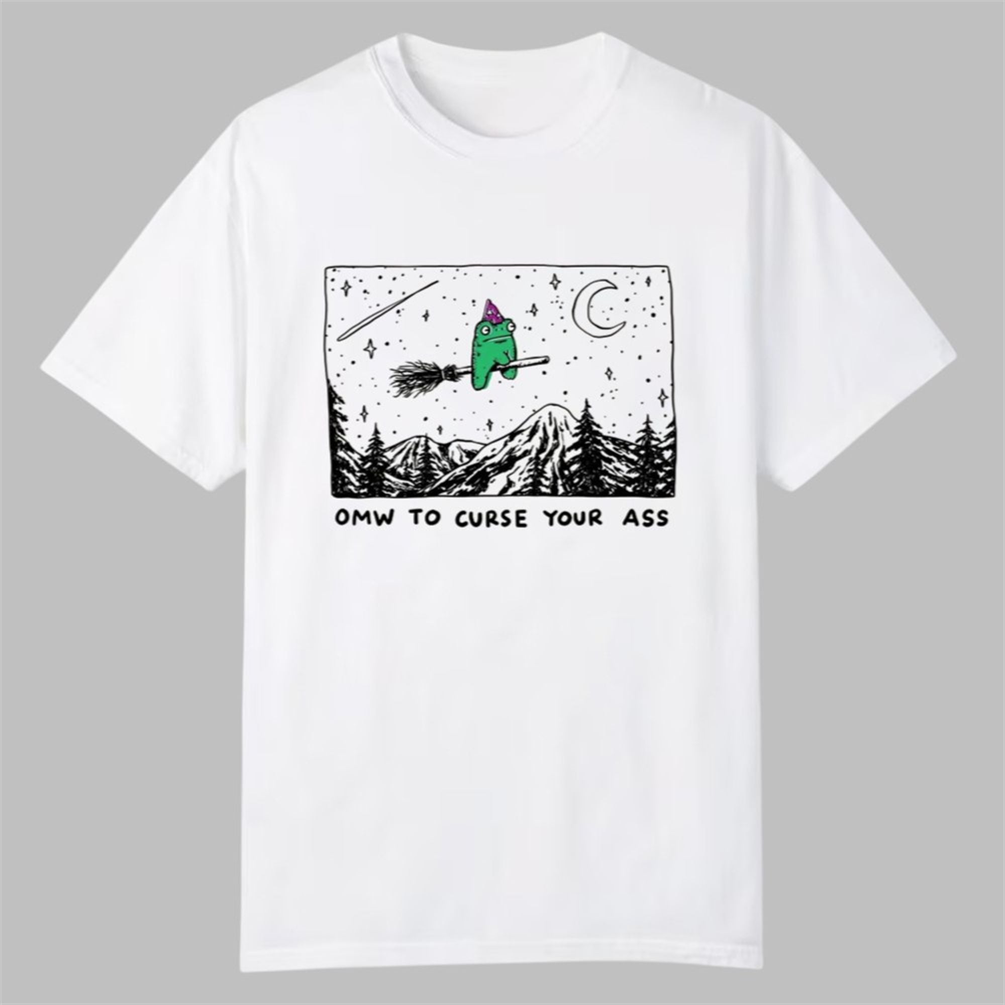 The design features a beautifully illustrated, slightly grumpy green frog donning a purple wizard’s hat. He is mounted on a classic twig broomstick, soaring over a detailed, black-and-white line art landscape of jagged mountains and pine trees. Above him, a crescent moon and shooting star illuminate the night sky. The text below—bold, hand-lettered, and unapologetic—reads “OMW TO CURSE YOUR ASS.”