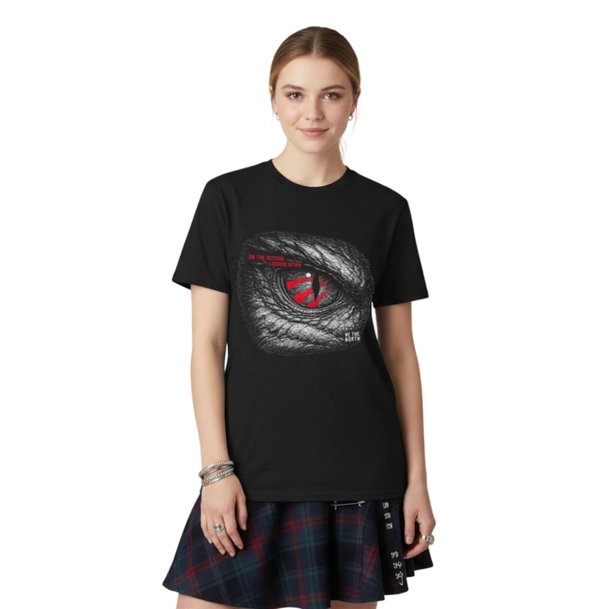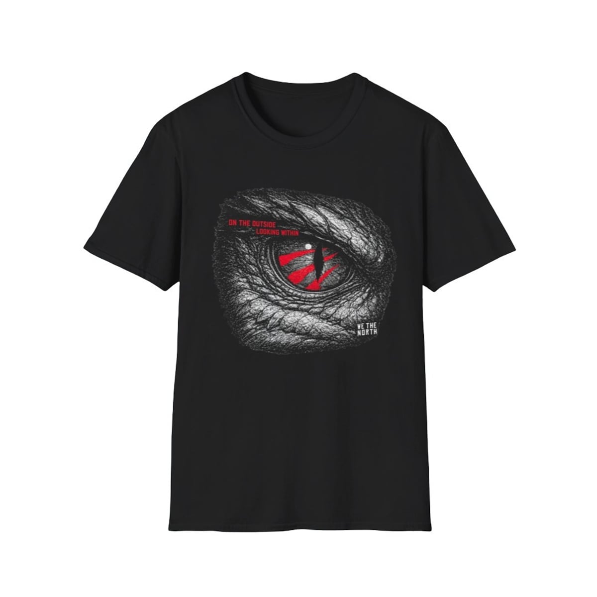 The shirt is a masterclass in aggressive, statement-making artistry. Set against a deep, dark canvas, the central graphic features a massively scaled, highly intricate illustration of a dinosaur or reptilian eye. The greyscale texturing of the thick, armored scales draws the viewer inward, only to be met by a piercing, vertical red pupil. Adding to the ferocious energy are vibrant red slash marks—reminiscent of brutal claw strikes—cutting directly across the eye. To the left, the cryptic phrase “ON THE OUTSIDE LOOKING WITHIN” is stamped in urgent red typography, while the iconic rallying cry “WE THE NORTH” sits subtly in stark white at the bottom right, anchoring the entire piece in a distinct cultural identity.