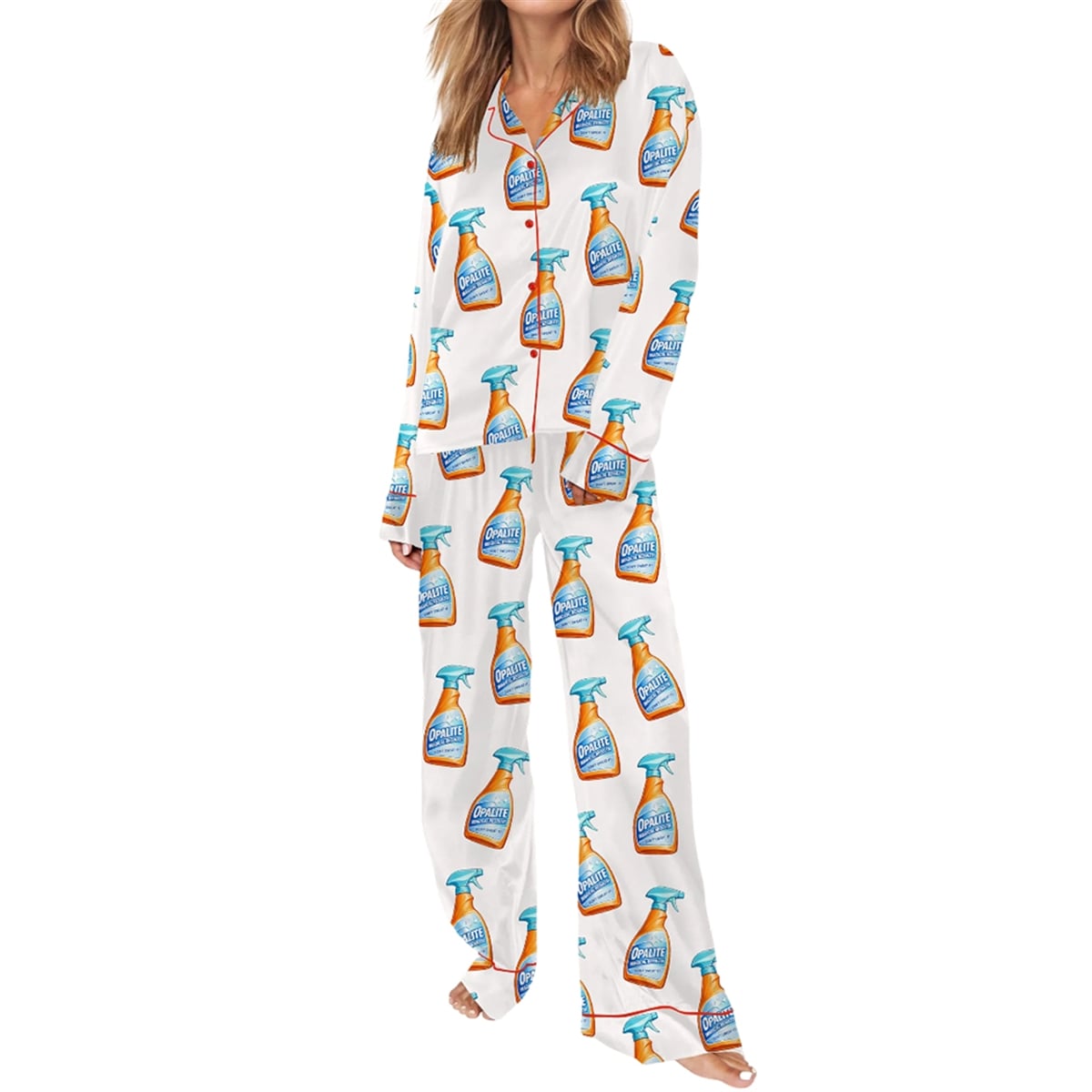 Looking for loungewear that matches your eccentric sense of humor? Meet the Opalite Spray Bottle Pajama Set, the internet’s current favorite piece of ironic apparel. Designed for those who refuse to take themselves too seriously, this matching two-piece set features a bold, repeating print of an everyday household cleaning essential.