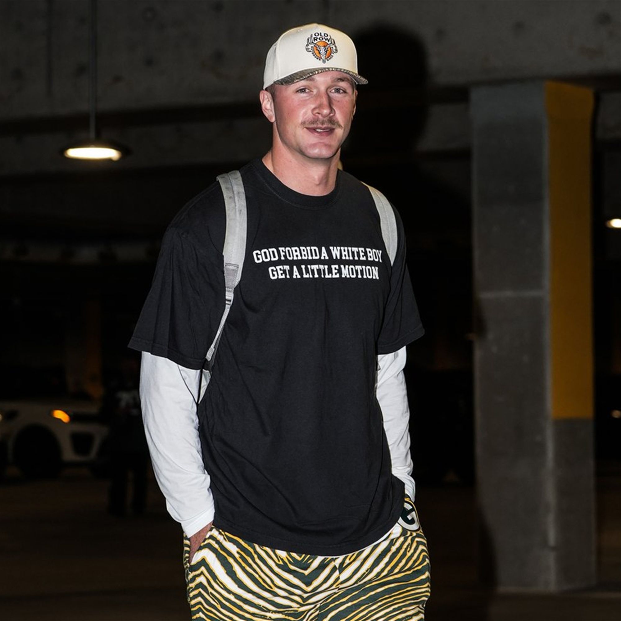 pgrade your game day wardrobe with a touch of internet culture and athletic confidence. The Packers Josh Whyle God Forbid A White Boy Get A Little Motion Shirt is more than just merchandise; it’s a mood. As seen on the Green Bay Packers’ rising star, this tee perfectly captures the intersection of sports, hustle culture, and viral memes.