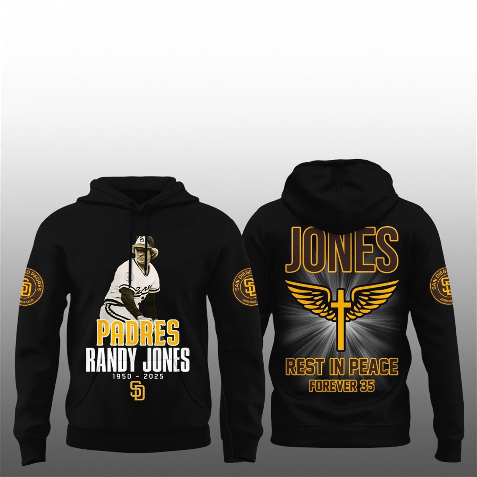 The front of the shirt showcases a vintage, high-contrast image of Randy Jones in his classic Padres uniform, mid-delivery, capturing the unique pitching style that baffled hitters for a decade. The text “Padres Randy Jones 1950 – 2025” anchors the design, marking the timeline of a life well-lived. On the back, a powerful memorial graphic displays his name, “JONES,” above a golden cross adorned with angel wings, symbolizing his peaceful rest. The phrase “Forever 35” sits boldly at the bottom, a nod to his retired jersey number that hangs proudly at Petco Park.