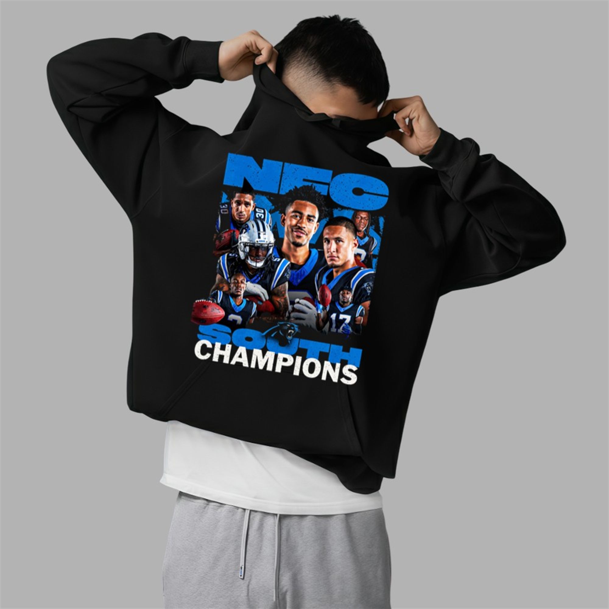 The road to the top of the NFC South wasn’t given; it was taken. This shirt encapsulates the defining narrative of the 2025 season: resilience. At the center of the design stands Bryce Young, the field general who silenced the critics, flanked by the explosive playmakers who defined this championship run.