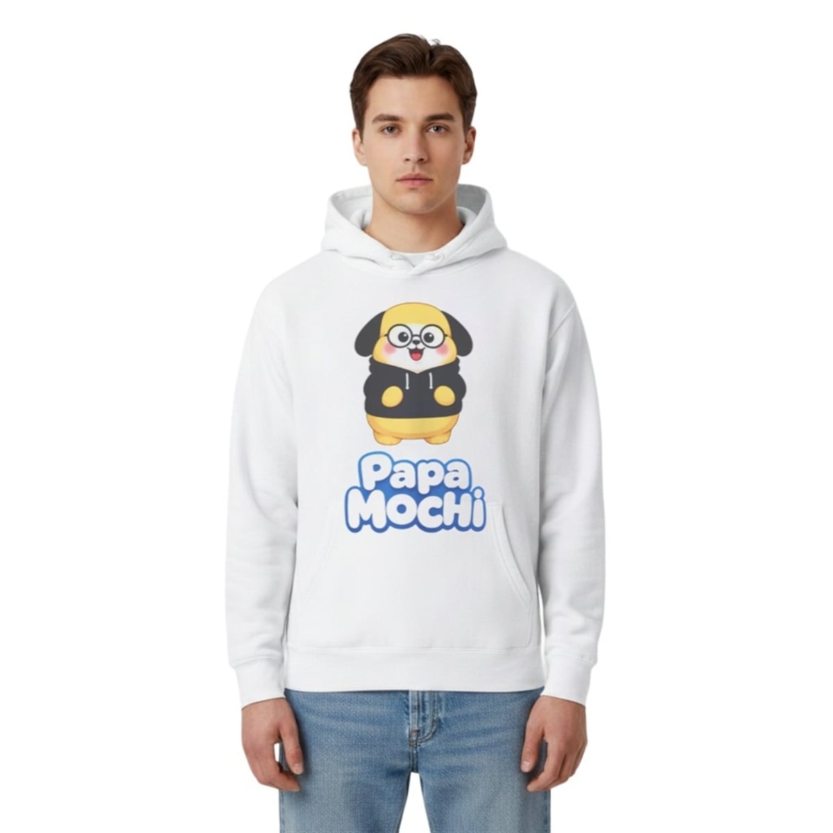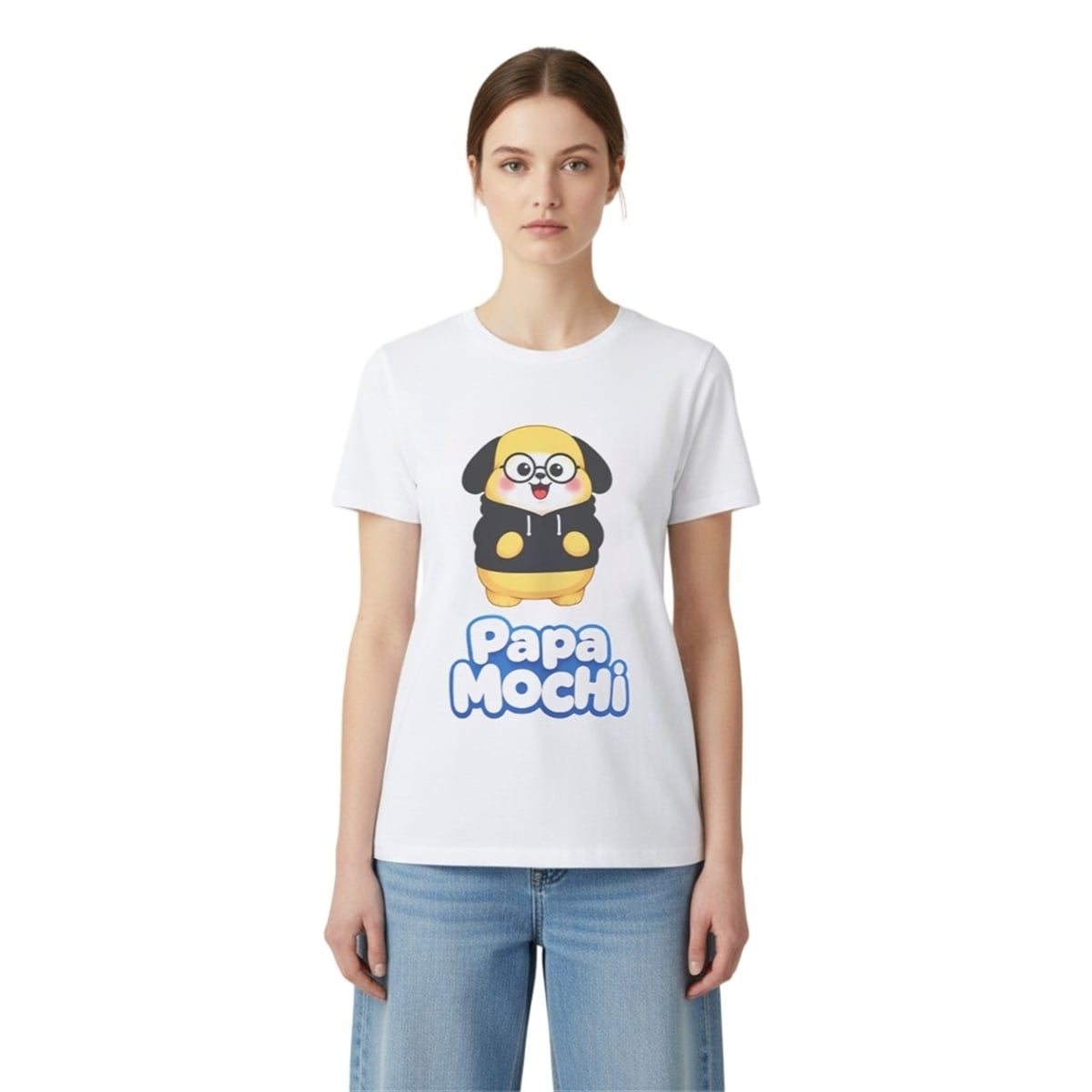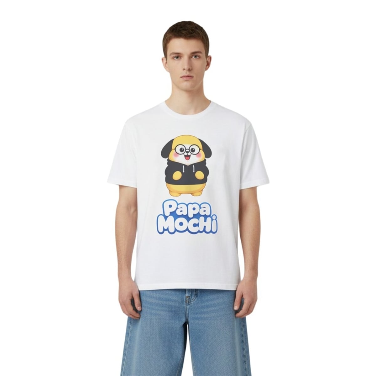 The shirt is far more than just a piece of casual wear; it is a wearable piece of internet and music history. The design features a vibrant, eye-catching illustration of a beloved dog-like mascot, affectionately recognized by millions, styled playfully in a black hoodie and round spectacles. Situated directly beneath this cheerful character is the phrase “Papa MOCHi” rendered in bright, bubbly blue typography. Visually, the contrast of the bold graphics against a crisp white background ensures the design pops perfectly in photos, videos, and crowded stadium arenas. It serves as a visual inside joke, a badge of honor, and a beacon of positivity for anyone who understands its rich pop-culture context.