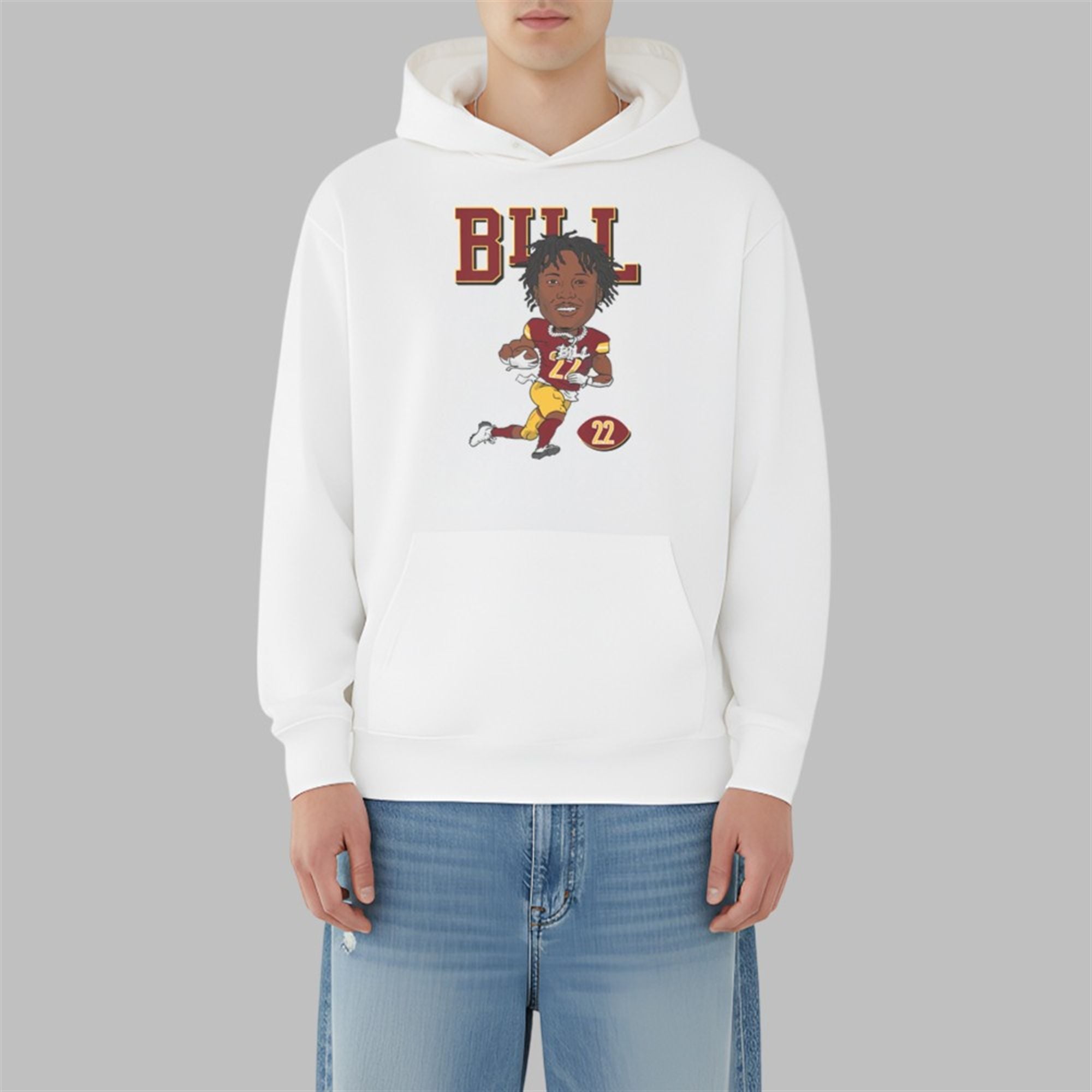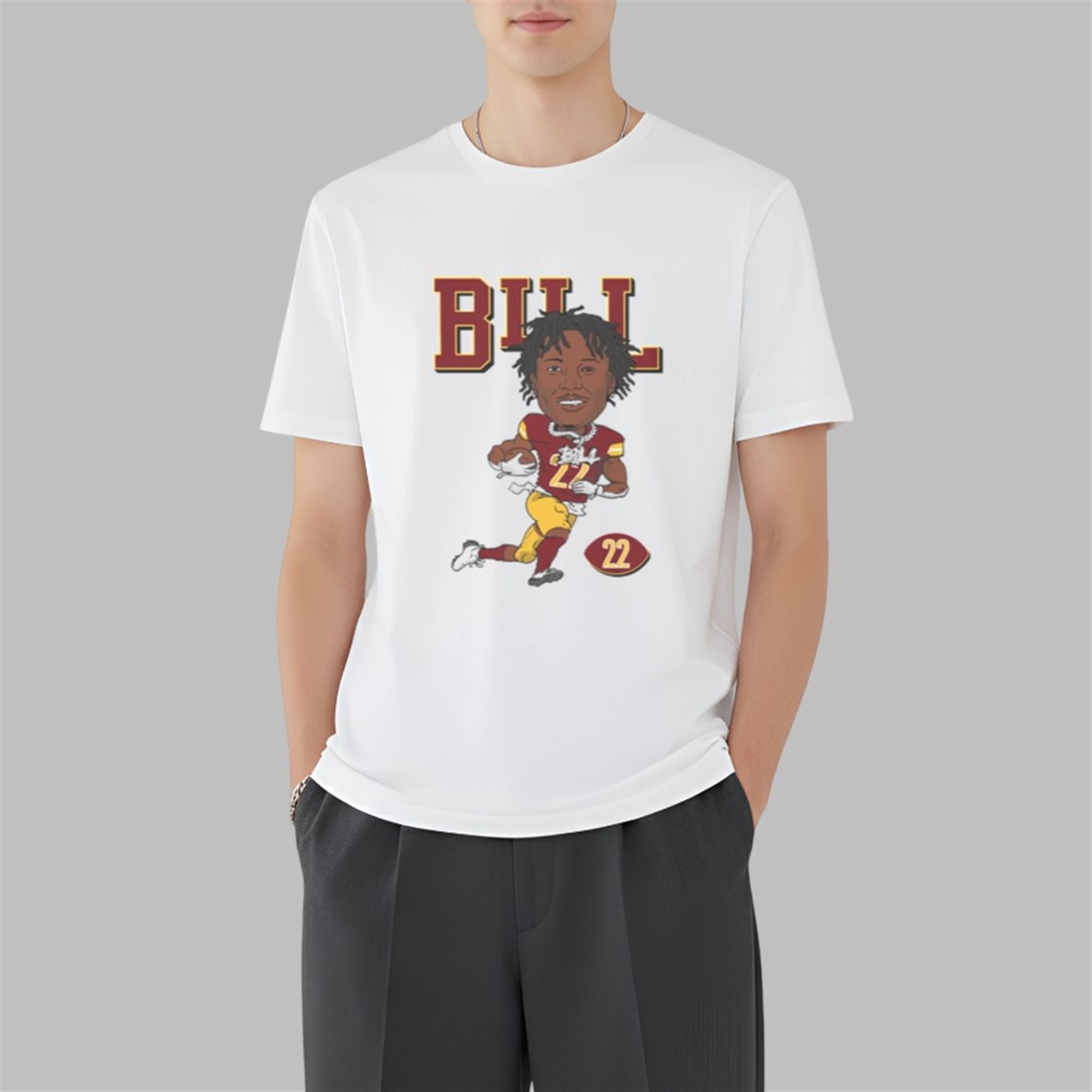 The shirt is a masterclass in modern sports culture, blending viral internet humor with genuine player support. At the center of the design is a high-quality, cartoon caricature of Jacory Croskey-Merritt, donning the Washington #22 uniform. He is depicted in mid-stride, securing the football with the determination of a true grinder, set against a bold, block-letter “BILL” backdrop.