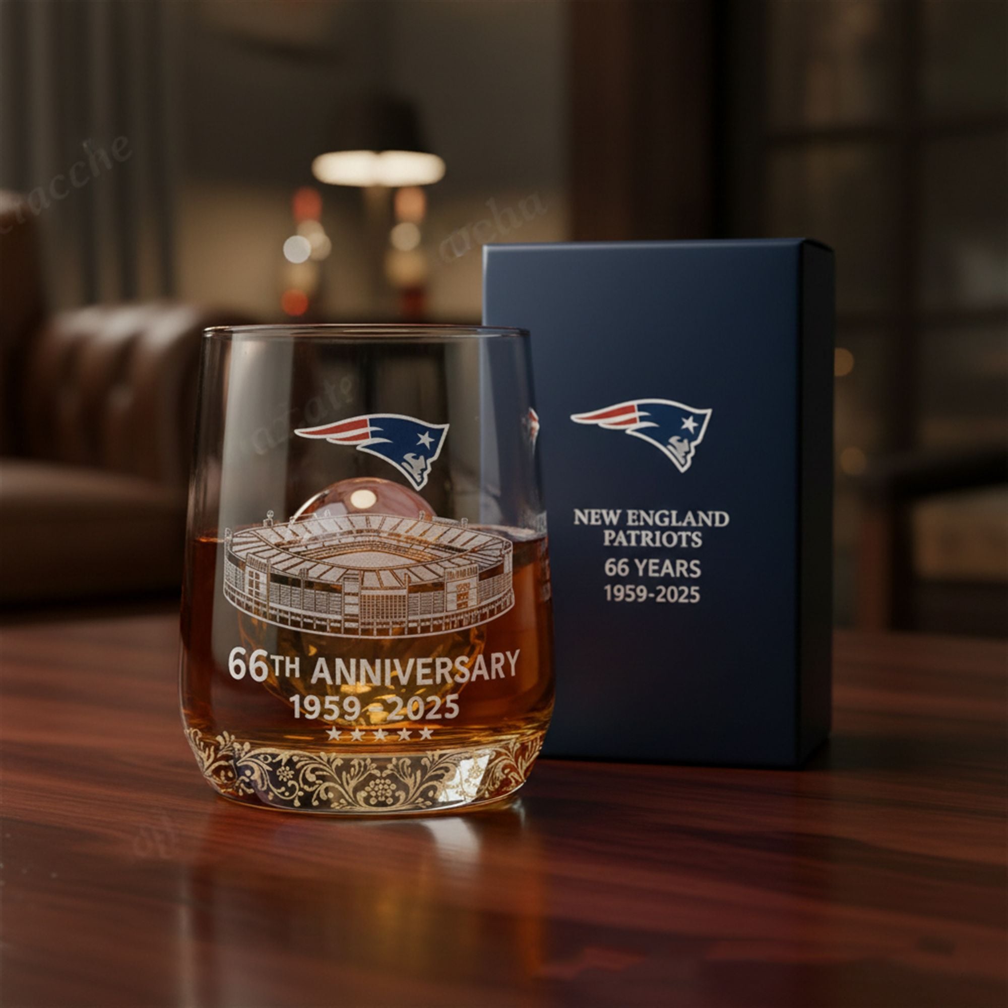 The centerpiece of the glass features a stunning, wrap-around depiction of the team’s home ground, Gillette Stadium. This visual anchor transports the owner straight to the 50-yard line, evoking memories of snow-covered playoff games, legendary comebacks, and the roar of the crowd. Above the stadium, the iconic “Flying Elvis” logo stands guard, while the base is wrapped in elaborate gold filigree, symbolizing the “Gold Standard” the franchise has set for the league. The text “66TH ANNIVERSARY” is bold and commanding, ensuring that the significance of the item is clear from across the room.