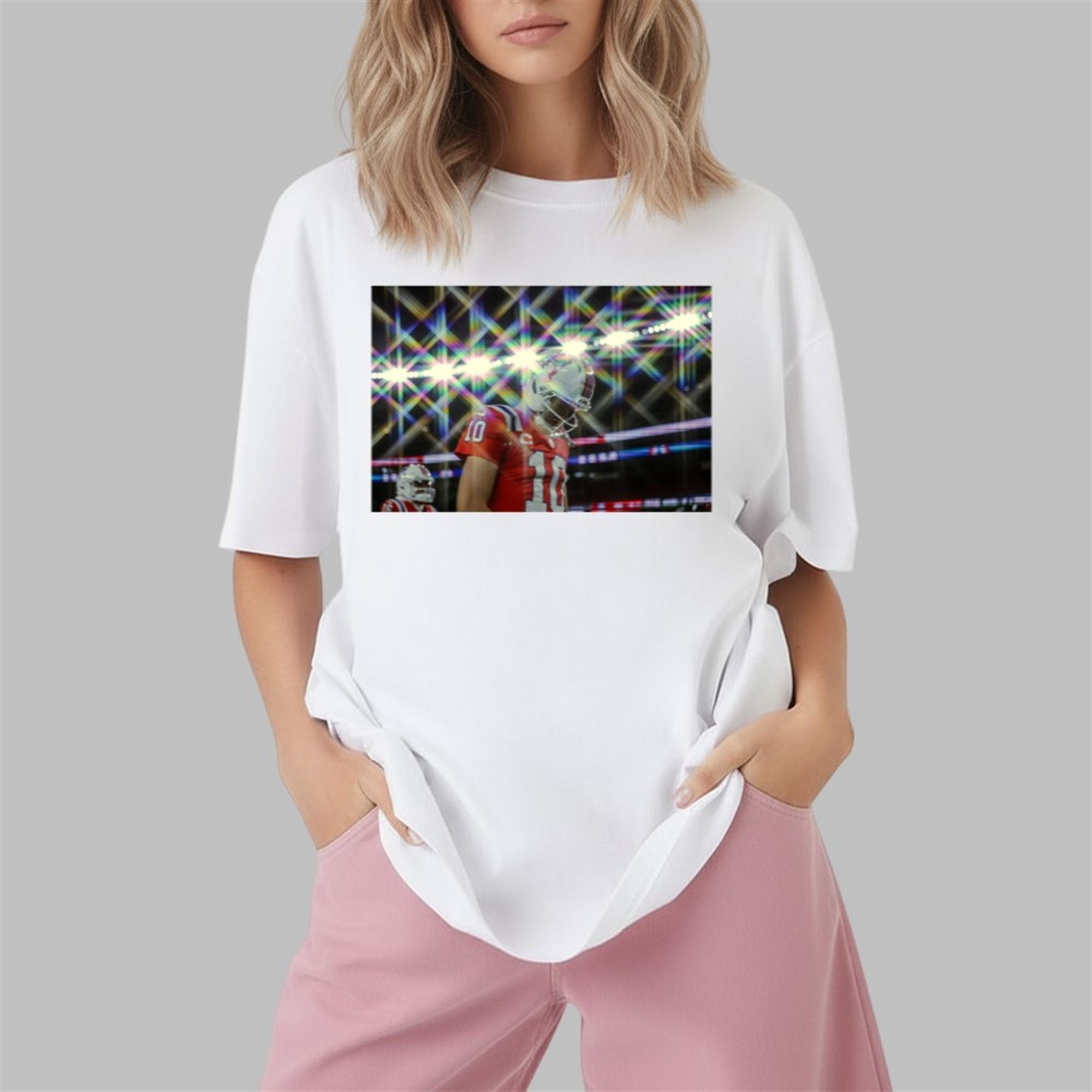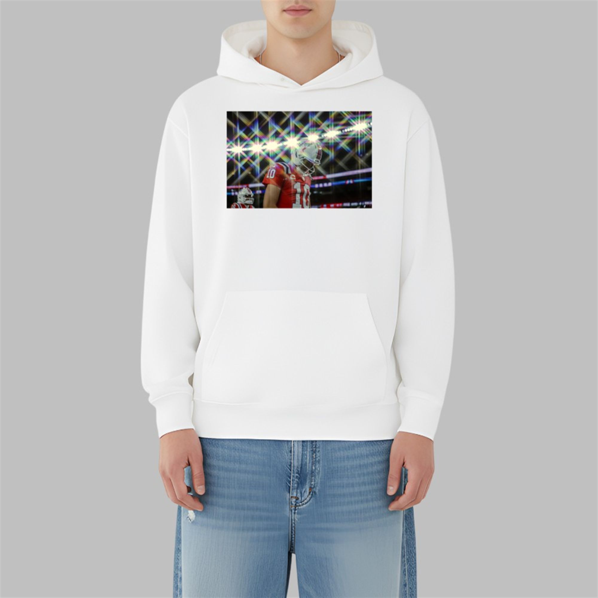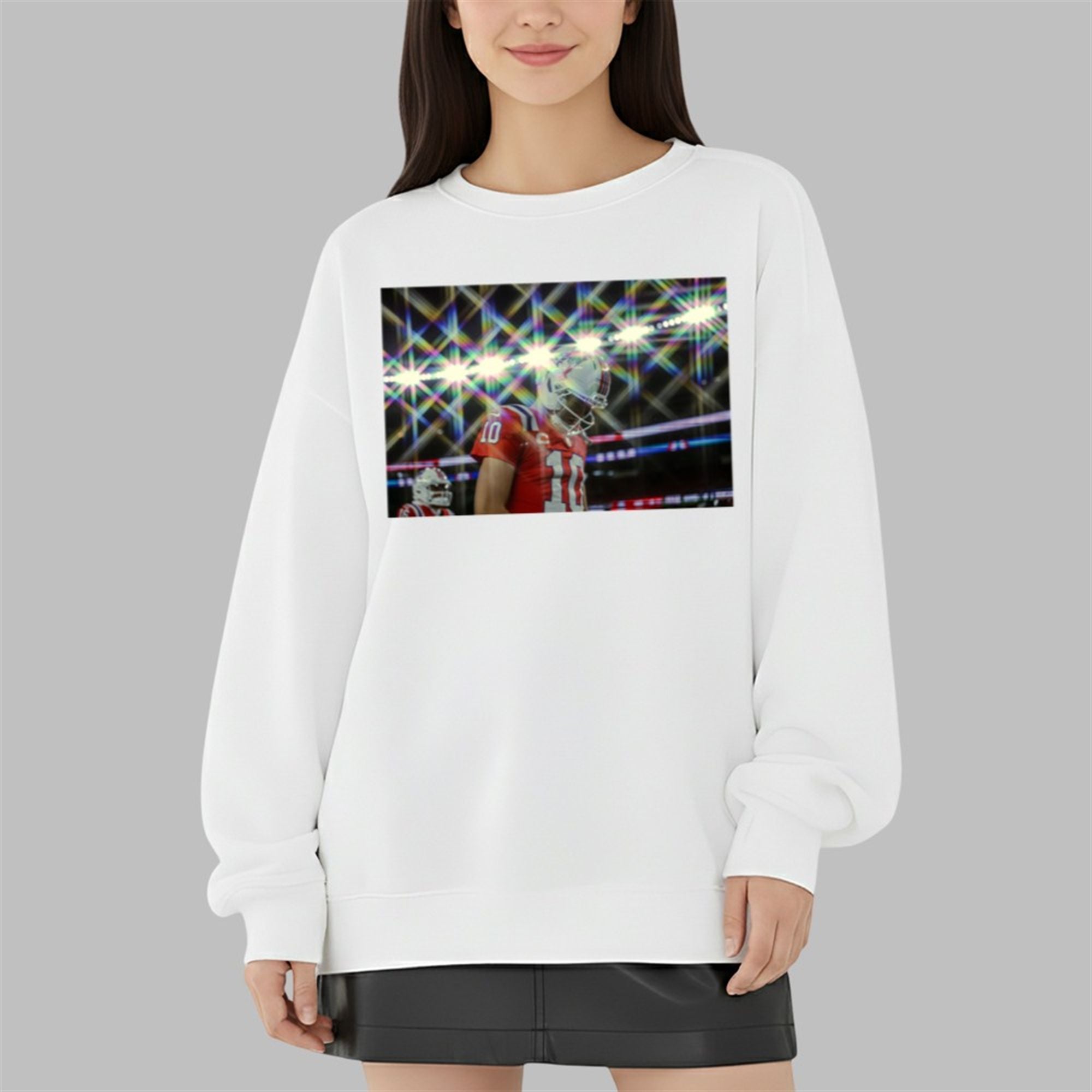 The centerpiece of the shirt is a high-resolution, stylized edit of Drake Maye wearing the fan-favorite red “Pat Patriot” throwback jersey. The image is treated with a viral “star filter” effect—a visual hallmark of the “aura” trend popular on Instagram and TikTok—which adds a shimmering, heavenly glow around the quarterback. This aesthetic represents high “aura points,” signifying a player who has an undeniable cool factor and calm dominance under pressure.