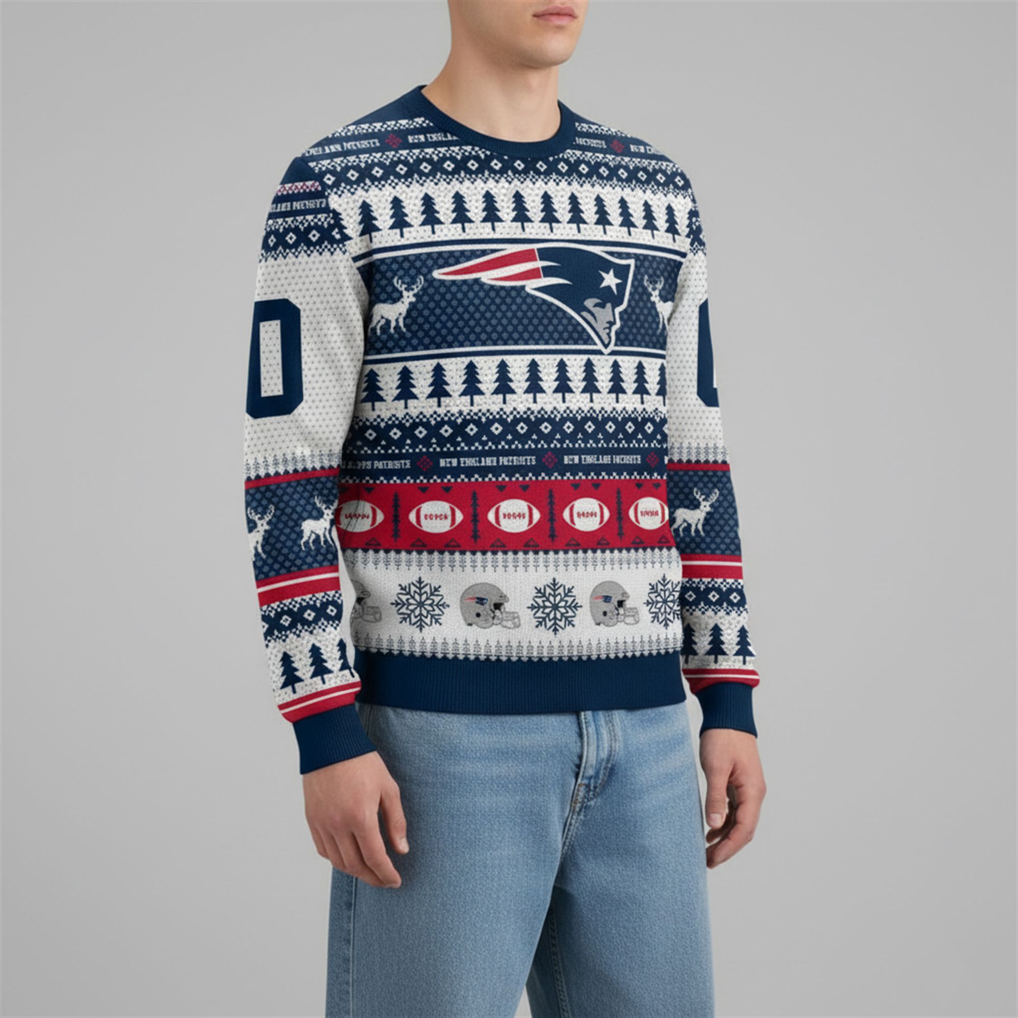 The 2025 holiday season calls for attire that stands out, and this dweater delivers on every front. The design is a masterclass in “ugly sweater” aesthetics, blending chaotic charm with sleek team branding. The front features the iconic Patriots logo centered prominently against a backdrop of navy and white festive patterns.
