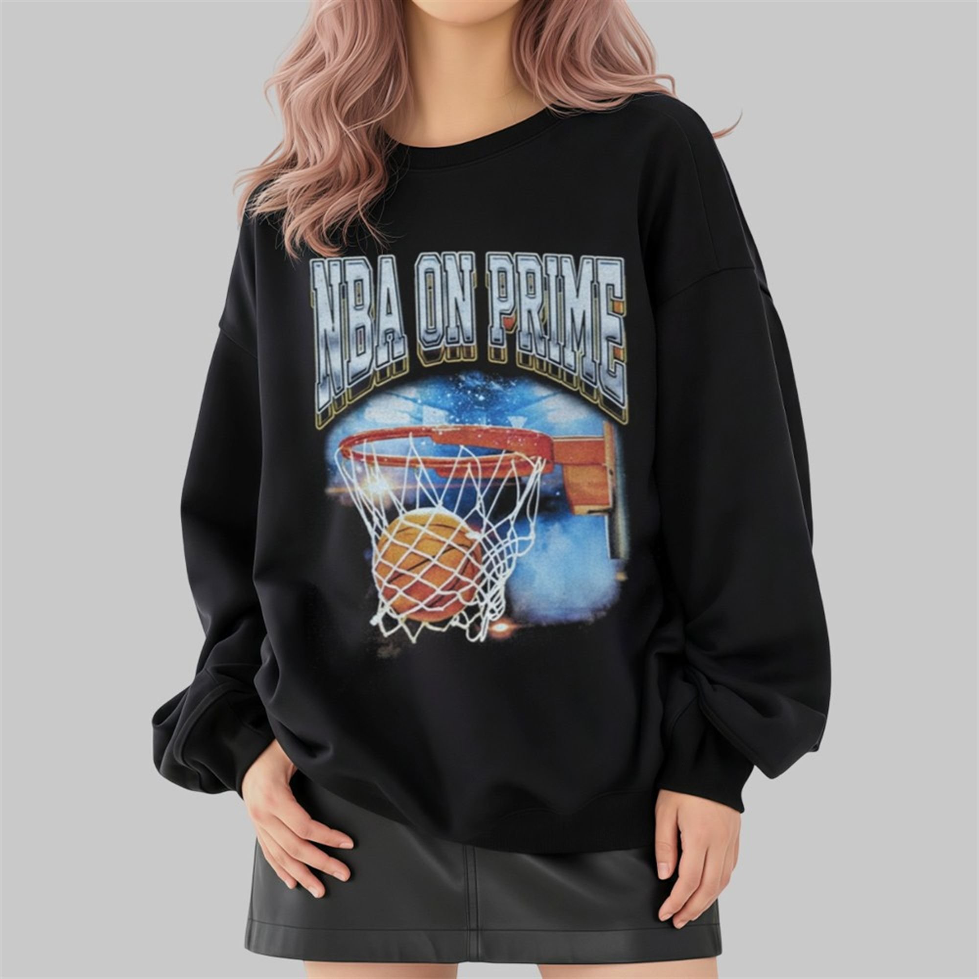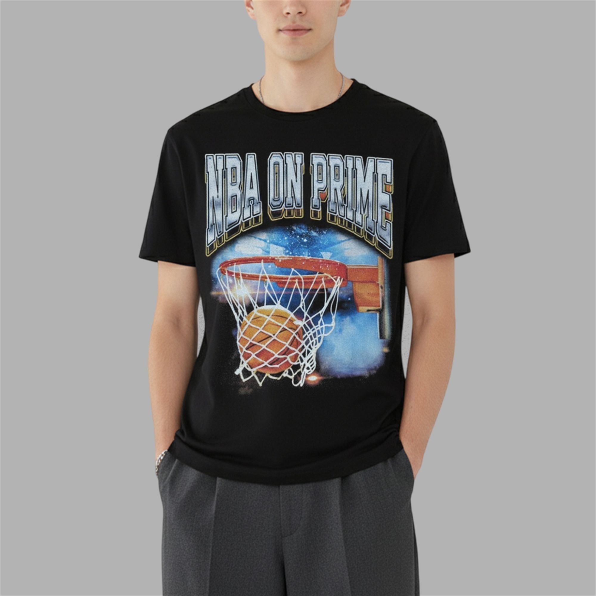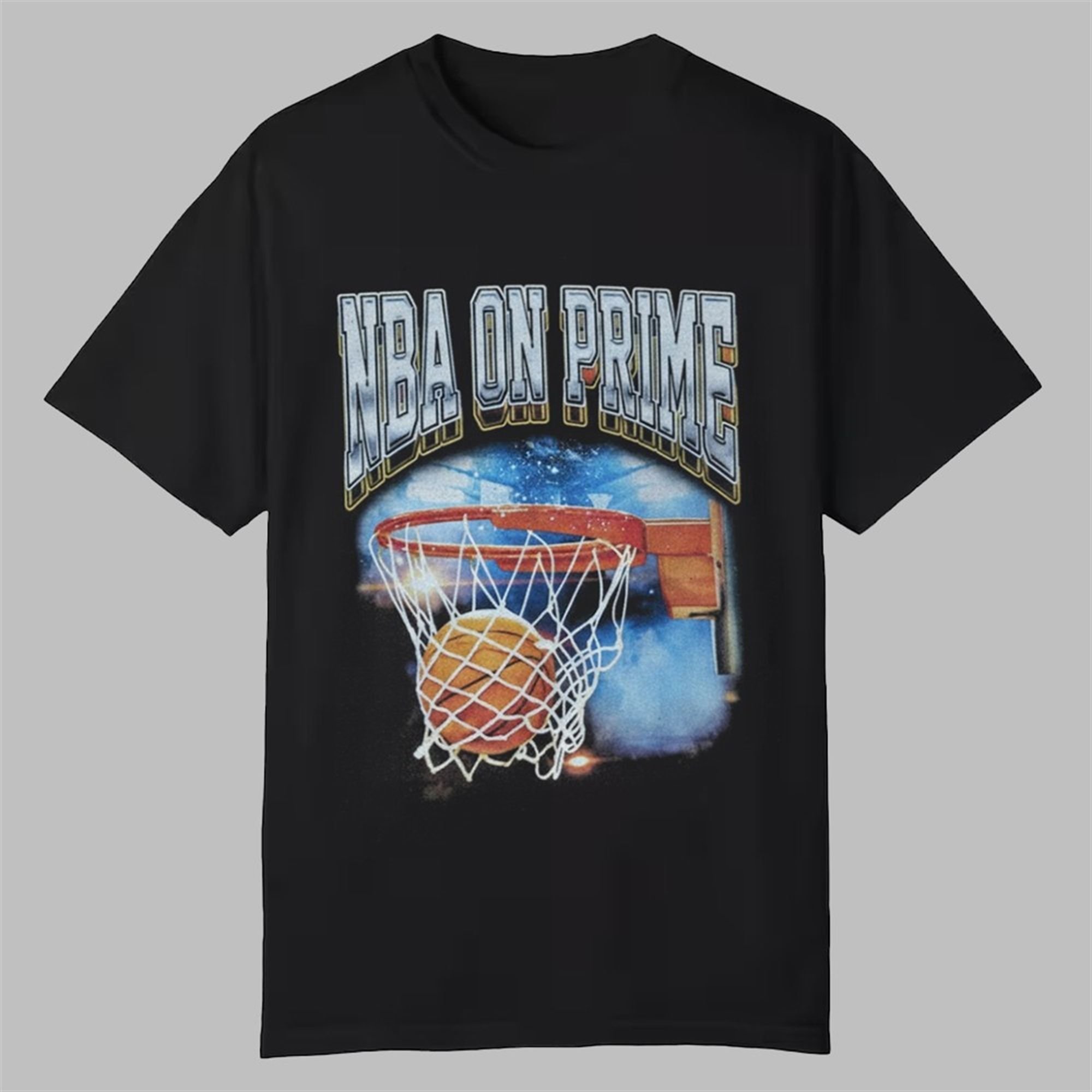 The shirt features the bold, metallic-style text “NBA ON PRIME” arched over a high-action image of a basketball swishing through the net, complete with retro-style motion blurs and a stylized cosmic background. This design is a direct nod to the iconic, oversized graphics that defined 90s and early 2000s streetwear, a look that has made a massive comeback.