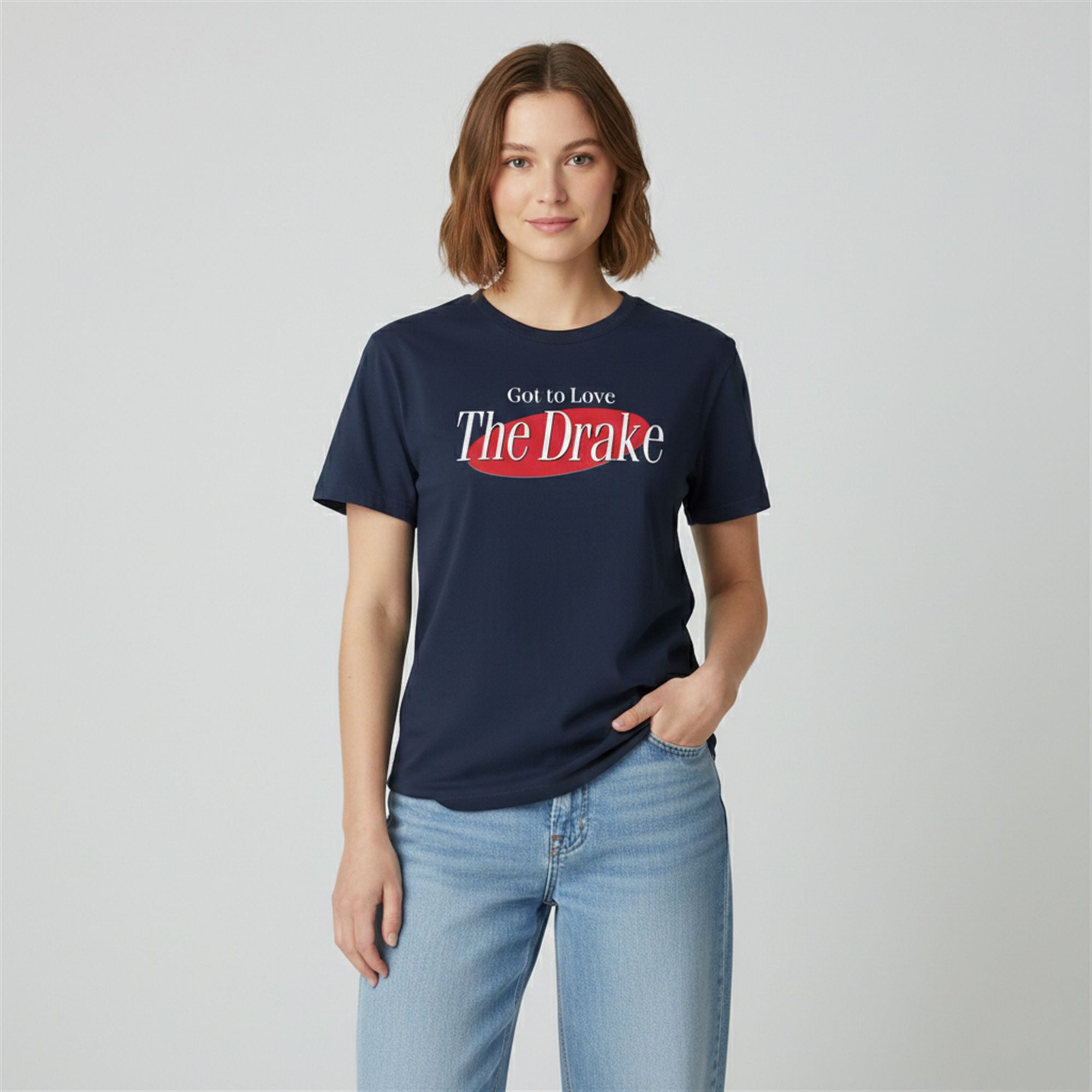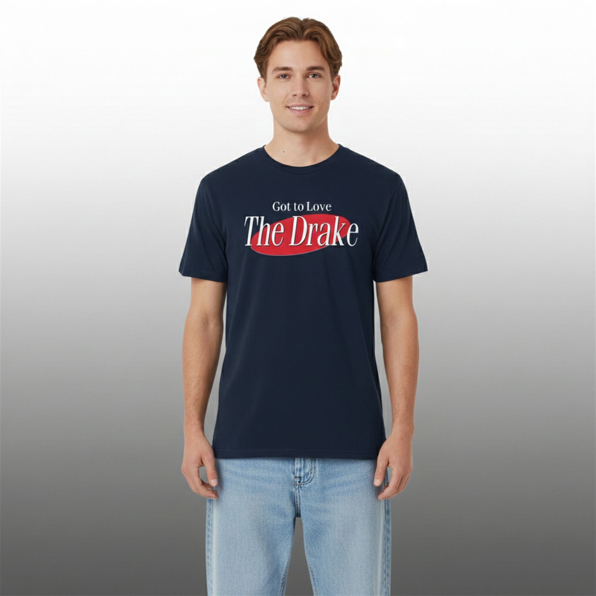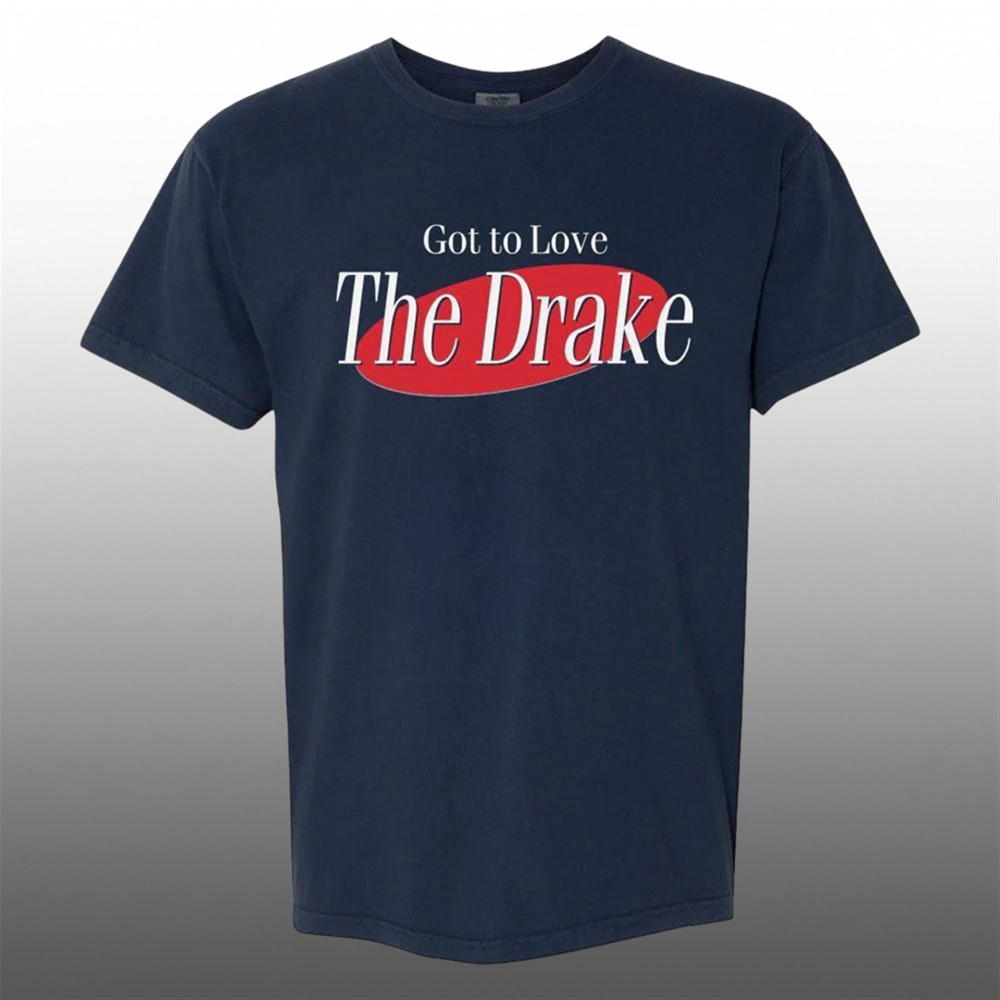 The shirt is a humorous and stylish tribute to New England’s franchise quarterback, Drake Maye, designed through the lens of iconic pop culture. Visually, the shirt features the instantly recognizable oval logo style associated with the legendary sitcom Seinfeld, replacing the show’s title with the enthusiastic phrase, “Got to Love The Drake.”