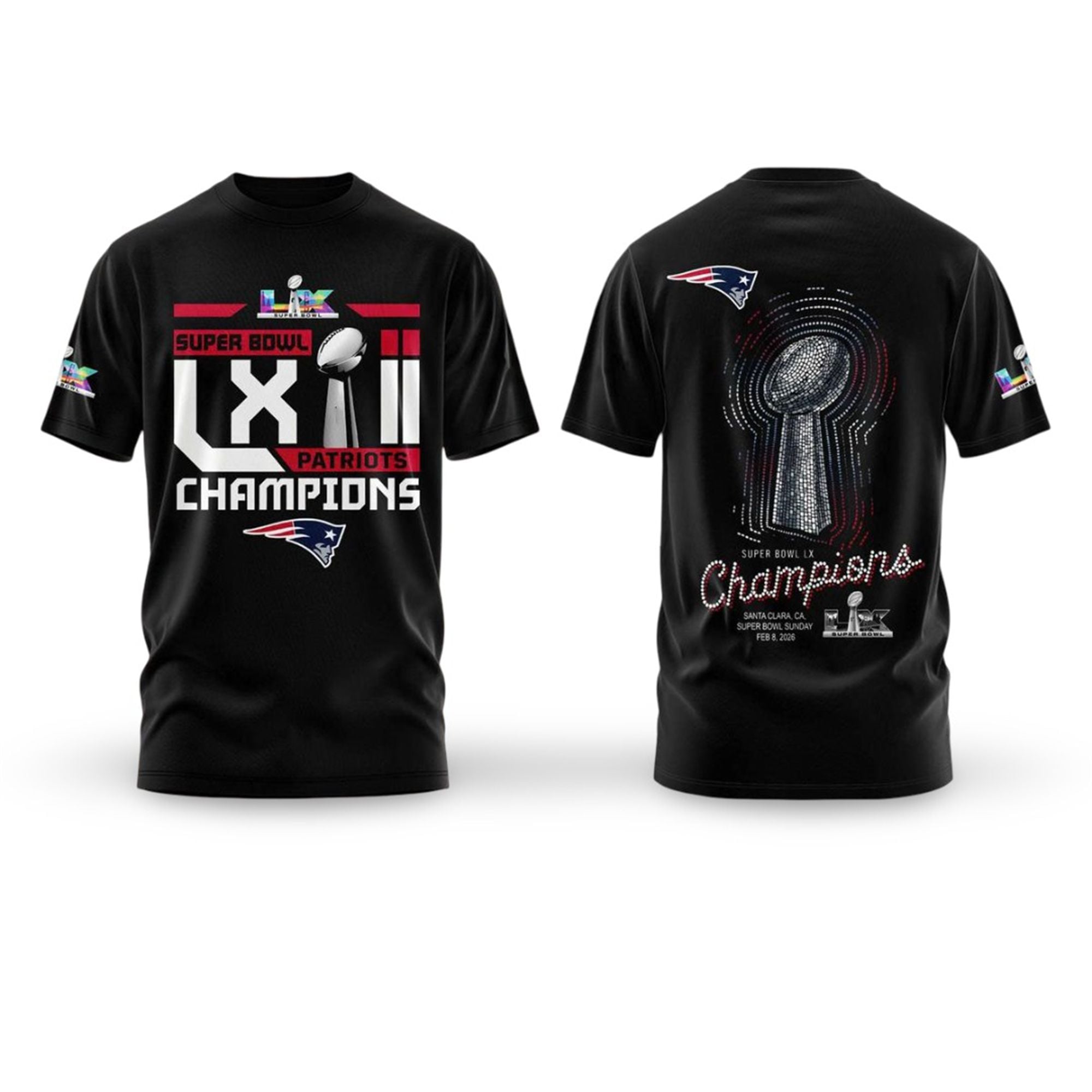 Dual-Sided Victory Graphics: The front showcases the aggressive “LX” Super Bowl logo intertwined with the Patriots‘ wordmark, while the back features a massive, detailed illustration of the Vince Lombardi Trophy.