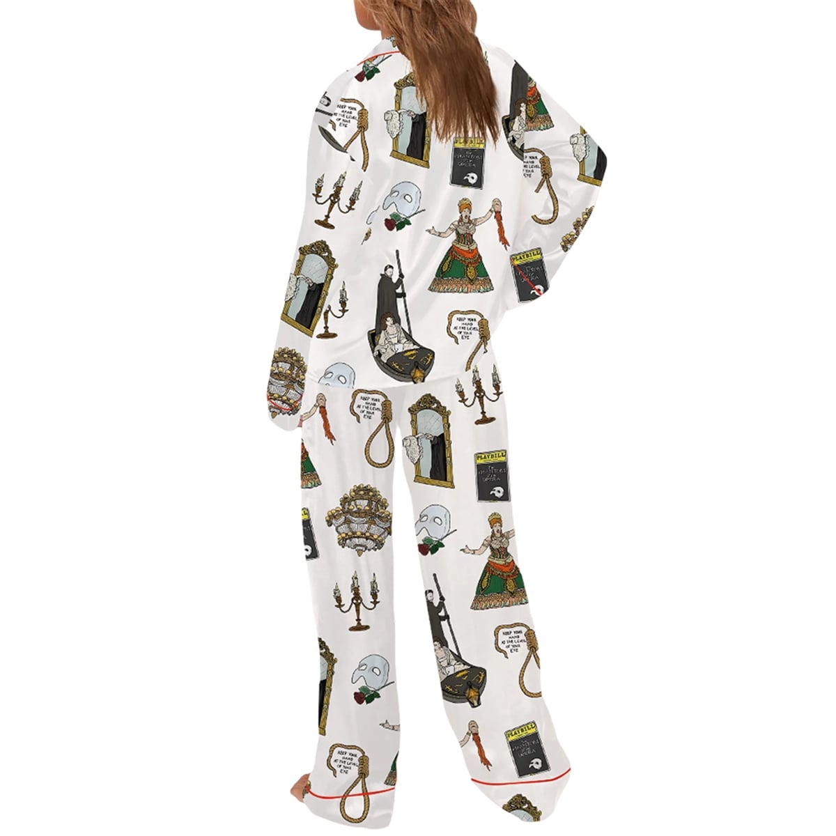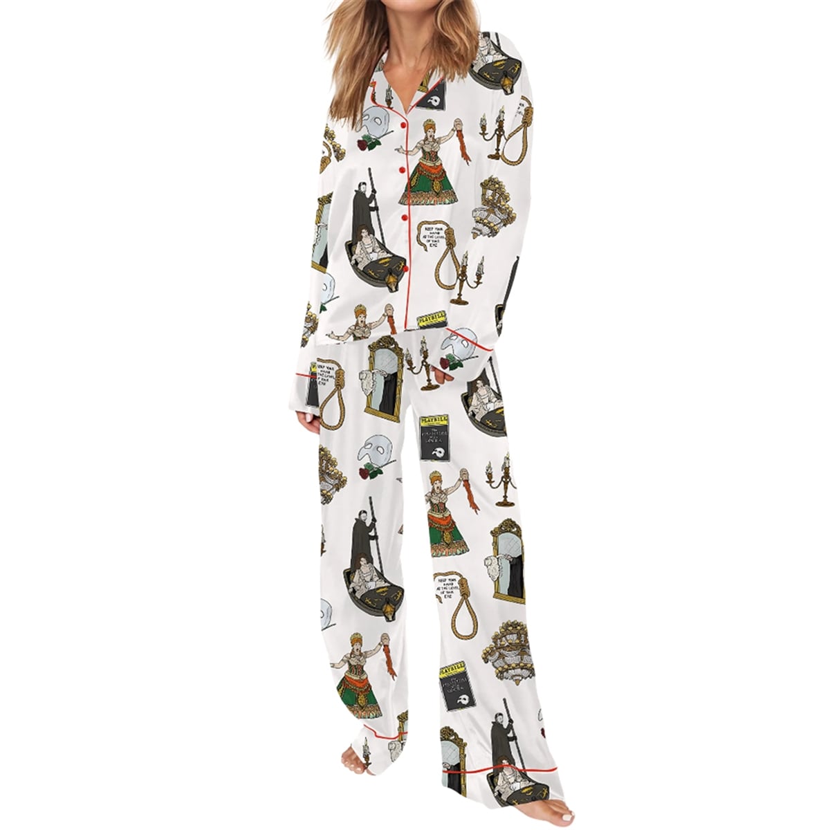 This striking two-piece pajama set is a visual love letter to the iconic musical. Set against a crisp white background with bold red piping details along the collar and button placket, the design functions as a wearable collage of the show’s most unforgettable moments. The intricate, all-over print features a gallery of instantly recognizable motifs: the Phantom and Christine navigating the subterranean lake in their candlelit gondola, the legendary half-mask resting beside a single red rose, and the majestic, illuminating chandelier. Additionally, eagle-eyed fans will appreciate deeper cuts from the lore, including the classic yellow Broadway Playbill, the ominous Punjabi lasso accompanied by the warning “Keep your hand at the level of your eyes,” the magical mirror, and detailed character portraits.