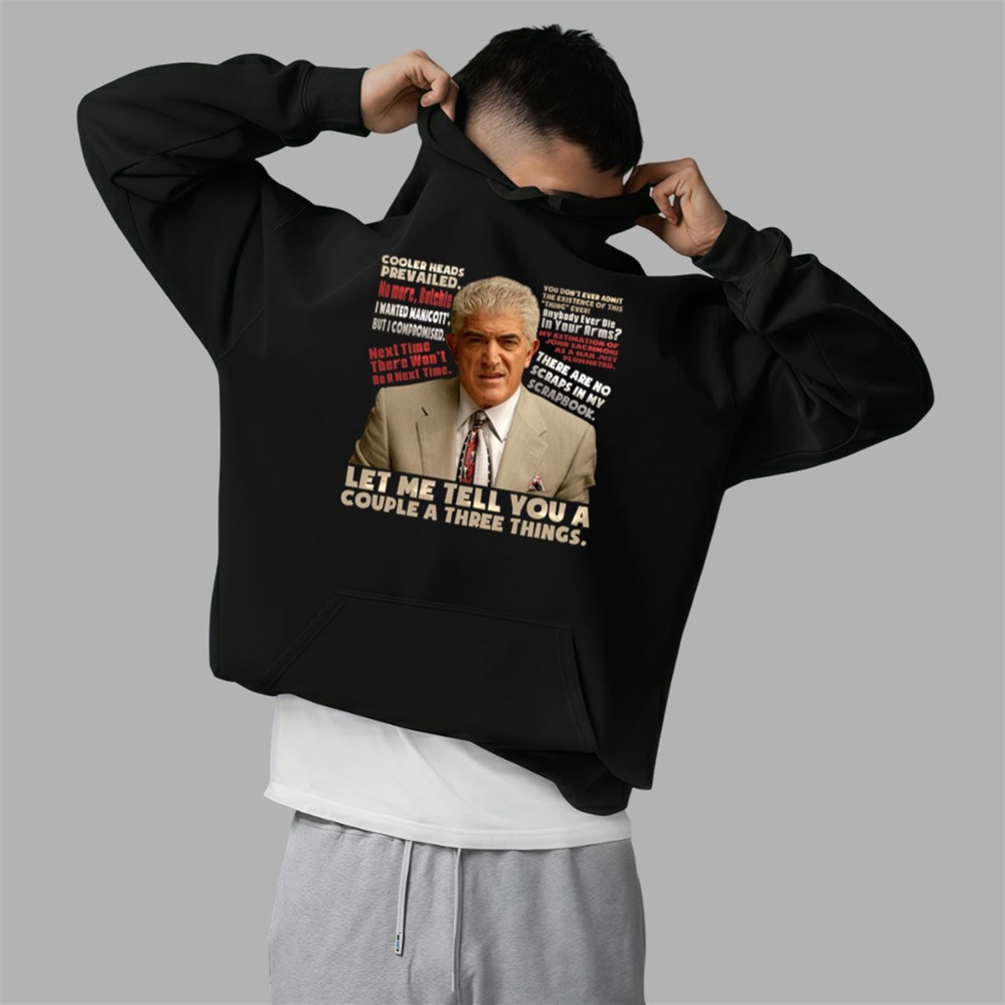 The design anchors on the famous misspoken phrase, “Let Me Tell You A Couple A Three Things,” but the details go much deeper. It features the legendary “compromise” rant references (“I wanted manicott’“), his cold dismissal of “Butchie,” and his strict adherence to Omertà. This isn’t just a shirt; it’s a wearable encyclopedia of the Lupertazzi vs. DiMeo war.