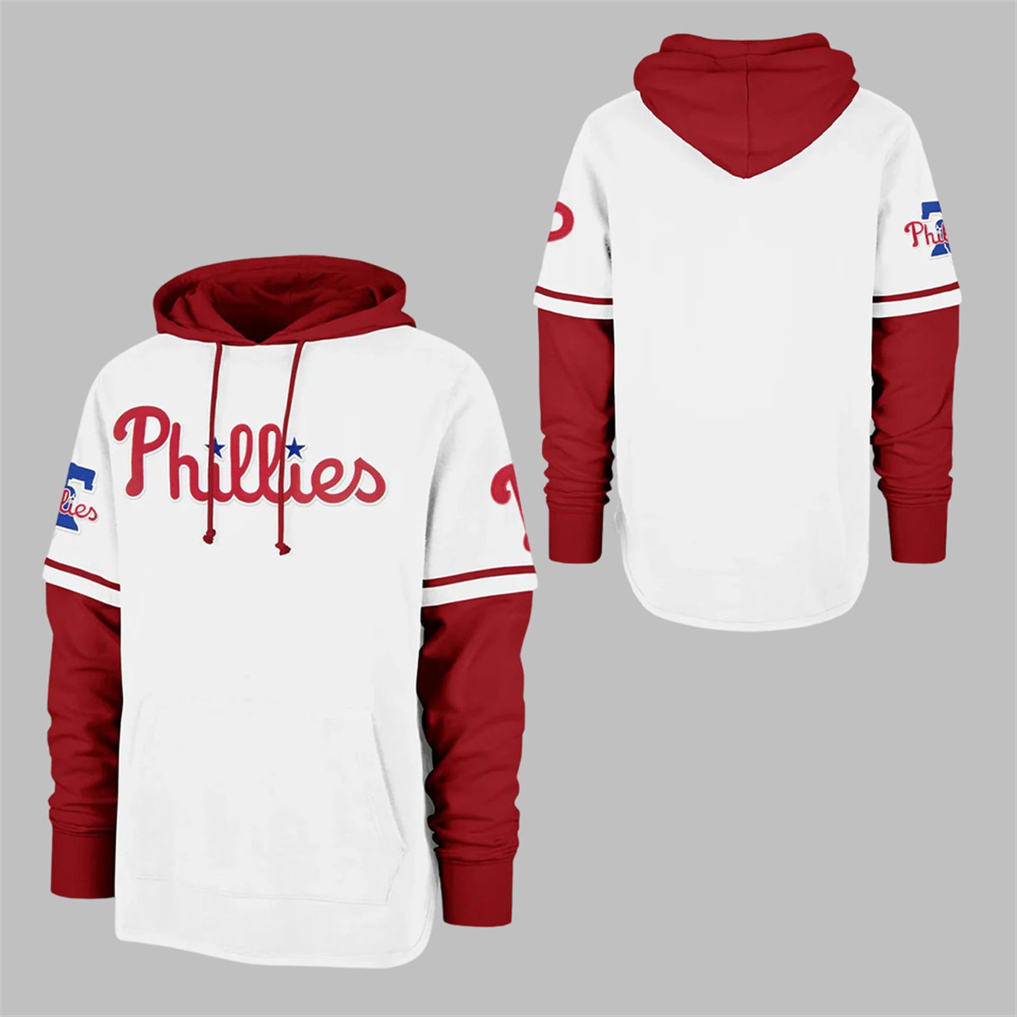 This hoodie is engineered for the spotlight. It masterfully combines the classic aesthetic of a Phillies baseball jersey with the cozy comfort of a premium hoodie, creating a stylish layered look without the bulk. The crisp white torso serves as the perfect canvas for the iconic, retro-style “Phillies” script emblazoned across the chest in vibrant red, complete with the signature star dotting the “i”. The deep red, double-lined hood and matching sleeves provide a striking contrast, while authentic-looking sleeve patches add a touch of on-field legitimacy to this off-the-wall concept. It’s the perfect apparel for making a scene—in the best way possible.