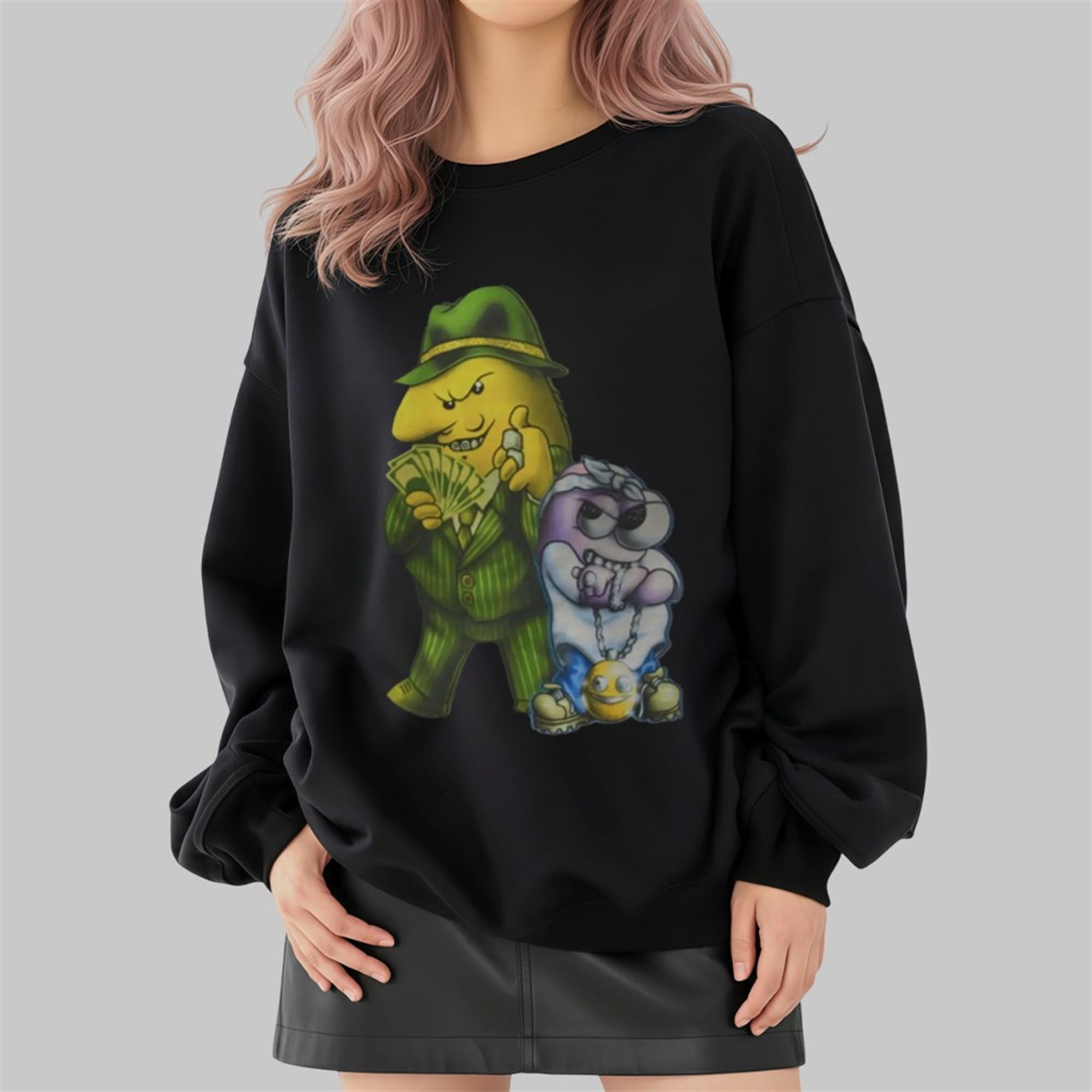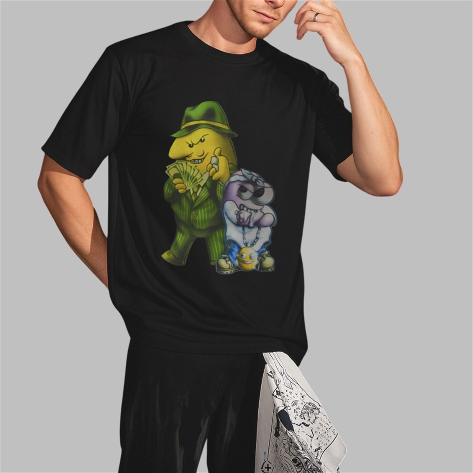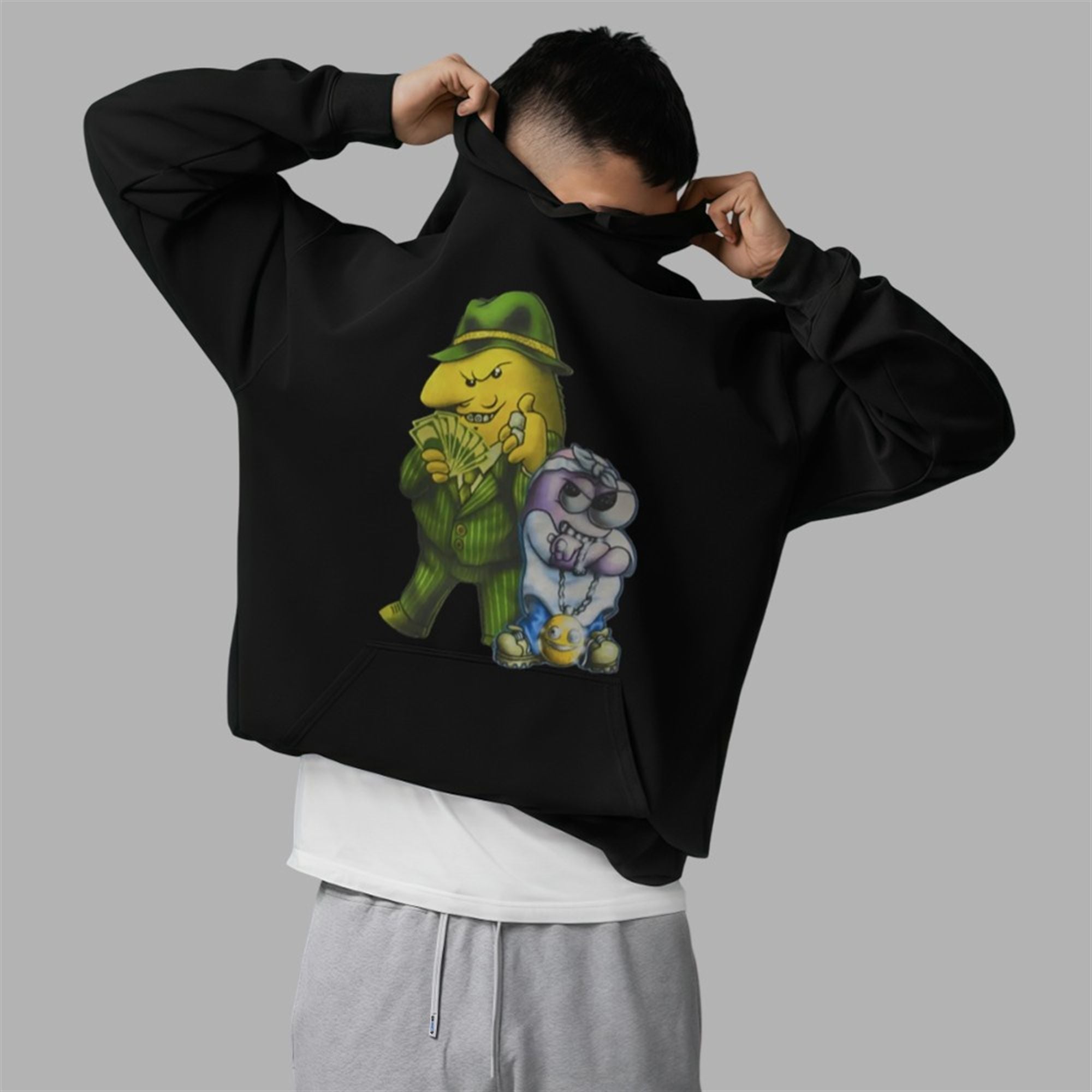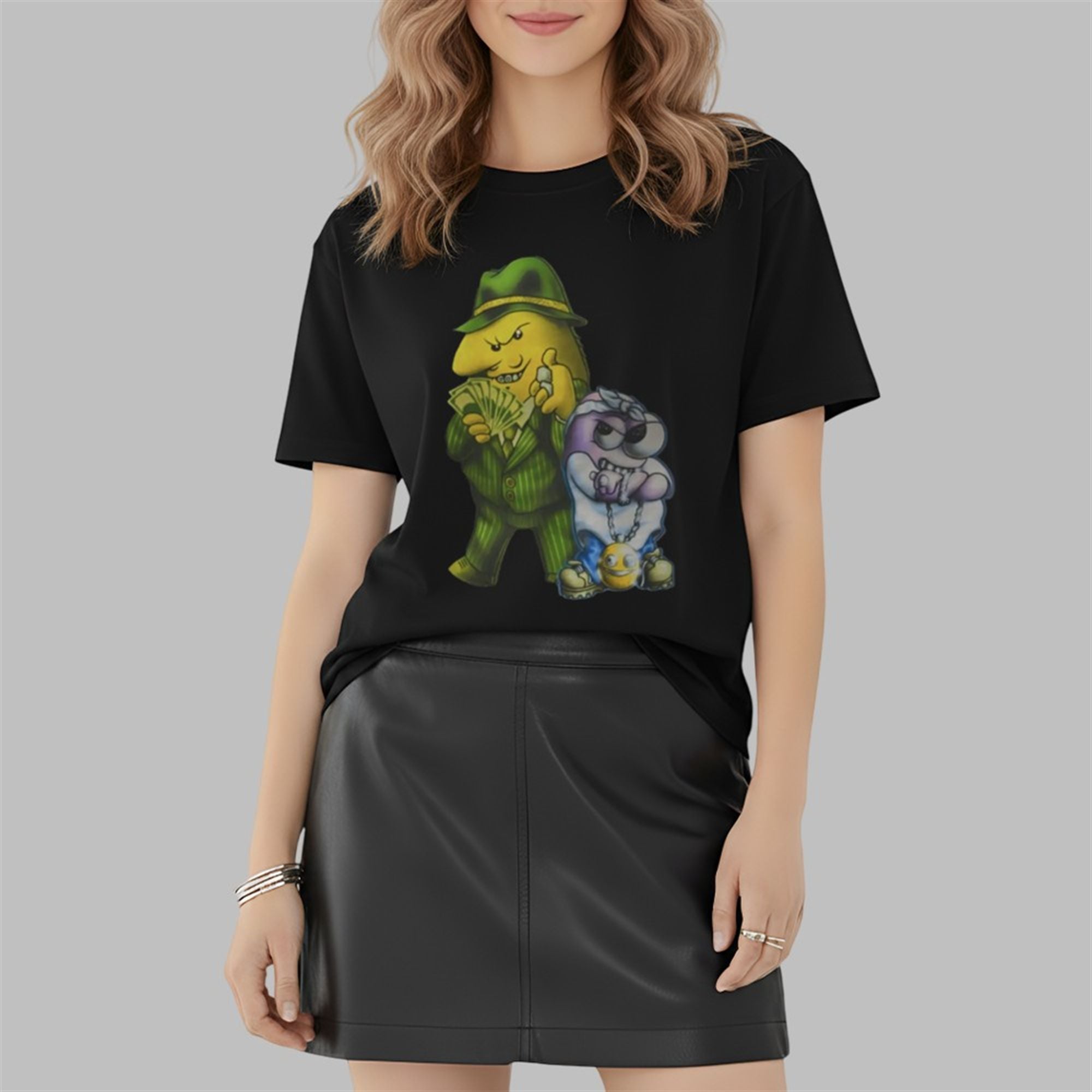 Step into the world of ironic fashion with the shirt, a bold and hilarious piece of apparel that flips the script on the show’s wholesome premise. This shirt features an exclusive, high-definition graphic of Pim Pimling and Charlie Dompler trading their usual Smiling Friends uniforms for exaggerated “hustler” attire.