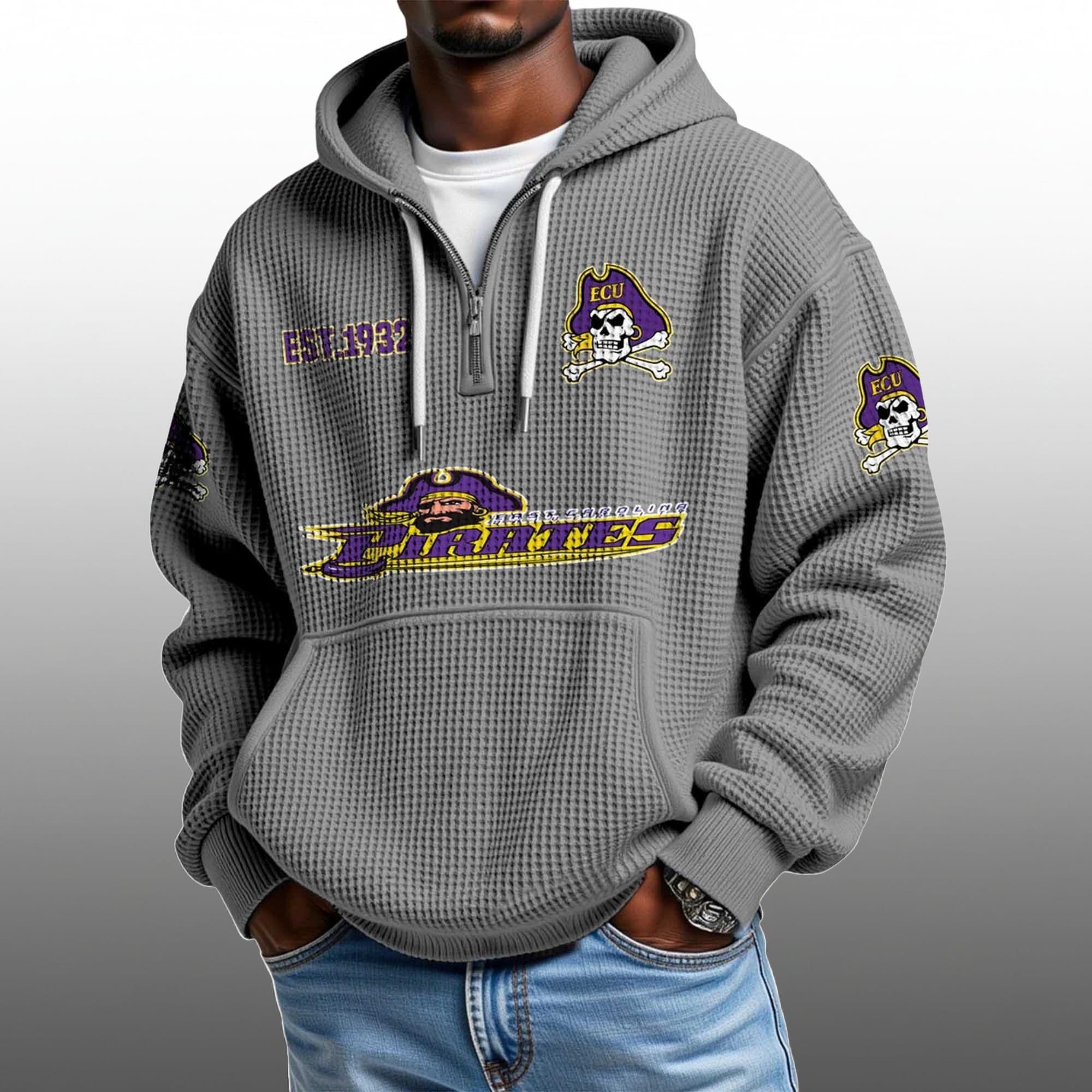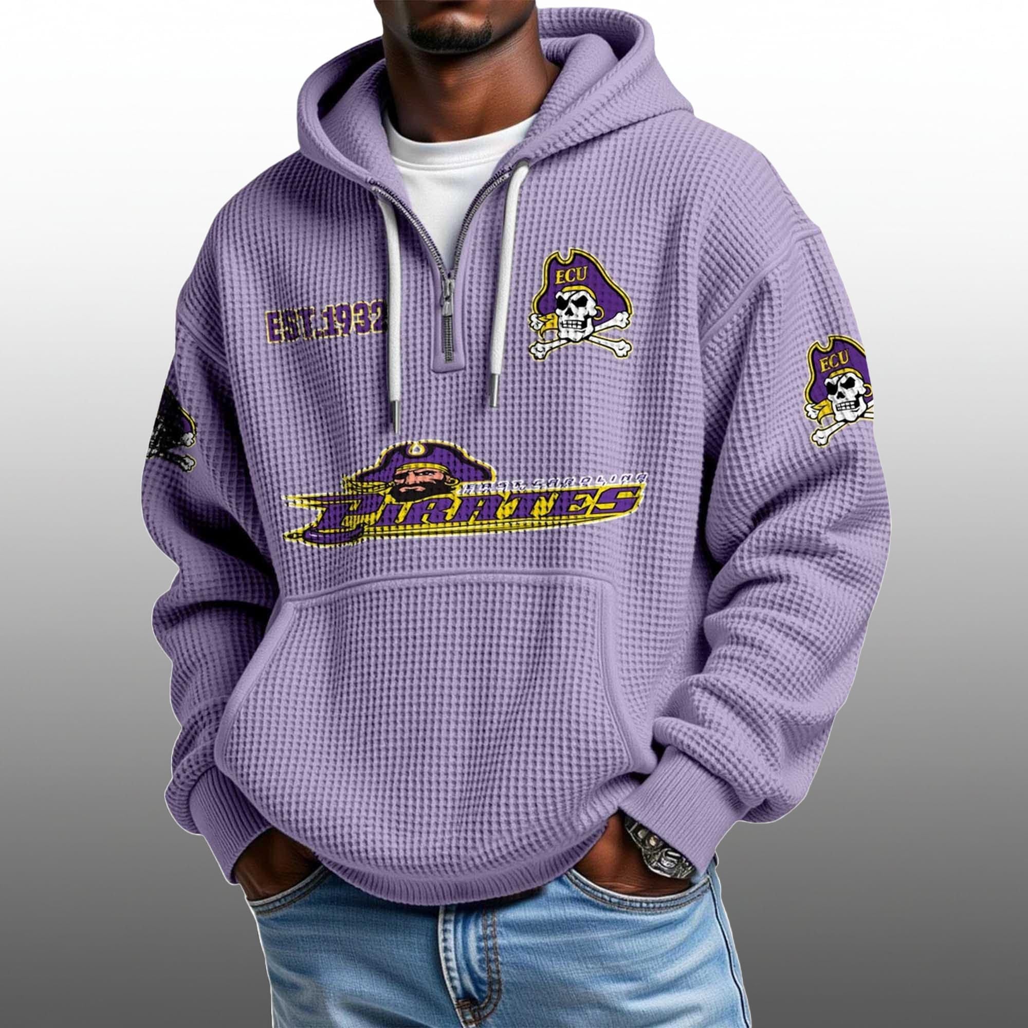 The hoodie is a masterclass in modern fan apparel. It moves beyond the standard fleece sweatshirt, utilizing a thermal waffle weave that provides superior insulation and a distinctively stylish look. The grey base color serves as the perfect neutral canvas, allowing the vibrant ECU Purple and Gold logos to stand out with commanding visibility.