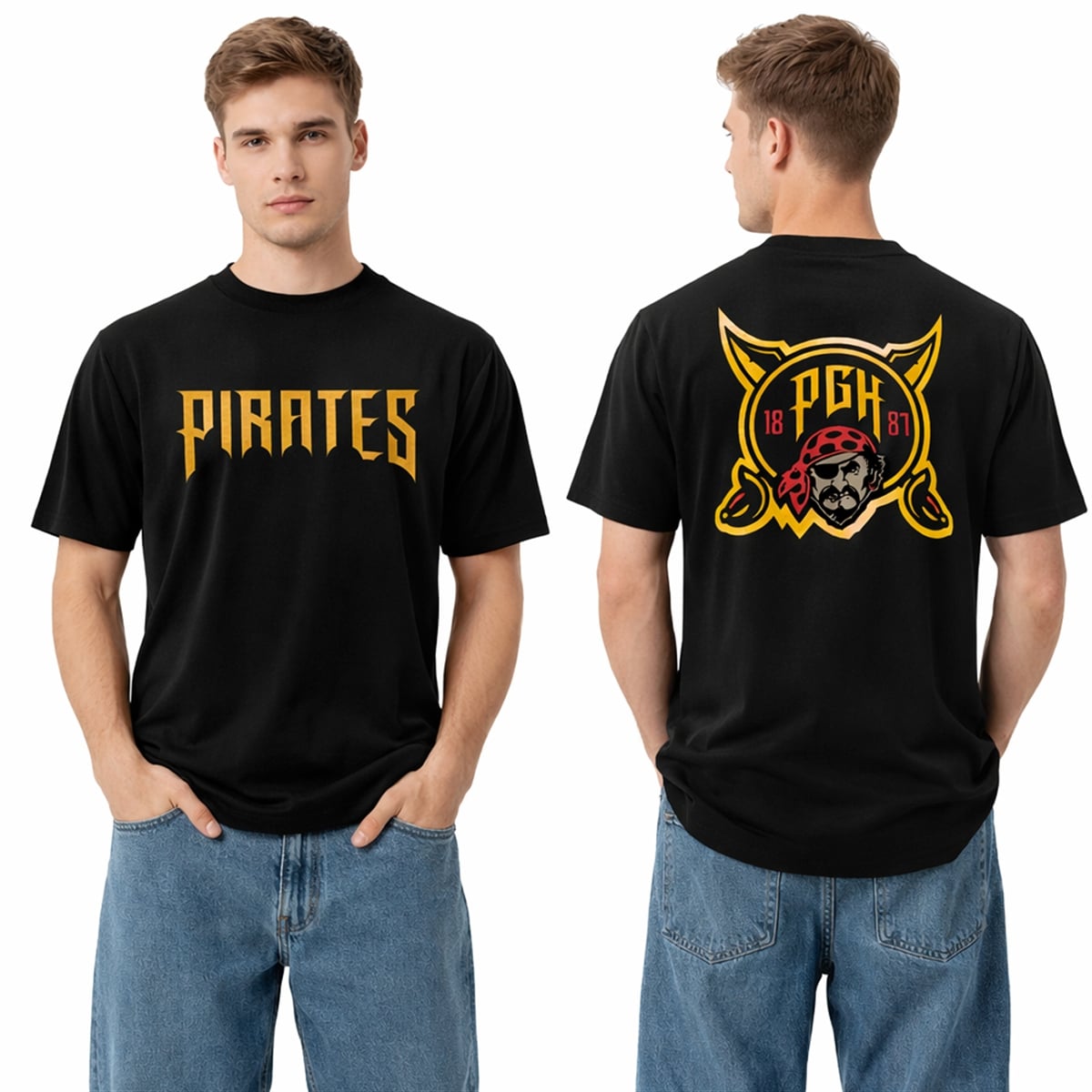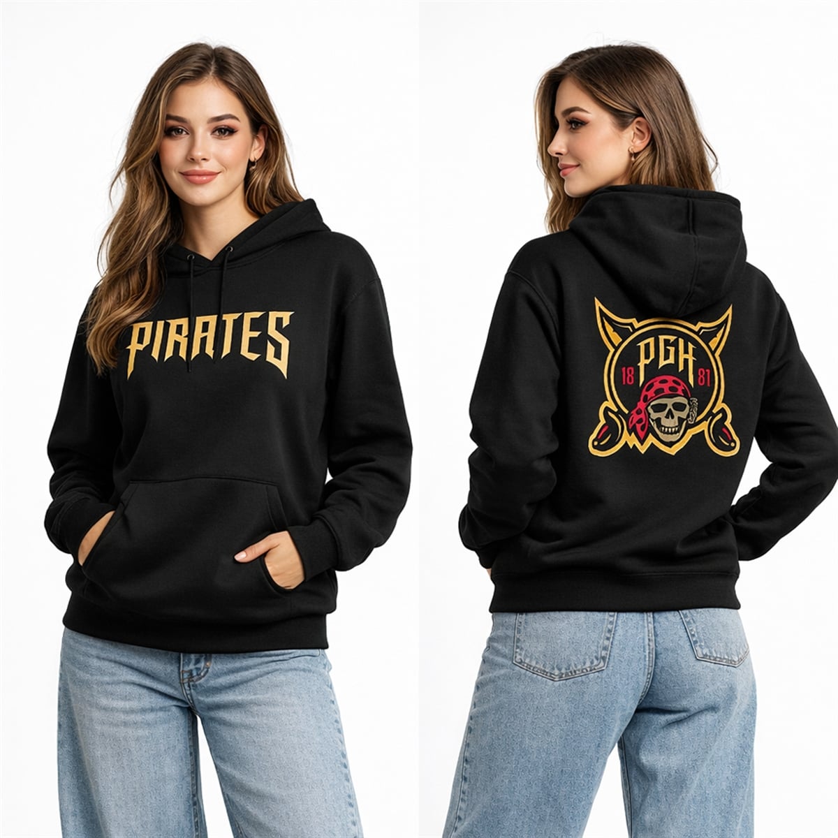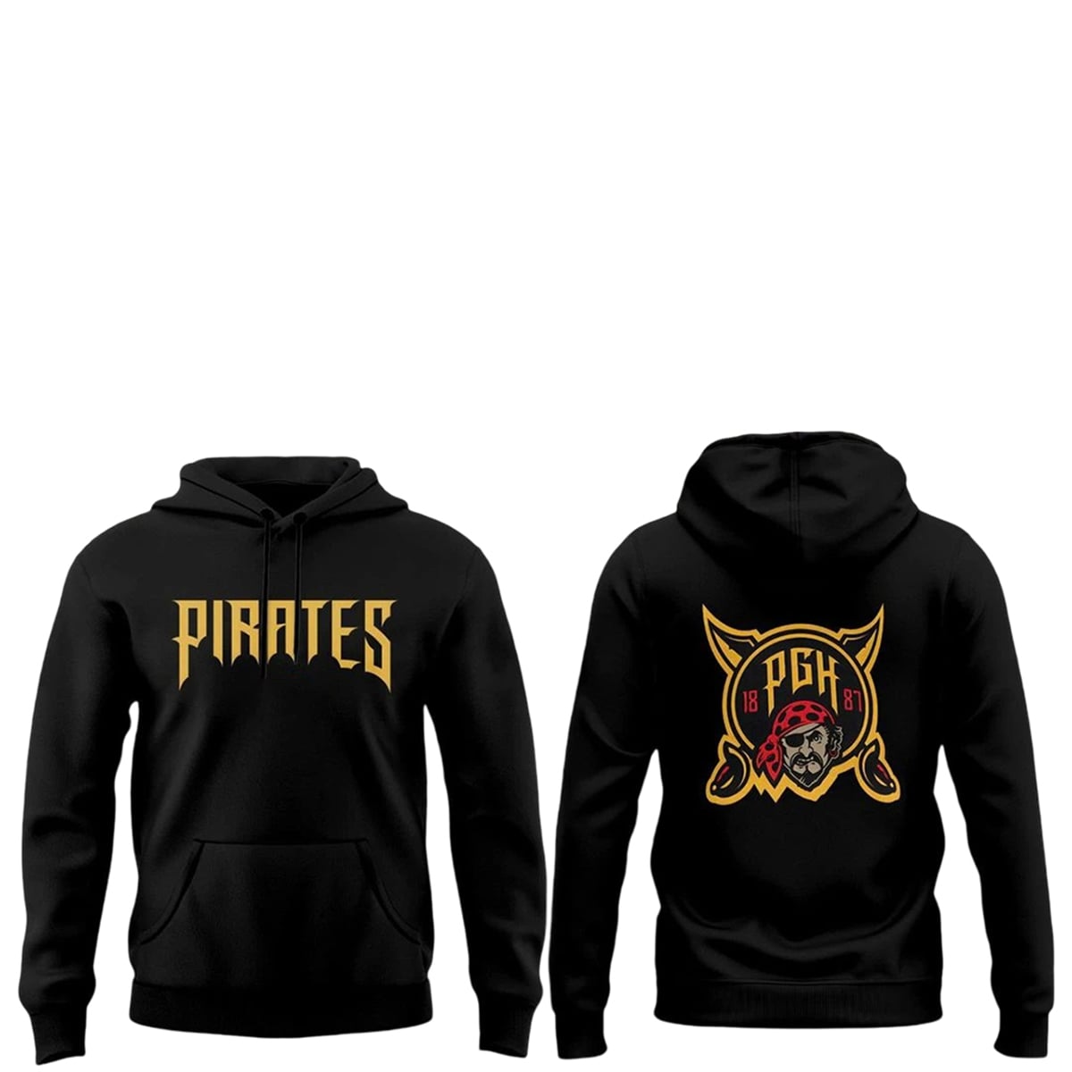 The hoodie is a visual masterpiece designed for the bold. Set against a deep, midnight-black canvas, the front features the word “PIRATES” in a fierce, jagged gold typography that instantly commands attention. The true showstopper, however, lies on the reverse side. The back is emblazoned with a massive, highly detailed graphic: a menacing pirate skull wearing a red bandana, set against crossed golden cutlasses, and framed by a shield bearing the letters “PGH” and the year “1887.” The colorway strictly adheres to the iconic black and gold that runs through the veins of the city, perfectly bridging the gap between an aggressive streetwear silhouette and a classic sports tribute.