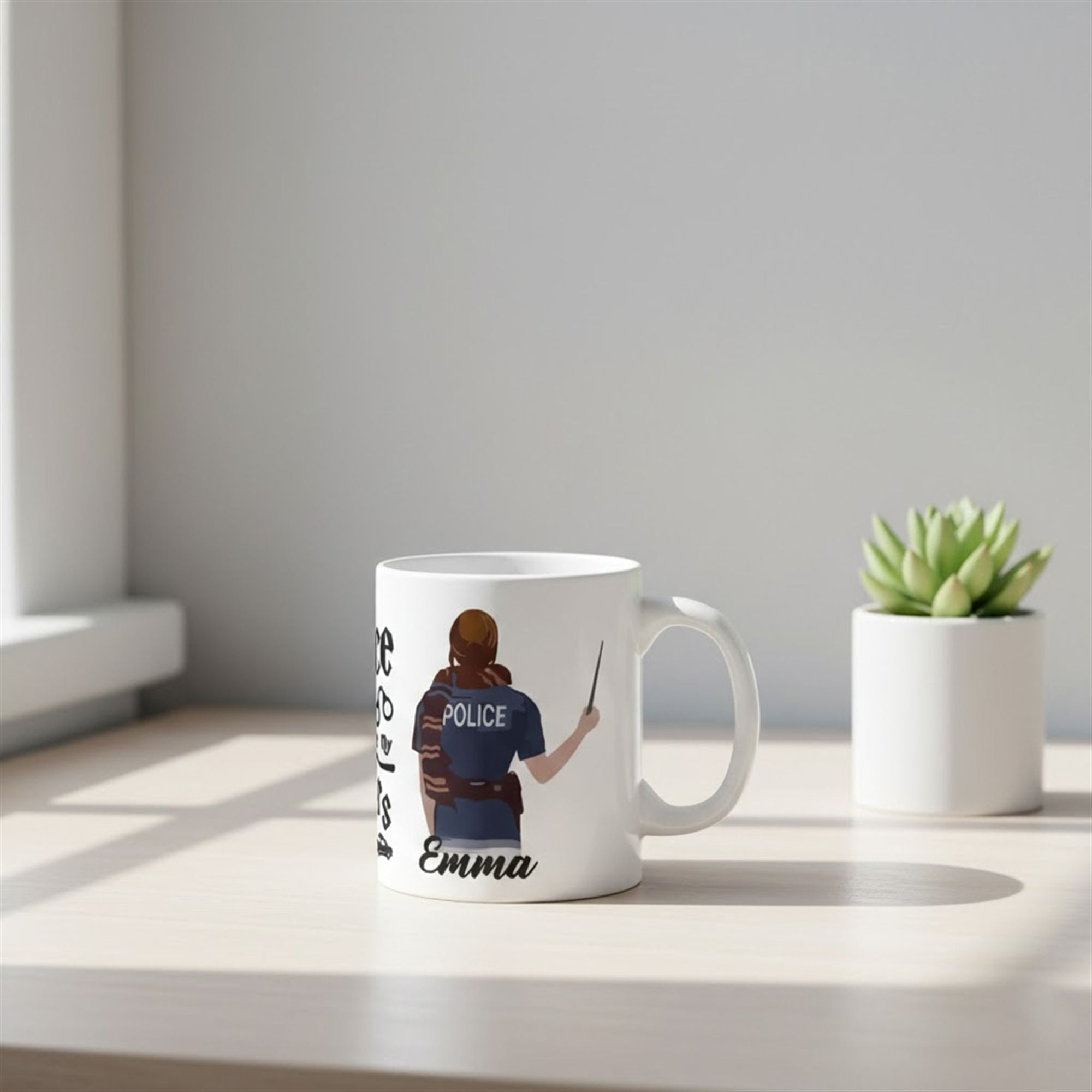 The front of the mug boldly declares the humorous reality: “Police Officer because my letters never came.” It acknowledges that while they may not be casting charms at a boarding school, they are protecting their communities in the real world. The aesthetic is sharp, contrasting black silhouettes against a white background to ensure the text pops, making it highly visible during video calls or across the squad room.