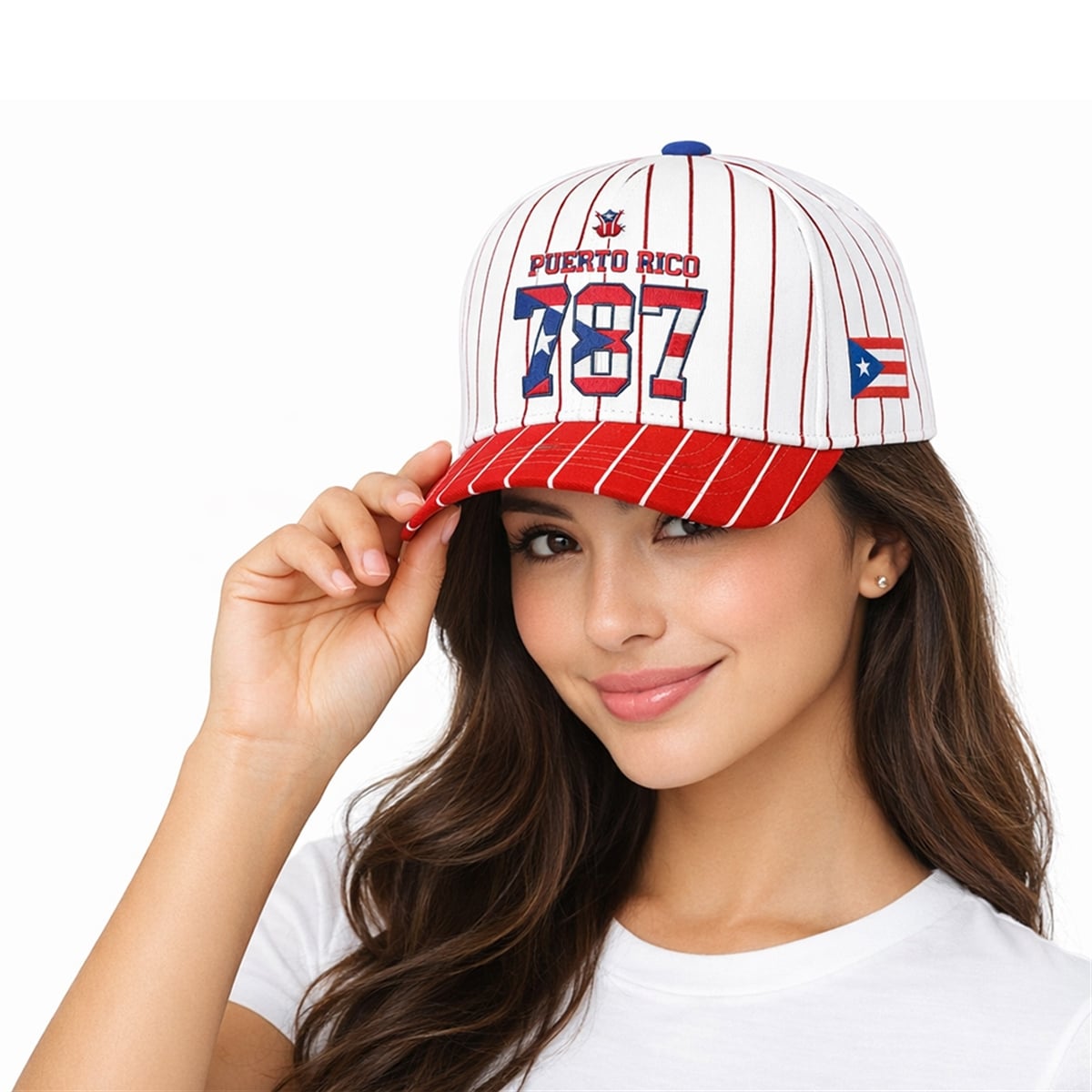The hat is a visually dynamic headwear piece that commands attention. The design features a stark white crown heavily accented by vibrant red vertical pinstripes, creating a classic, athletic-inspired aesthetic. The brim provides a striking contrast, utilizing a solid red base detailed with sharp white pinstripes. Front and center, the word “PUERTO RICO” is boldly in red above the oversized numerals “787.” These numbers serve as the focal point of the cap, cleverly filled with the geometric pattern of the Puerto Rican flag—complete with the iconic blue triangle, white star, and red and white stripes. A secondary Puerto Rican flag adorns the side panel, while a vibrant blue top button ties the entire color palette together perfectly.