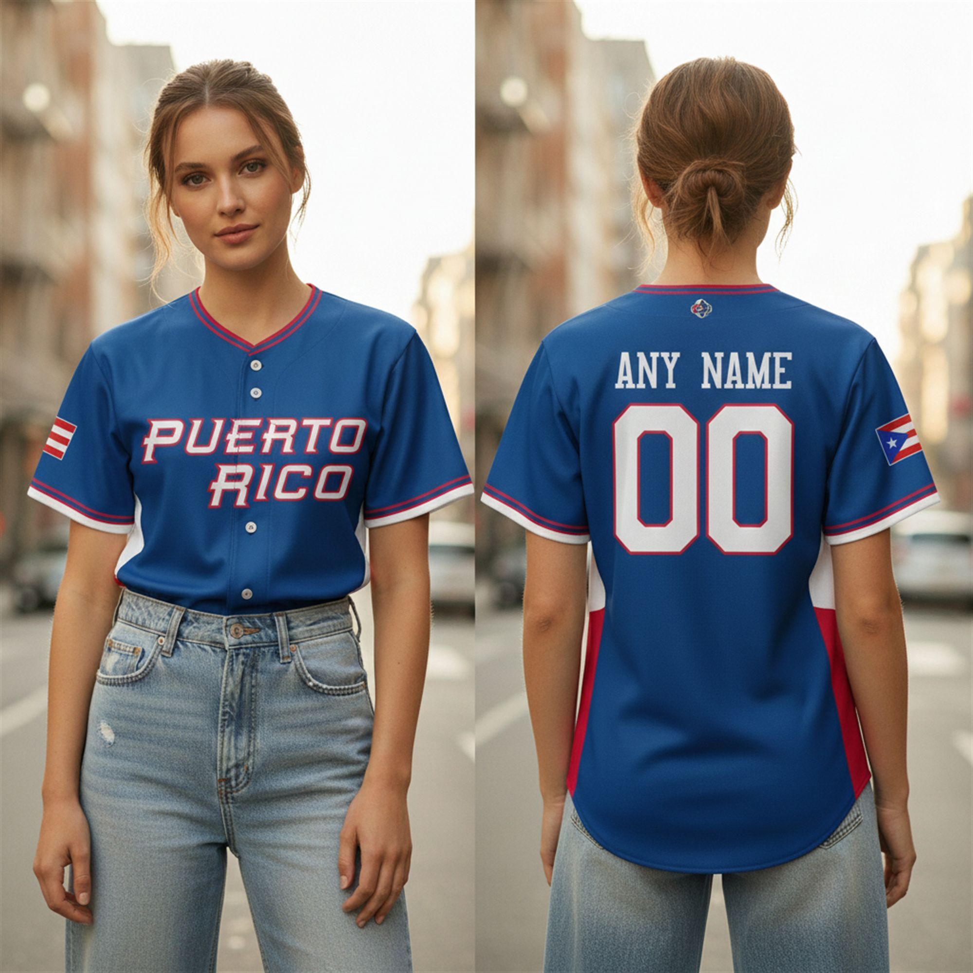 This bold blue jersey features the classic “PUERTO RICO” wordmark across the chest in a striking red and white font, instantly recognizable to baseball fans worldwide. The design honors the traditional colors of the Puerto Rican flag, incorporating sharp red and white side panels that create a dynamic, athletic silhouette. The iconic single-star flag is proudly displayed on the sleeve, ensuring that your heritage is visible from every angle. The “Any Name / 00” customization option allows for personal storytelling—whether honoring a family legend, a favorite player, or your own nickname.