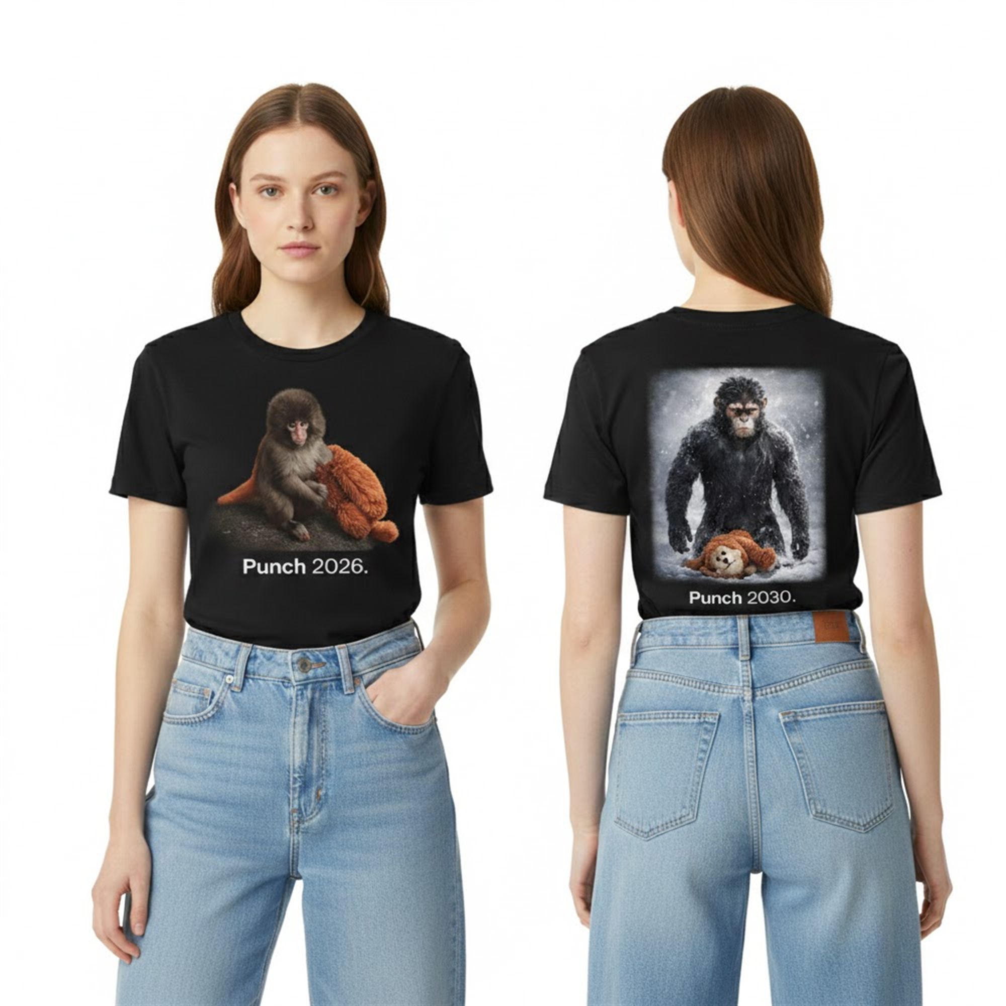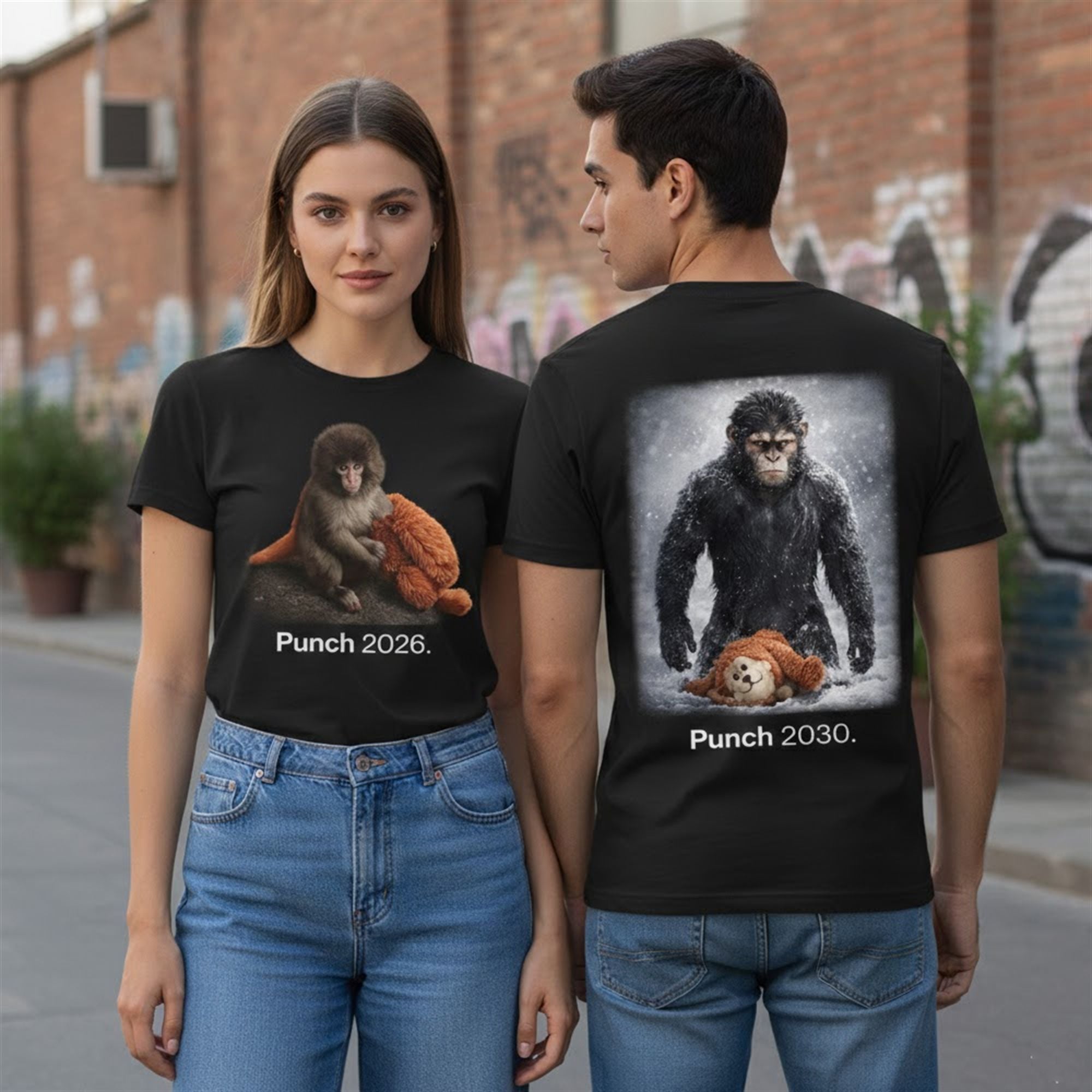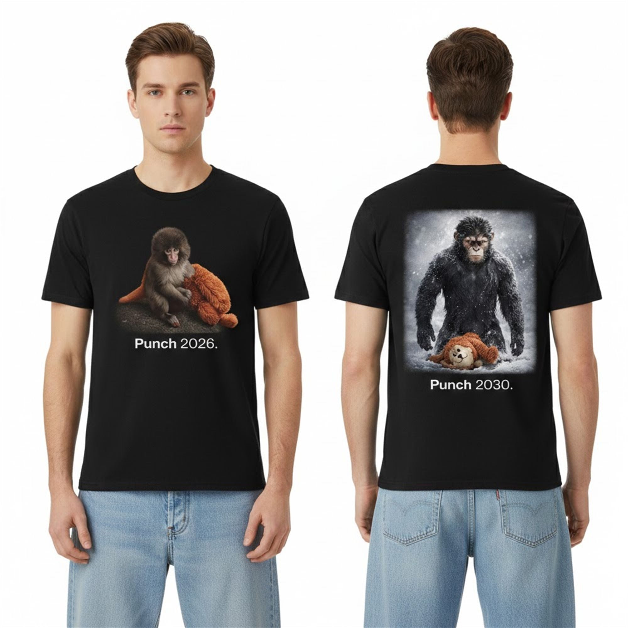 The internet thrives on contrast, and the shirt delivers the ultimate before-and-after story. The front of the design features an innocent, wide-eyed baby monkey clutching a stuffed toy, labeled “Punch 2026.” It represents the present: humble, unassuming, and perhaps a little unready for the world. But the back reveals the punchline and the promise. Labeled “Punch 2030,” it showcases a massive, battle-hardened ape towering confidently in the snow, leaving that same childhood toy behind. It is a visual masterpiece of comedic timing and raw motivation, designed for those who know their peak era is still loading.