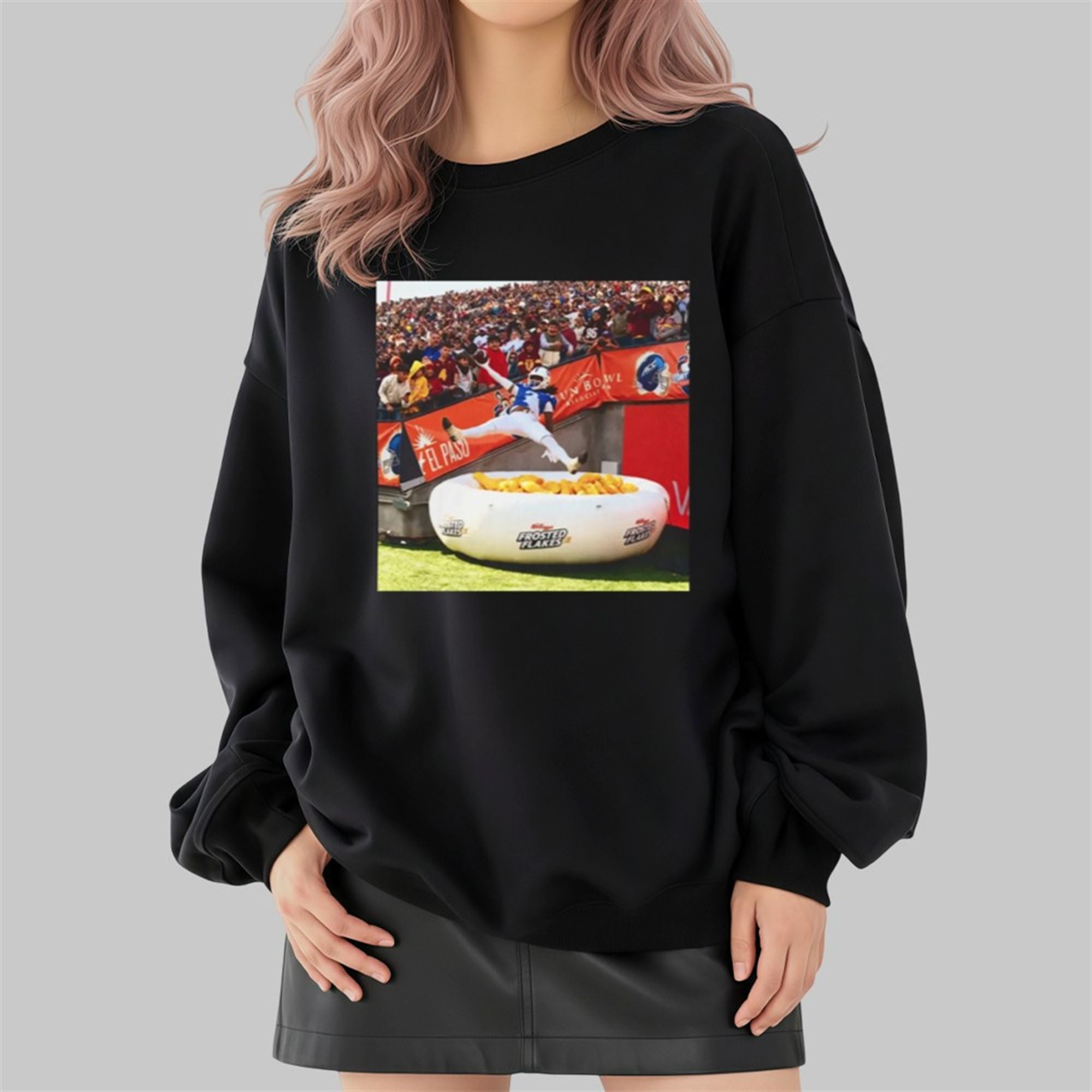 Relive the most electric moment of the 2025 college football bowl season with this Que’Sean Brown Frosted Flakes Leap Shirt capturing Que’Sean Brown’s viral “Cereal Celly.” After securing a crucial touchdown in the Tony the Tiger Sun Bowl, the Duke standout didn’t just celebrate—he made history by launching himself into the giant bowl of Frosted Flakes.