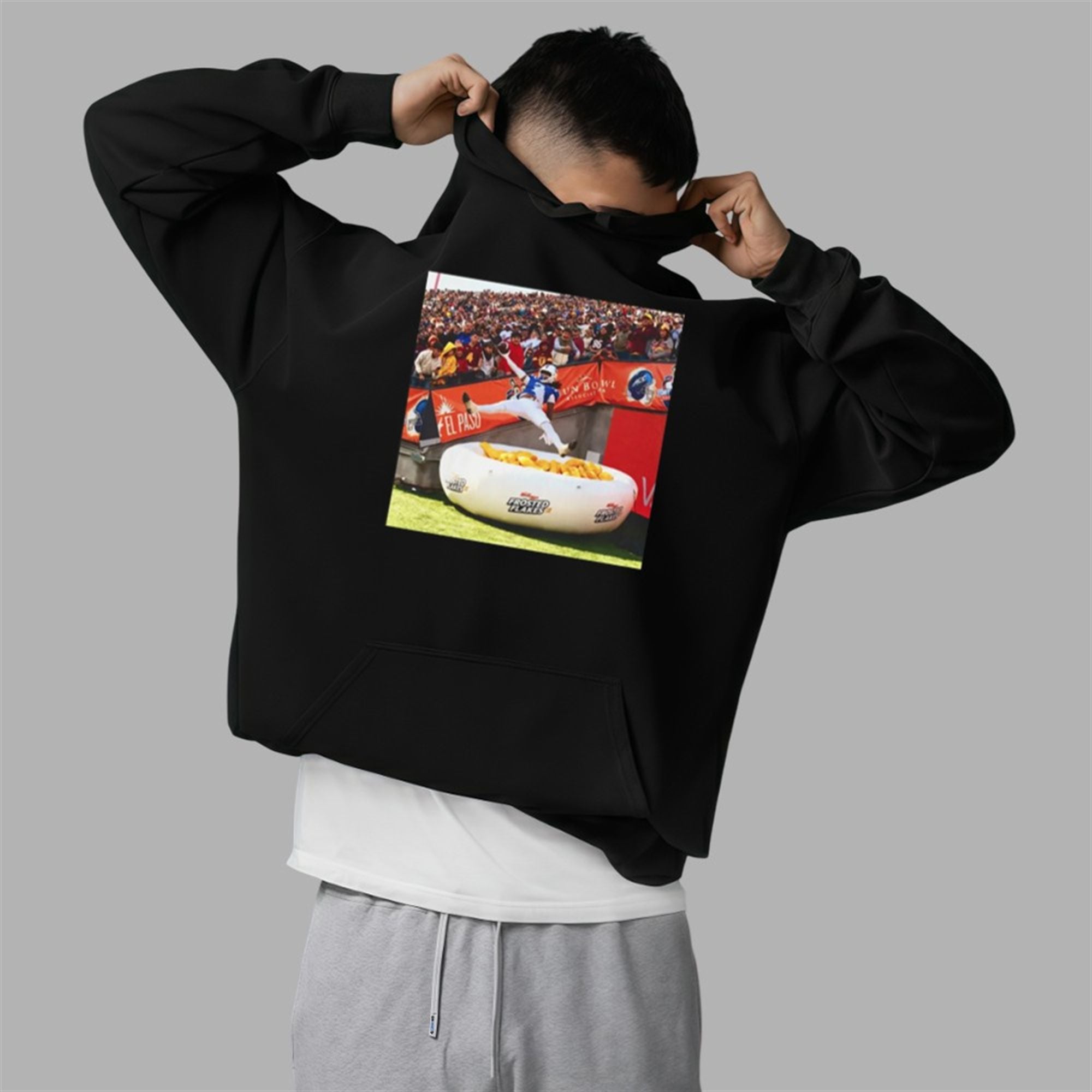 Capture the energy of victory with the shirt, a must-have apparel item for Duke Blue Devils fans and college football enthusiasts. This shirt features a high-definition graphic of wide receiver Que’Sean Brown mid-air, executing the now-famous leap into the giant inflatable bowl of Frosted Flakes during the 2025 Sun Bowl in El Paso, Texas.