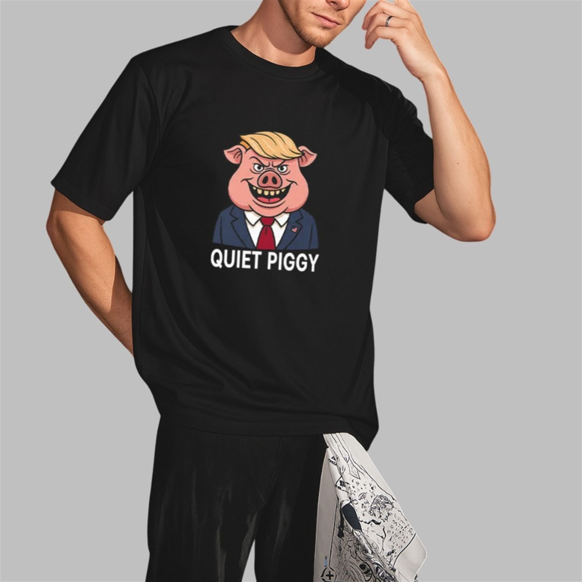 The design features a detailed, cartoon-style illustration of a pig donning the signature navy suit, red tie, and unmistakable hairstyle of the 45th President. The text “QUIET PIGGY” is emblazoned below in a bold, white sans-serif font, ensuring the message is legible even from a distance. This isn’t just a generic funny shirt; it is a specific reference to the absurdity of modern political name-calling.