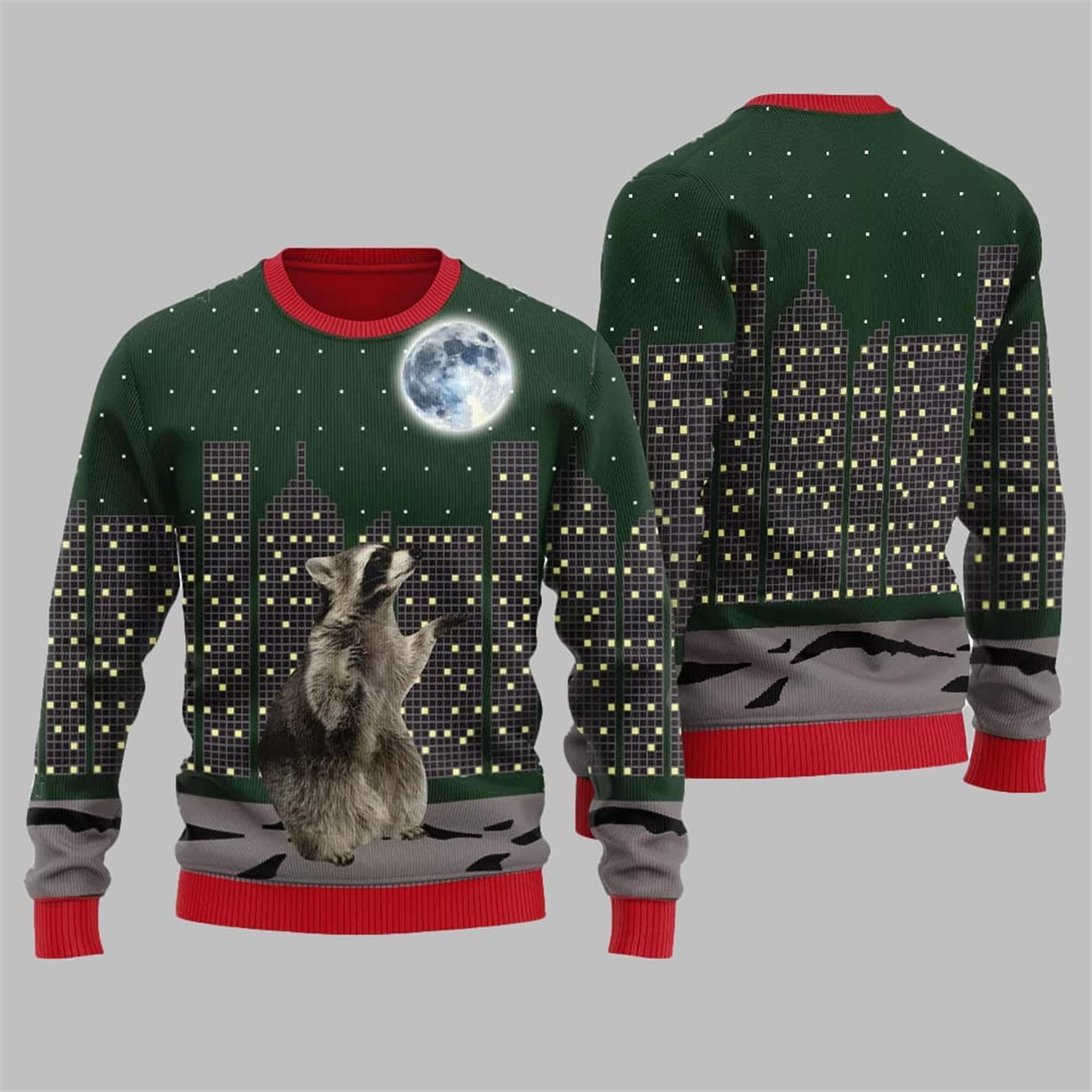 The design captures a captivating and humorous scene: a lone, incredibly detailed raccoon is perched on a ledge, gazing up in awe at a brilliant, full moon that illuminates the night sky. Set against a vibrant blue backdrop dotted with classic “ugly sweater” style stars, the scene is framed by a sprawling city skyline. The skyscrapers, with their hundreds of glowing yellow windows, create a stunning sense of depth and atmosphere, bringing the urban landscape to life. The bold red cuffs, collar, and waistband provide a classic festive contrast, ensuring the design pops with holiday spirit while maintaining its cool, contemporary edge.