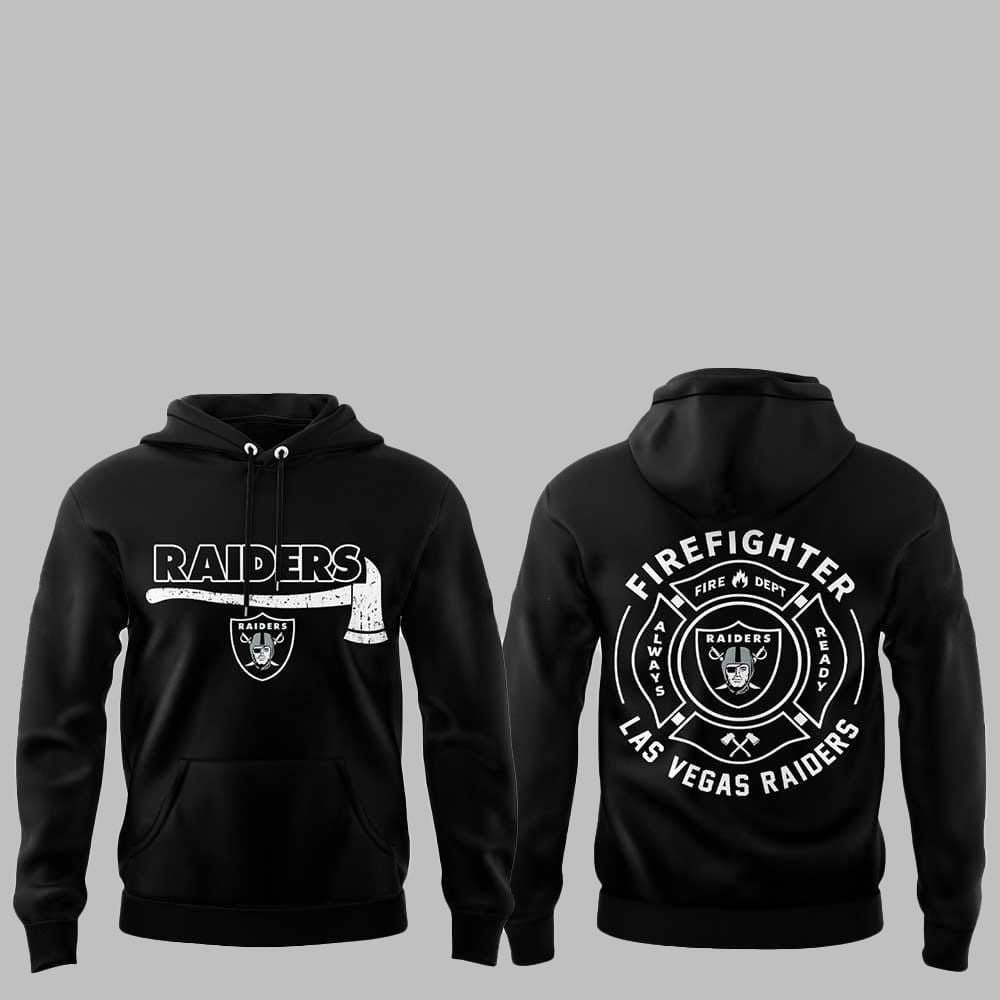 The Front: Across the chest, the iconic “RAIDERS” wordmark is reimagined with a powerful firefighter’s axe integrated into the lettering—a clear symbol of strength and readiness. Just below, the classic Raiders shield logo anchors the design, showcasing your team pride.