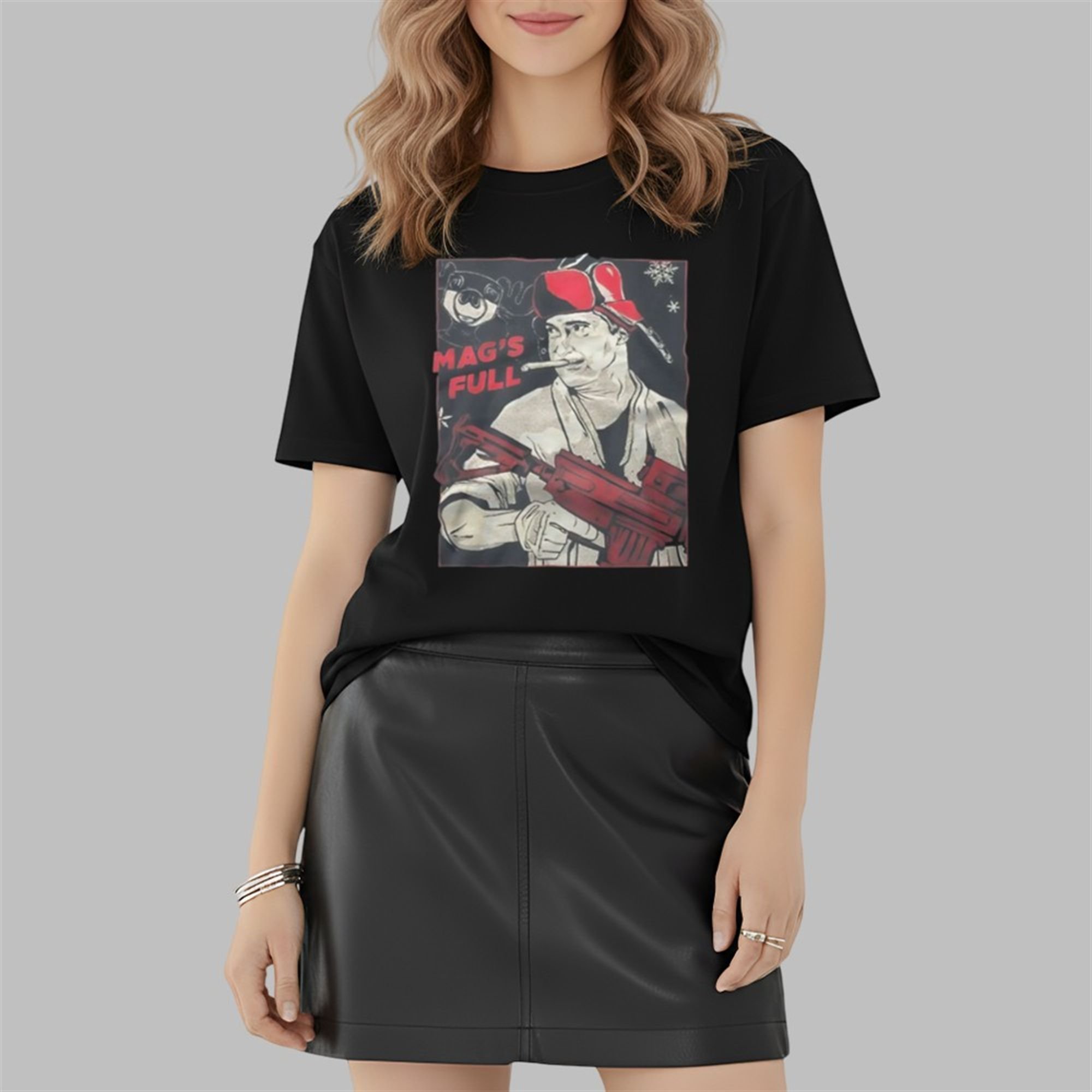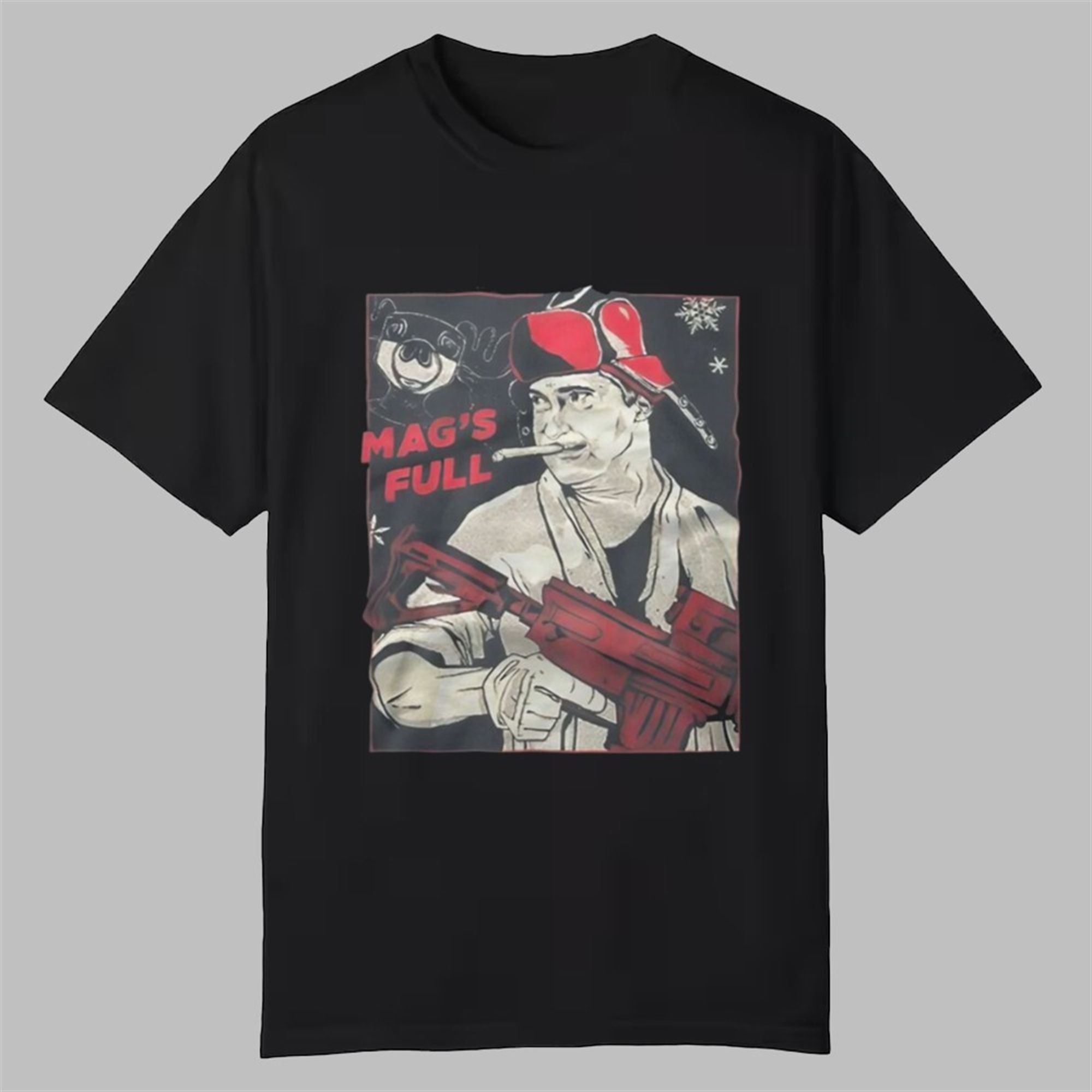 The text “MAG’S FULL” is printed in a bold, distressed red font that pops against the black background, flanked by subtle snowflakes and a festive moose mug icon. This isn’t just a t-shirt; it’s a statement piece for those who believe the holidays should be celebrated with a bang.