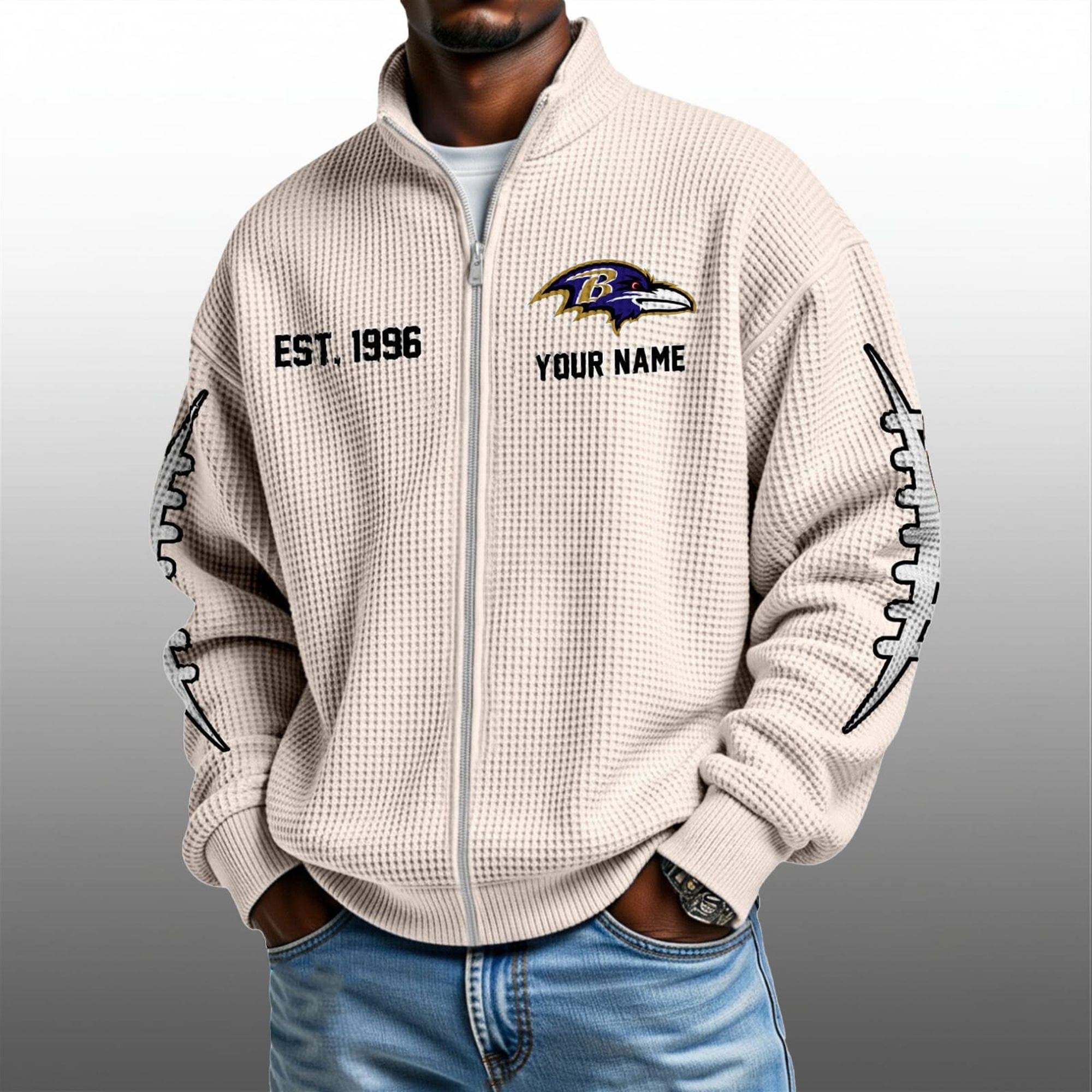 Step up your game day attire with the Ravens “Legacy 1996” Custom Sage Waffle Knit Quarter-Zip, a fresh take on traditional fan gear. Designed for the modern member of “The Flock,” this pullover moves beyond the standard purple and black to offer a sophisticated sage green aesthetic that works perfectly from the tailgate at M&T Bank Stadium to a casual night out in Fells Point.