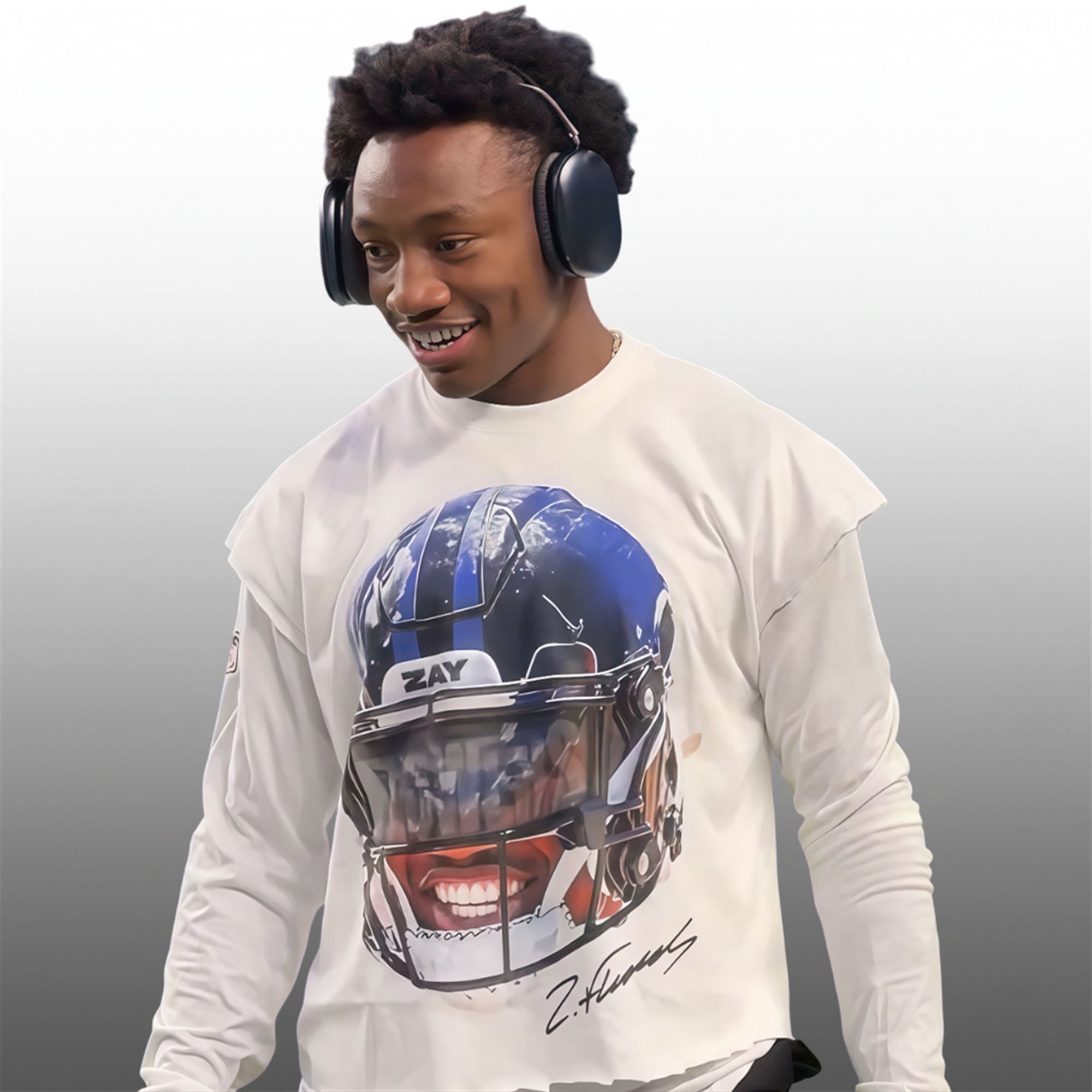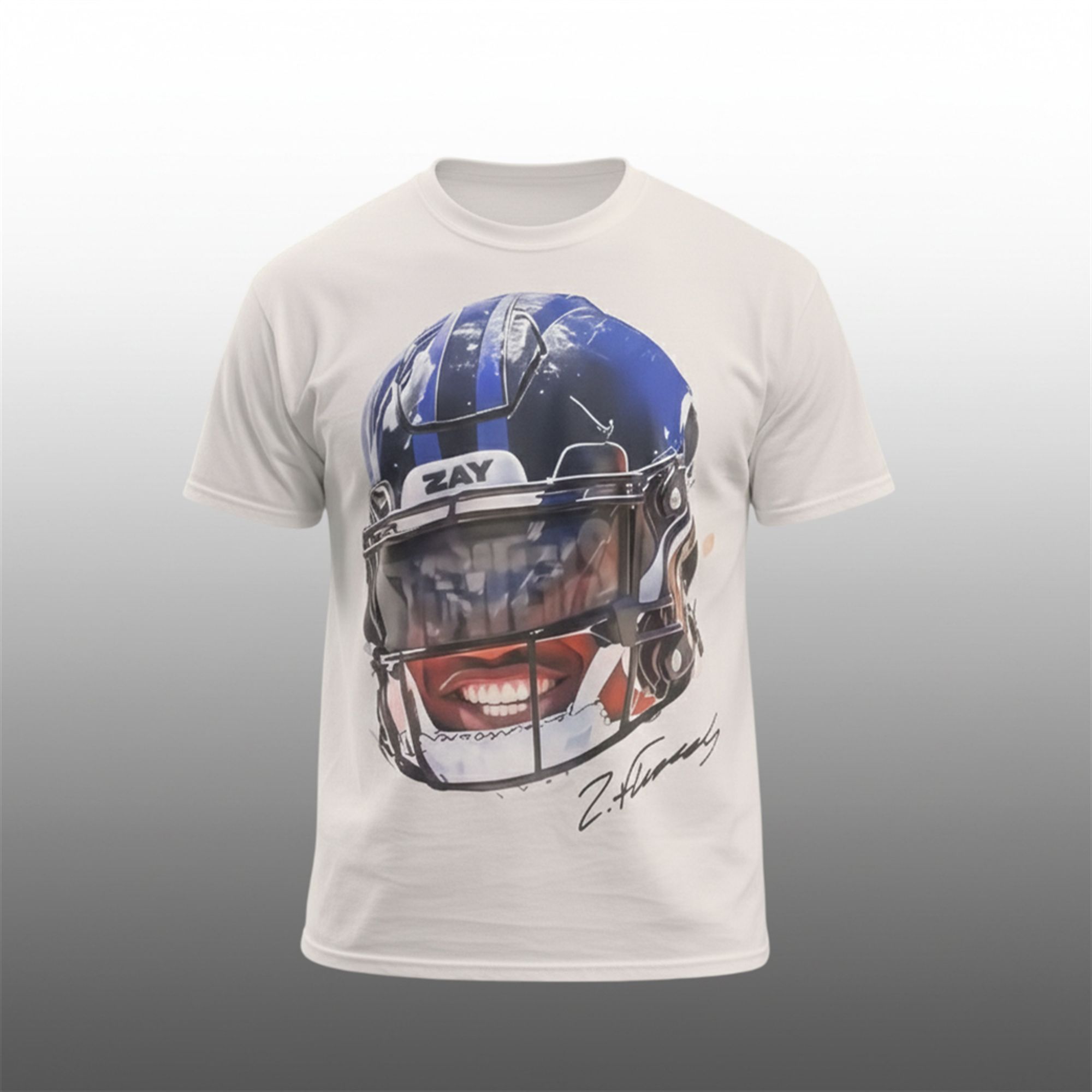 The centerpiece of this shirt is a large, hyper-detailed graphic of a Baltimore Ravens helmet, reimagined with an artistic edge. The helmet’s iconic purple and black are given a dynamic, illustrative sheen, while the visor reflects the bright lights of M&T Bank Stadium. Look closer, and you’ll see the details that set this shirt apart: “ZAY” is prominently displayed on the visor clip, and the design is finished with an iconic, confident smileâperfectly capturing the charisma he brings to the gridiron.
