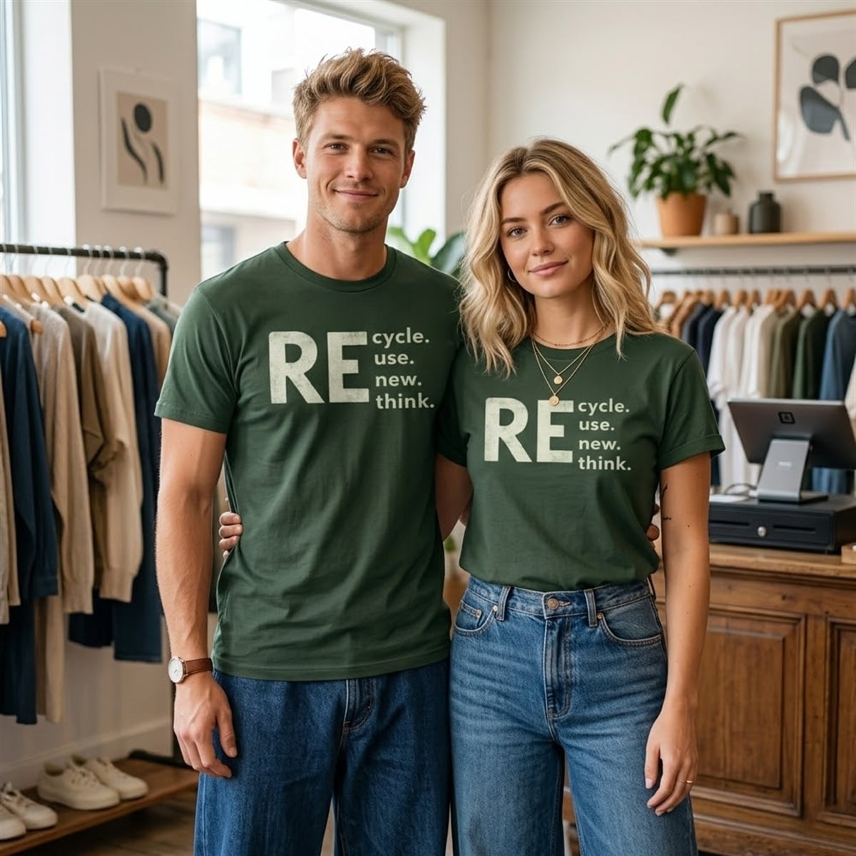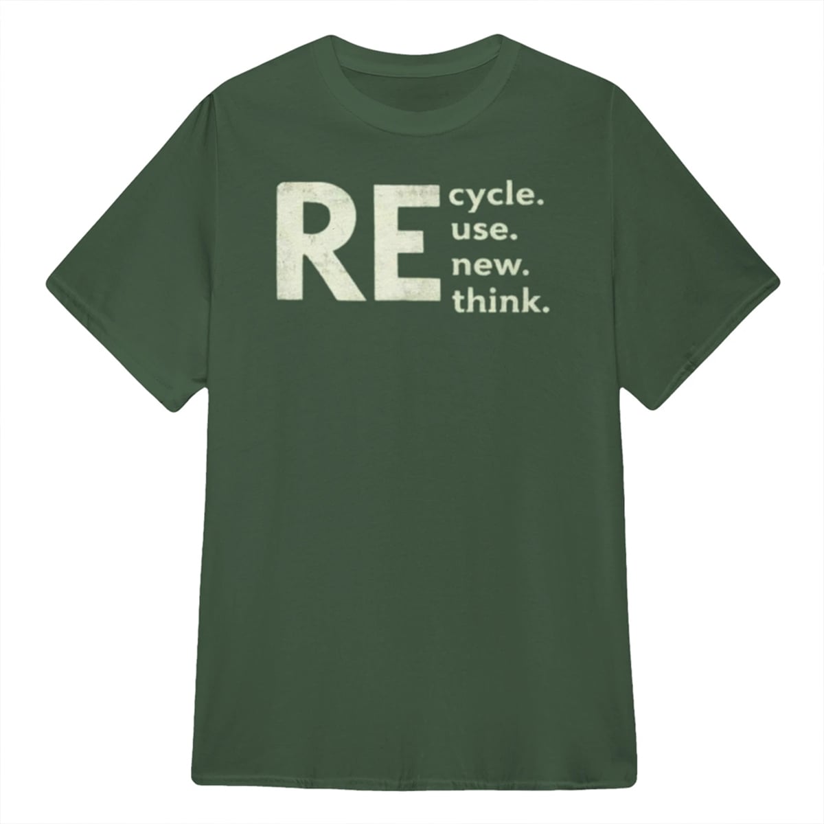The shirt features a striking, minimalist aesthetic set against a deep, earthy green background. The design ingeniously uses the oversized, distressed letters “RE” as a prefix to four distinct stacked words: cycle., use., new., and think. This clever typographic layout creates a dual reading experience. At first glance, it presents a list of positive, forward-moving actions. Upon closer inspection, the prefix connects to form the essential mantras of the environmental movement: Recycle, Reuse, Renew, Rethink. The distressed, vintage-inspired font gives the design an authentic, grassroots aesthetic, perfectly suited for those who appreciate understated yet impactful visual communication.