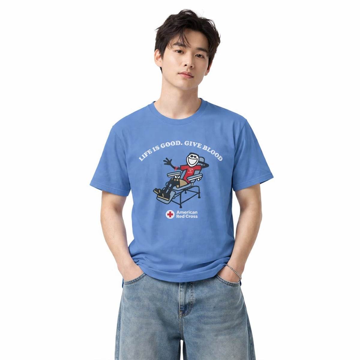The shirt is a visually engaging piece of advocacy apparel featuring a bright, optimistic aesthetic. Set against a calming blue background, the central graphic depicts the beloved “Life is Good” stick-figure character relaxing comfortably in a donation chair, smiling broadly while giving blood. The bold, arched typography overhead reads “LIFE IS GOOD. GIVE BLOOD,” paired seamlessly with the American Red Cross logo at the base.