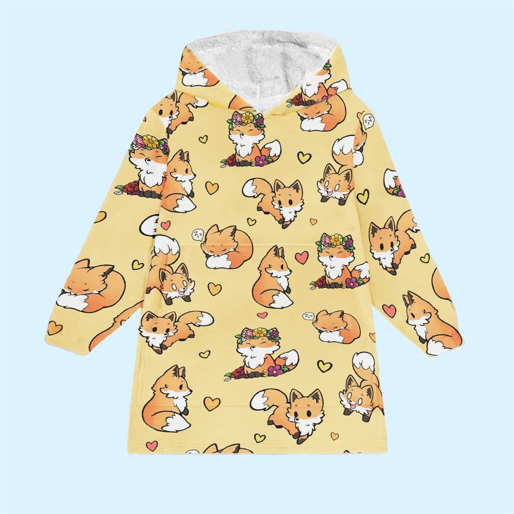 Brighten your downtime with the utterly charming fox pattern adorning this Red Fox Blanket Hoodie. Set against a cheerful yellow backdrop, numerous cute, cartoon-style foxes tumble and play across the fabric. You’ll find foxes sitting sweetly, curled up for a nap, and even some sporting adorable flower crowns, interspersed with little hearts for an extra touch of sweetness. This unique and playful design adds a dash of personality to your loungewear, making it as fun to look at as it is comfortable to wear. It’s a delightful visual treat for any animal lover.