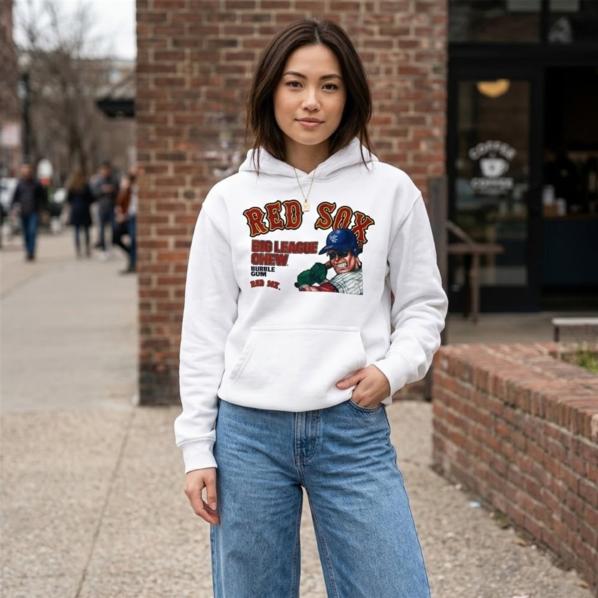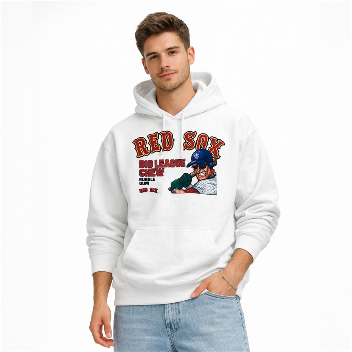 The hoodie is a masterful collision of two legendary cultural icons: historic New England baseball and the most recognizable dugout treat in sports history. Set against a crisp, clean white background, the front graphic commands attention. It features the instantly recognizable, jagged “Big League Chew” typography seamlessly adapted to spell out “Red Sox,” complete with the vintage, cartoon-style illustration of a gritty, determined ballplayer ready to take a swing. The vibrant reds, deep navy blues, and rich greens pop visually, creating a striking graphic layout that instantly transports fans back to the golden era of the sport. It is a highly stylized visual tribute to the aesthetic of the 1980s and 1990s baseball scene.