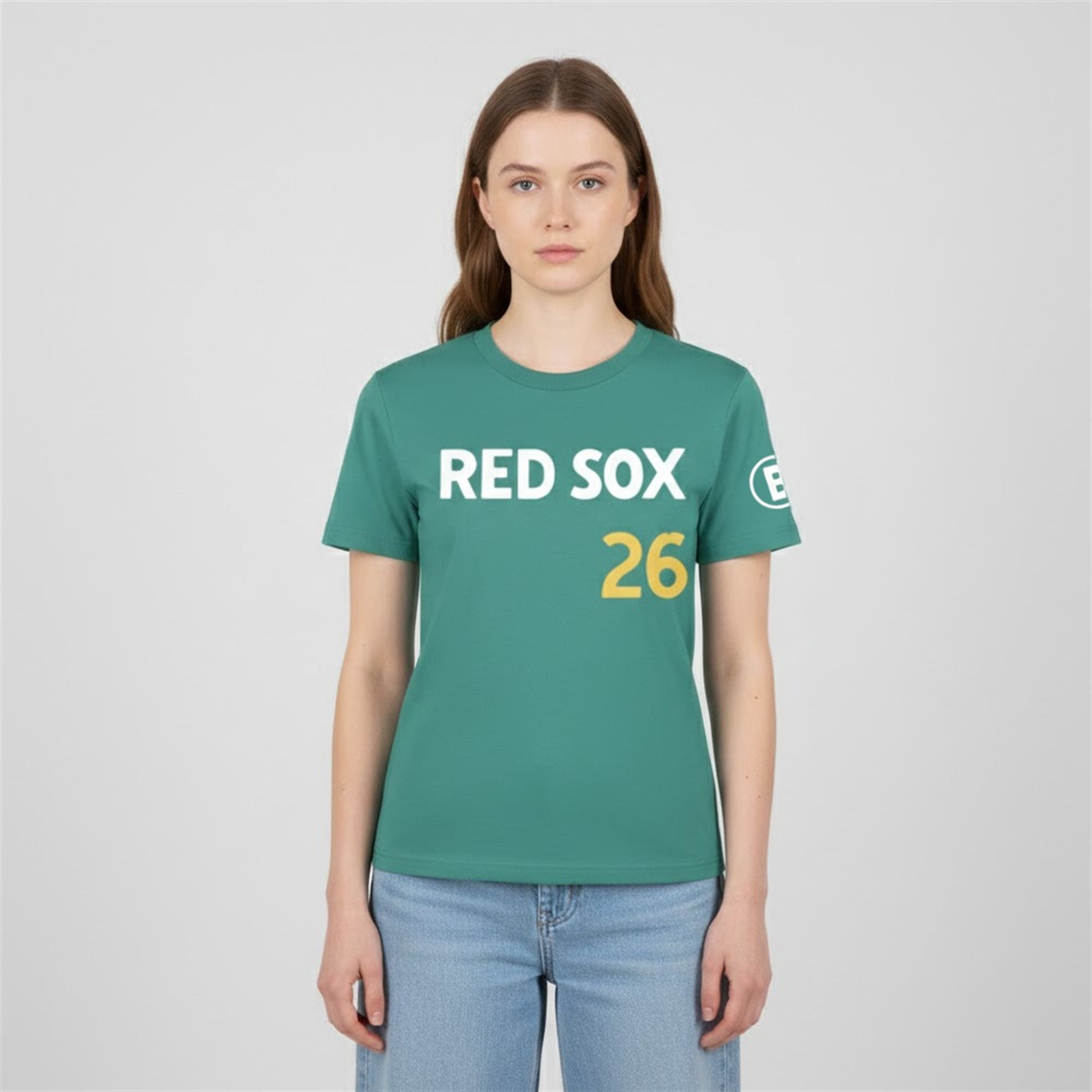 Visually, the shirt departs from the traditional navy and red, opting instead for the vibrant Teal and Yellow palette associated with the Red Sox City Connect uniforms. The front features a clean, bold “RED SOX” wordmark with a yellow accent “26,” while the back proudly displays “CLASS OF 26” in large, varsity-style block lettering. A circular logo on the sleeve adds an authentic finishing touch, marking it as “Theme Night” merchandise.