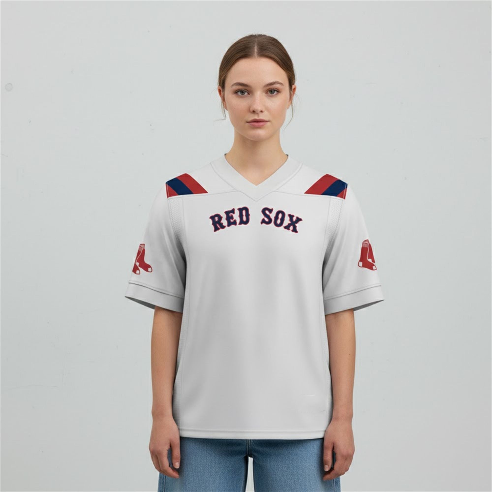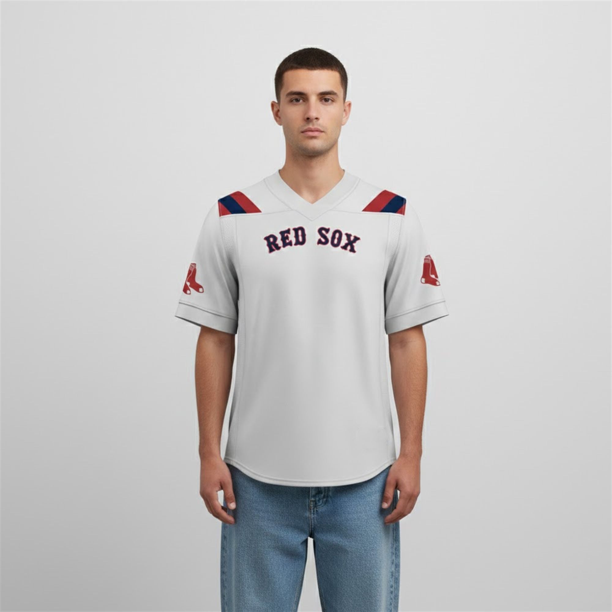 The jersey represents a bold departure from over a century of baseball tradition, offering a fresh visual narrative for the modern fan. This piece features a striking white base that serves as a canvas for the team’s legendary “RED SOX” wordmark, arched proudly across the chest in the team’s signature navy and red. Unlike the standard baseball jersey, this design adopts a classic football chassis, featuring a distinct V-neck collar and wide sleeves that offer a relaxed, athletic drape.