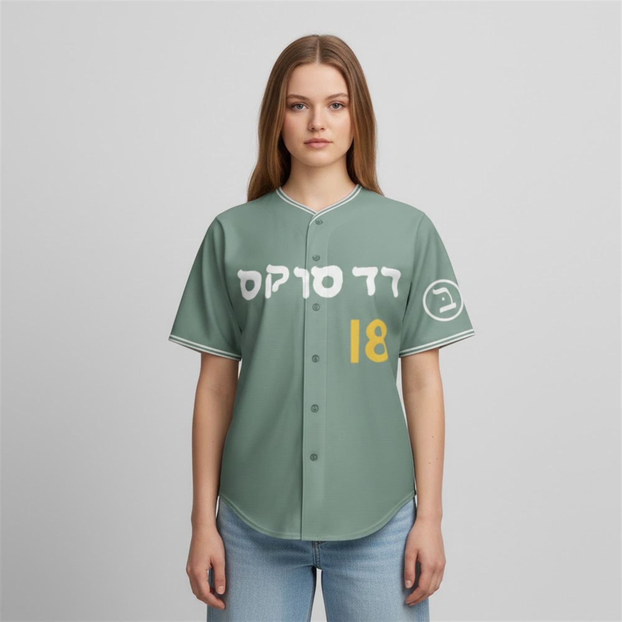 This jersey offers a fresh take on the classic baseball aesthetic, utilizing a distinct sage green colorway that pays homage to the legendary scenery of Fenway Park. The design moves beyond the standard home whites or road grays, offering a unique visual identity that pops in any crowd. The centerpiece of the jersey is the bold white lettering across the chest—“רד סוקס”—which is the phonetic Hebrew transliteration for “Red Sox.” This script is not just a translation; it is a badge of honor for Jewish fans who have supported the team for generations.
