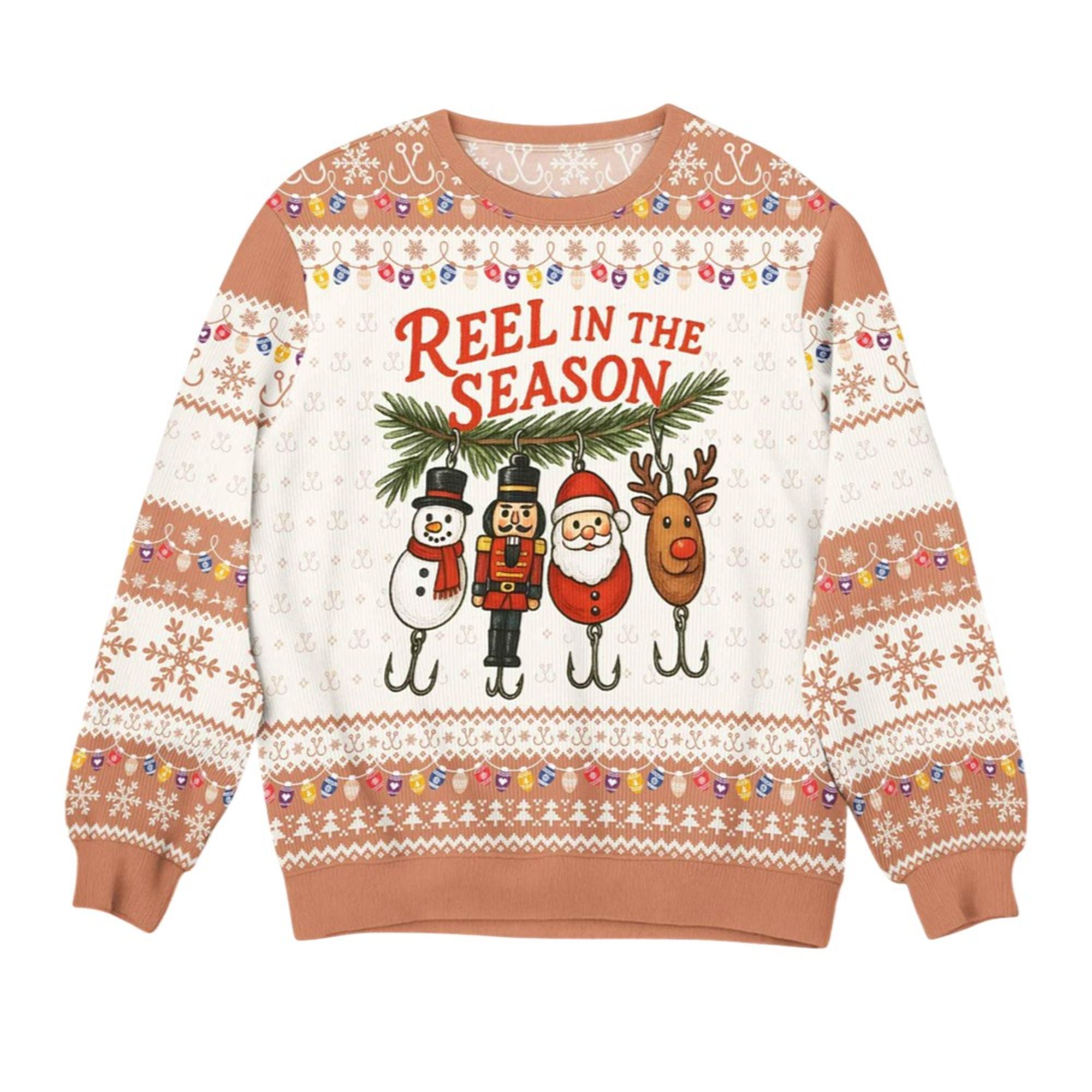 The centerpiece of the sweater features the bold, festive text “REEL IN THE SEASON” placed prominently above a pine branch. Dangling from this branch are four ingeniously designed fshing lures, each one transformed into a beloved Christmas character: a cheerful Snowman, a stoic Nutcracker, a jolly Santa Claus, and a friendly Reindeer. This clever fusion of fshing tackle and festive icons is what makes this sweater an absolute must-have. Surrounded by classic ugly sweater patterns like snowflakes and strings of colorful Christmas lights, the design is both nostalgic and refreshingly new. The warm, earthy terracotta and cream color palette adds a touch of rustic charm, ensuring you look stylishly festive.
