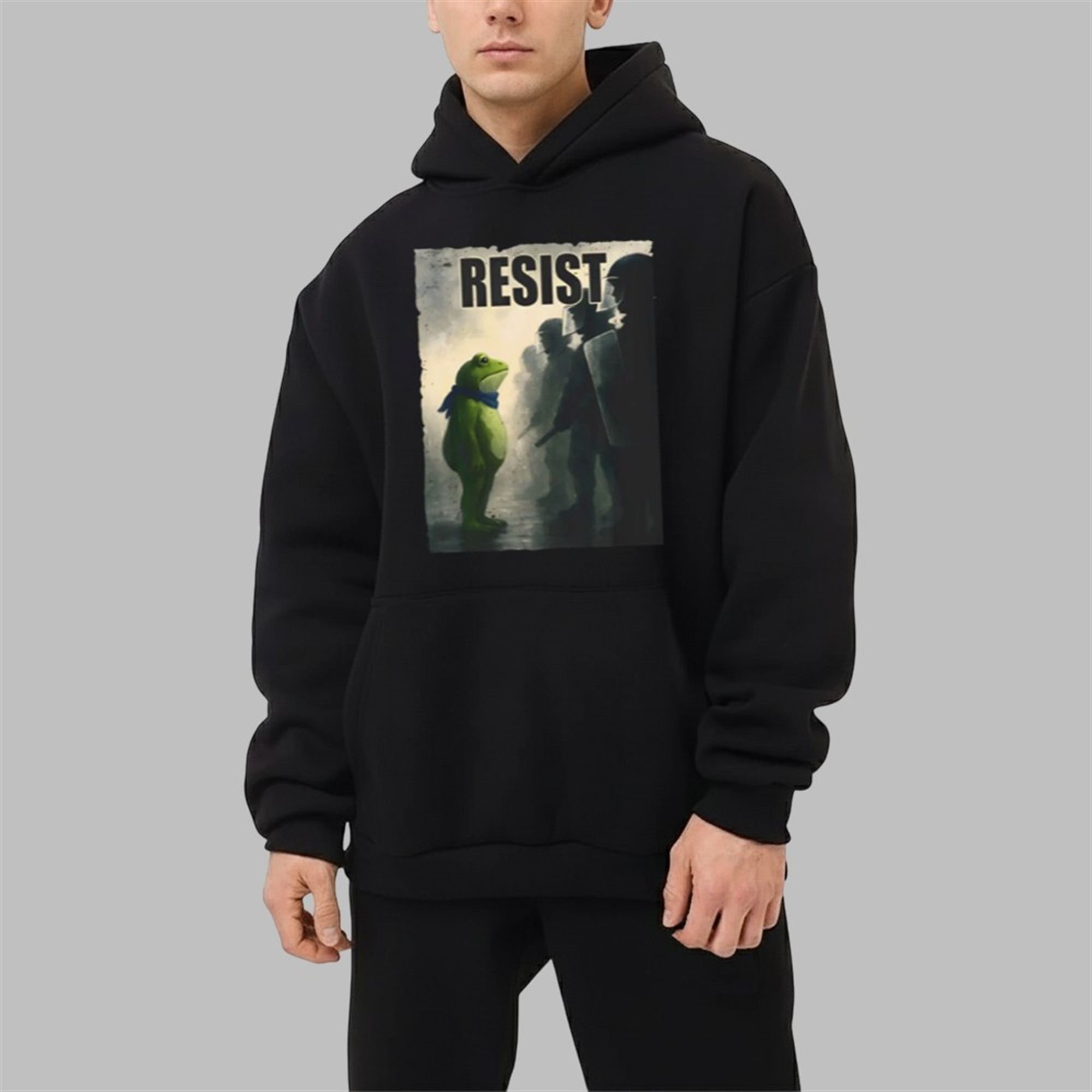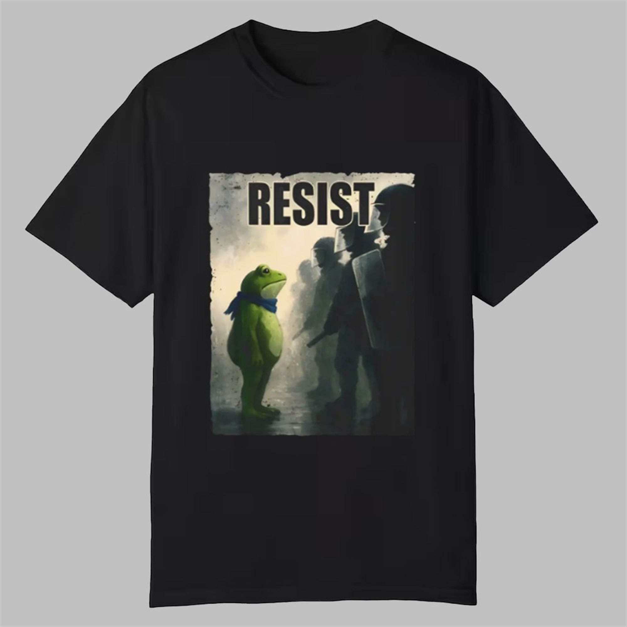 The story of the Portland Frog is one of unexpected courage. Amidst tense protests against the deployment of the National Guard and the controversial policies of the Trump administration, an anonymous activist in an inflatable frog costume stood their ground. This act of playful defiance, a stark contrast to the grim-faced lines of law enforcement, became an instant viral sensation. The Portland Frog, alongside other costumed protesters, demonstrated that resistance doesn’t always have to be angry; it can be joyful, creative, and disarmingly effective. This shirt captures that spirit, featuring a powerful image of the lone frog standing firm against a backdrop of riot police with the single, bold word: “RESIST.”