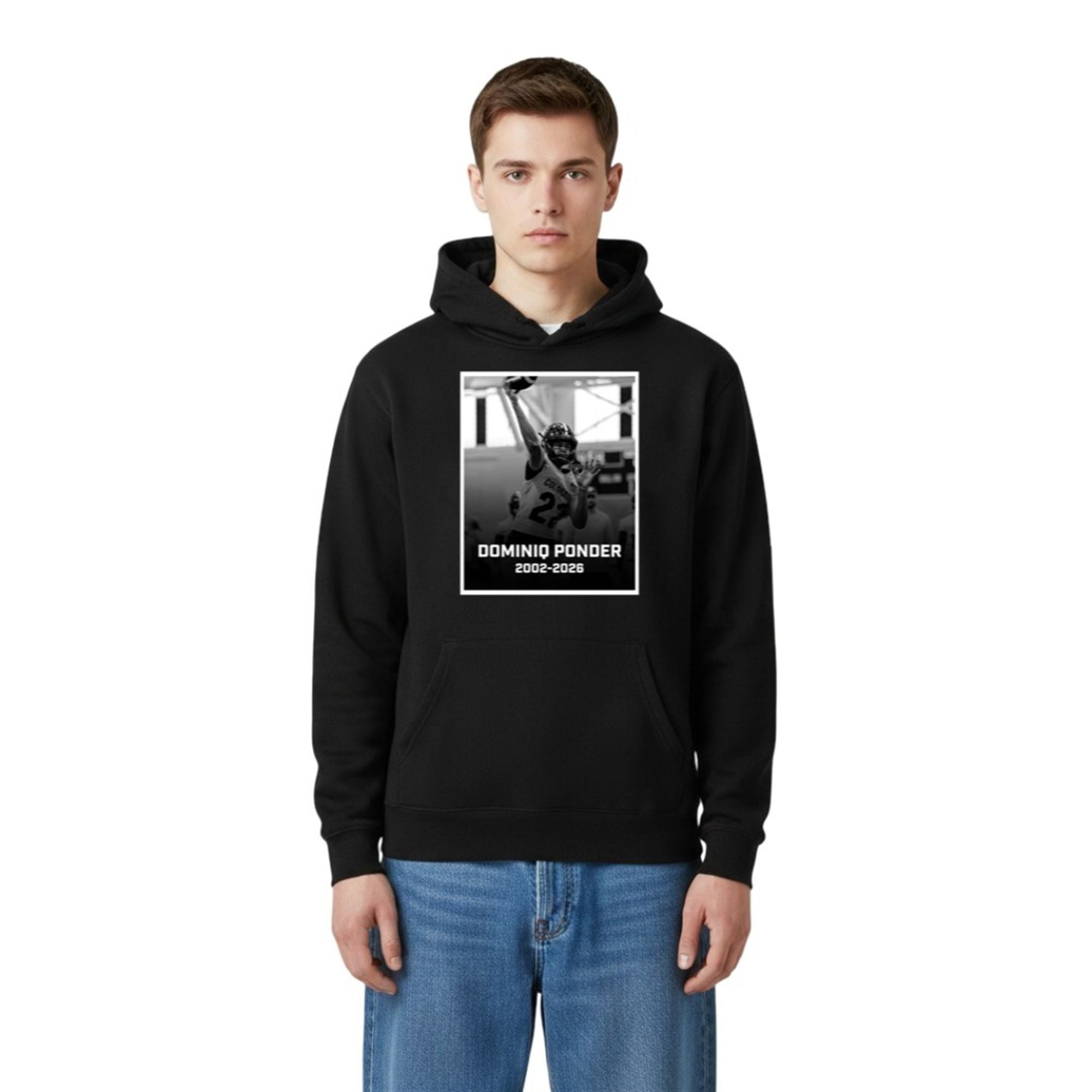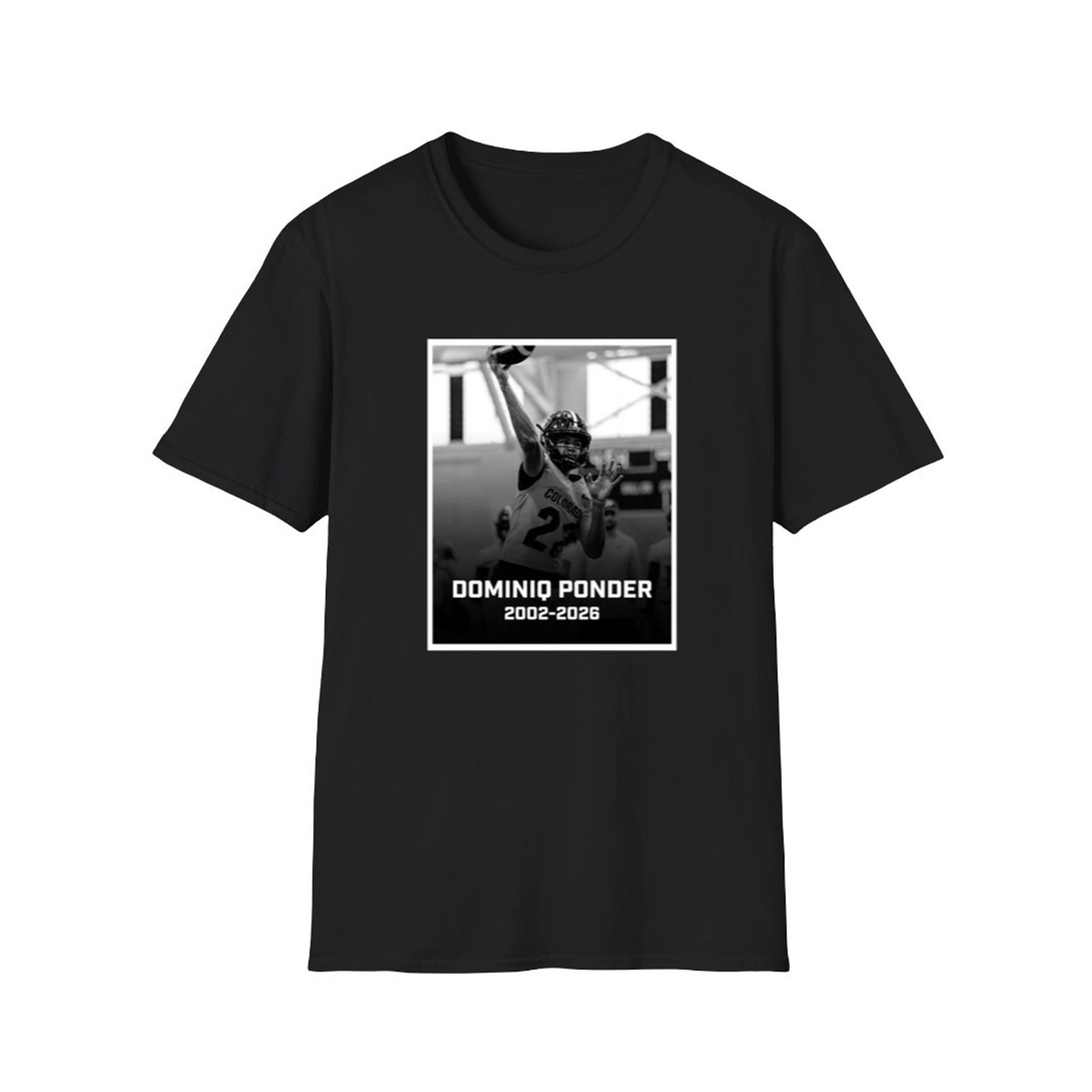 At the center of the design is a bold black-and-white action image of Dominiq Ponder in his Colorado uniform, mid-throw, representing strength, leadership, and determination. The dynamic pose highlights his role as a quarterback — focused, fearless, and driven. Beneath the powerful image, the name DOMINIQ PONDER stands prominently in strong typography, followed by the years 2002–2026, marking his life and legacy in a respectful, timeless format.