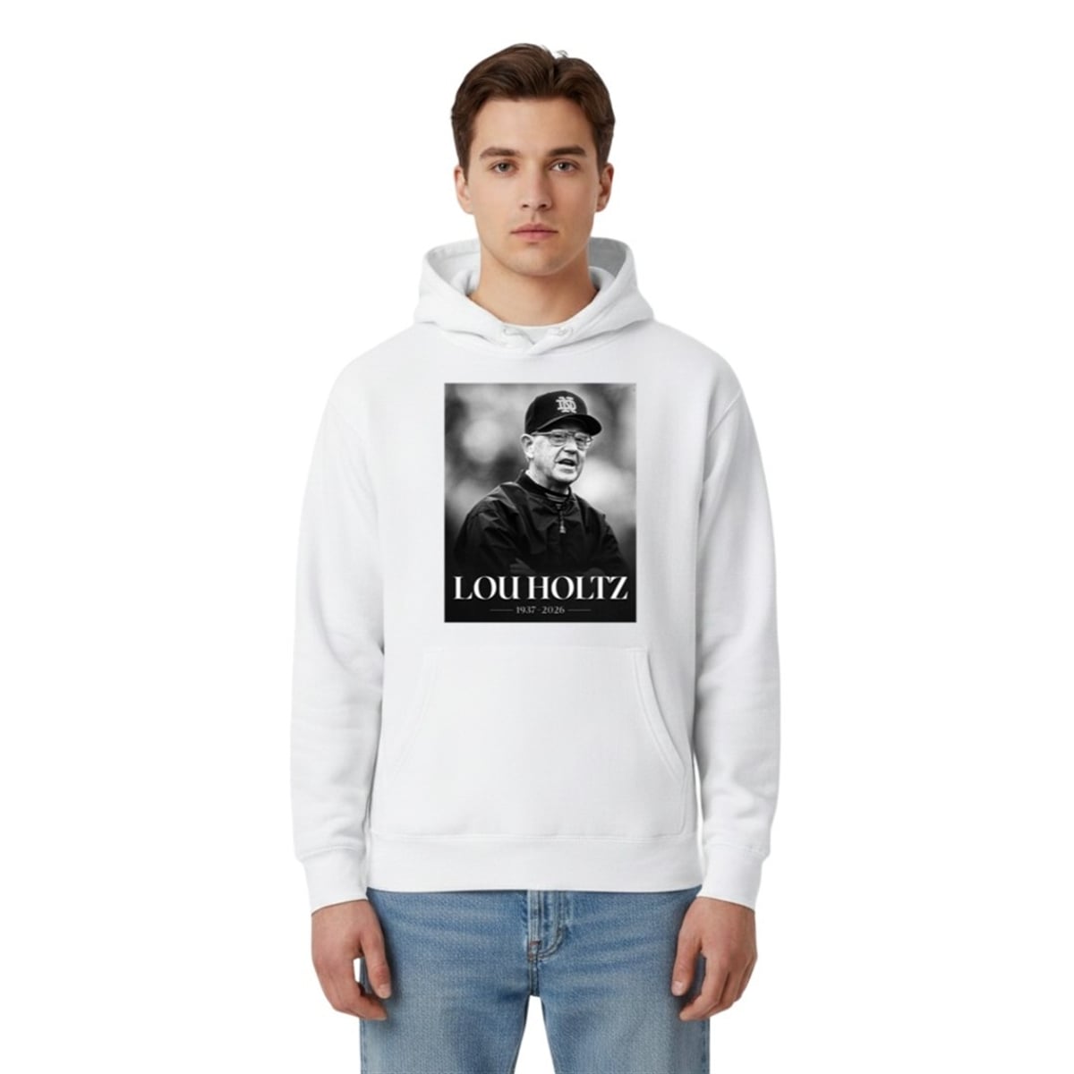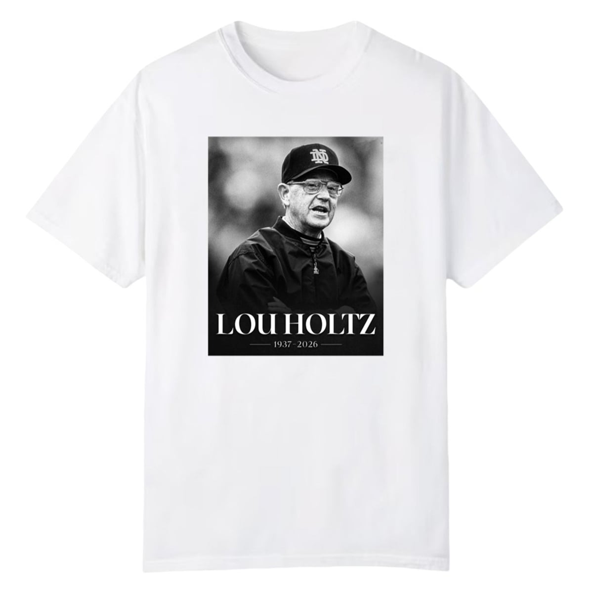 The shirt is a dedicated memorial tribute created to honor the life, career, and enduring legacy of the legendary college football coach. The front graphic prominently features a classic, high-contrast black-and-white photograph of Coach Holtz in his element, capturing his trademark focused gaze and sideline intensity. Below the portrait, the design proudly displays his name, “LOU HOLTZ,” in a bold, distinguished serif font, accompanied by the years “1937 – 2026,” marking his incredible journey. This minimalist yet striking aesthetic ensures that the focus remains entirely on the man and his monumental contributions to the sport.