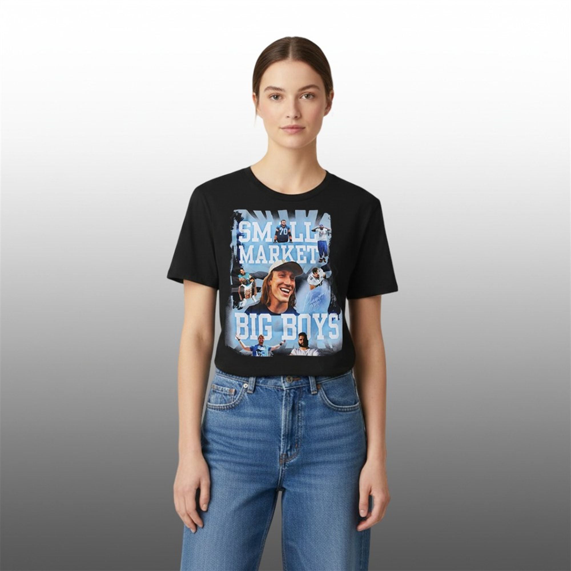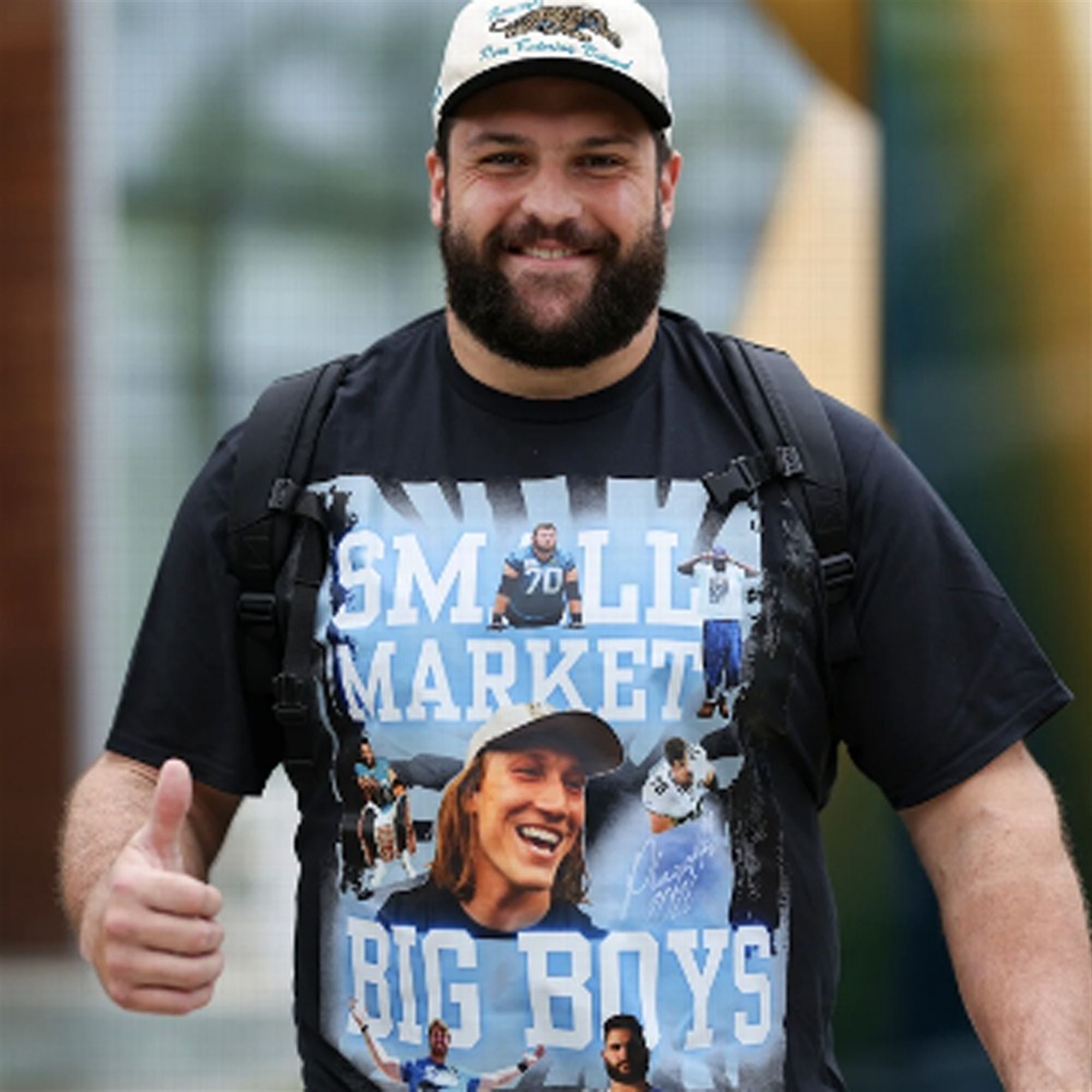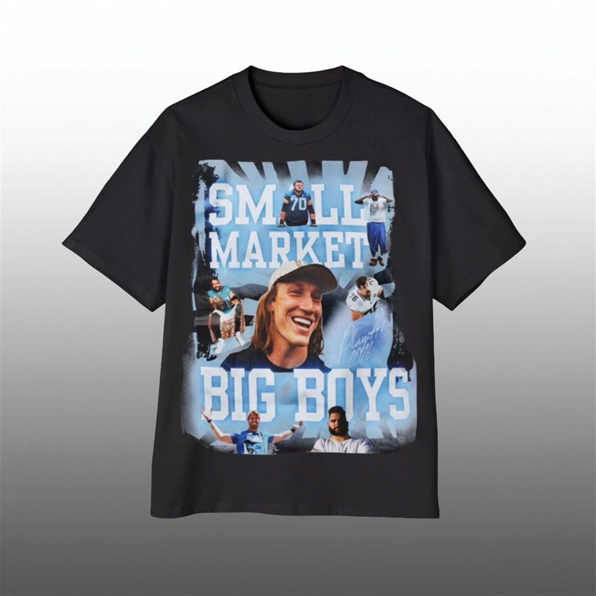 At the heart of the graphic is a collage of images featuring Jacksonville Jaguars quarterback Trevor Lawrence, showcasing his signature smile and flowing hair. The text “SMALL MARKET” and “BIG BOYS” frames the imagery in bold, collegiate-style lettering, embracing the identity of the Jacksonville franchise—a team often overlooked by national media but beloved by its fierce local fanbase.