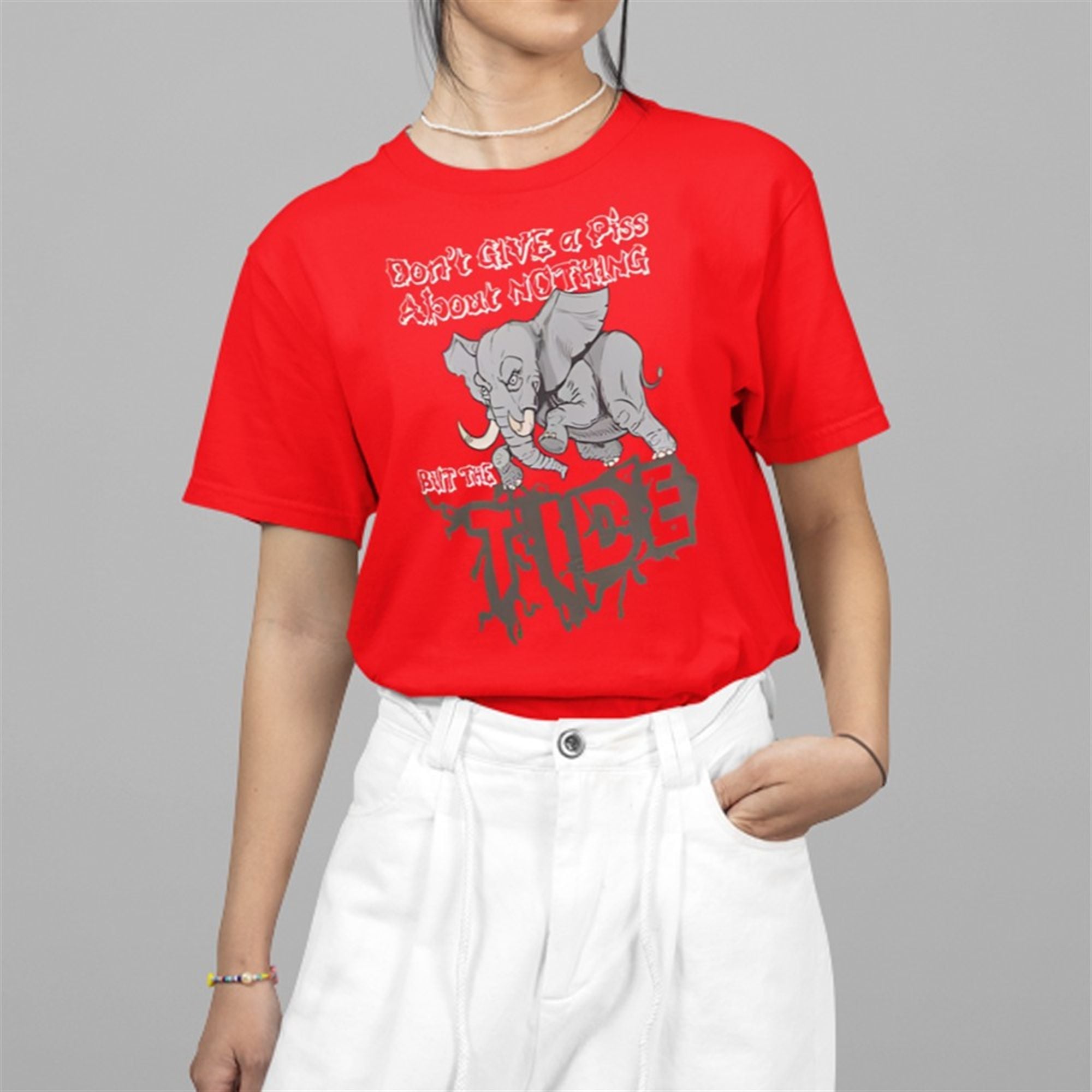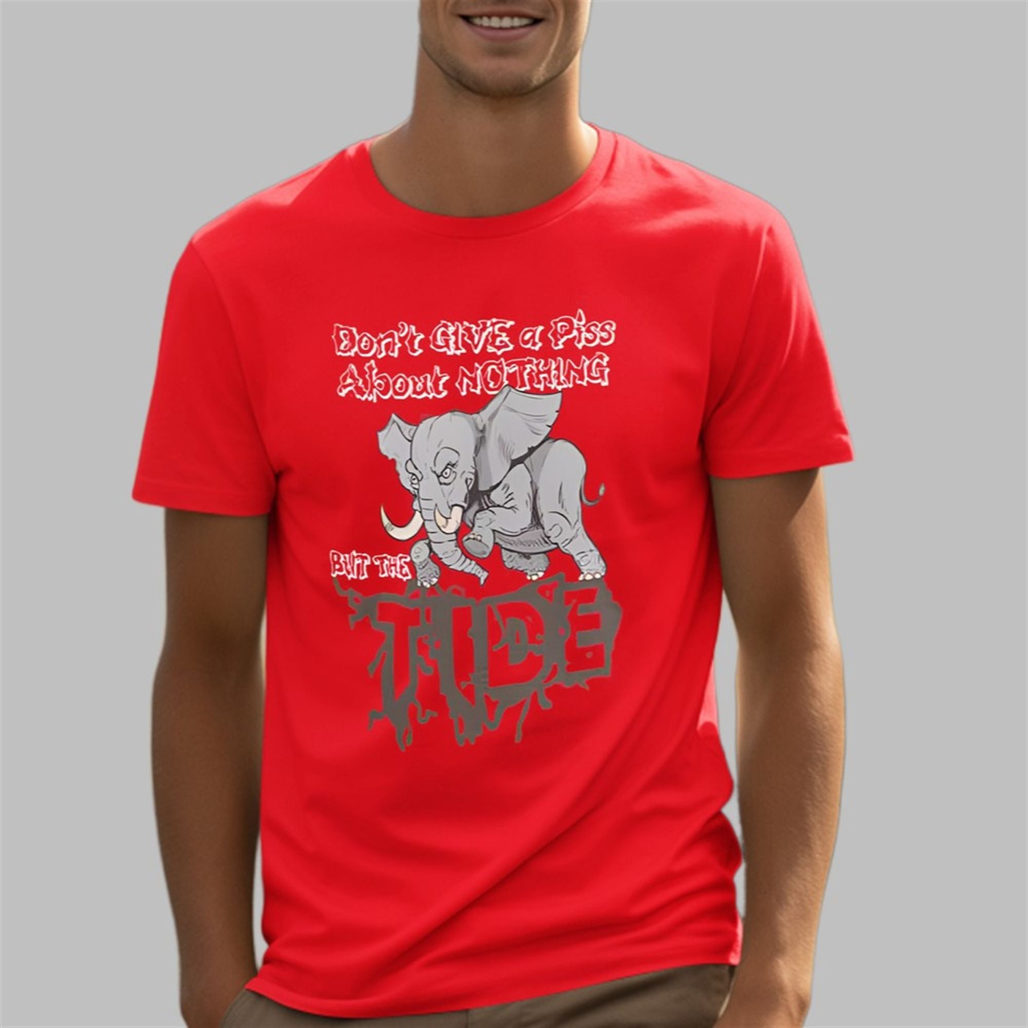 The shirt is more than just apparel; it is a badge of honor for the relentless Alabama fan. This shirt features a high-impact graphic of a fierce, charging elephant—reminiscent of the beloved Big Al—stomping over the word “TIDE” in a gritty, distressed font. Above the mascot, the now-iconic phrase “Don’t Give A Piss About Nothing” is emblazoned in bold lettering, capturing the singular focus of true Crimson Tide devotees.