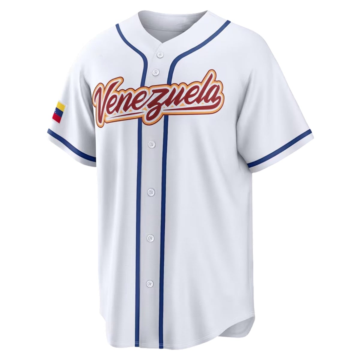 The jersey is a visual tribute to national pride and top-tier athletic competition. The design is anchored by a crisp, clean white base, elegantly framed by thin royal blue piping that runs down the front placket and loops around the neckline. Across the chest, the word “Venezuela” is displayed in a flowing, dynamic script, colored in a rich maroon and highlighted by a striking gold outline.