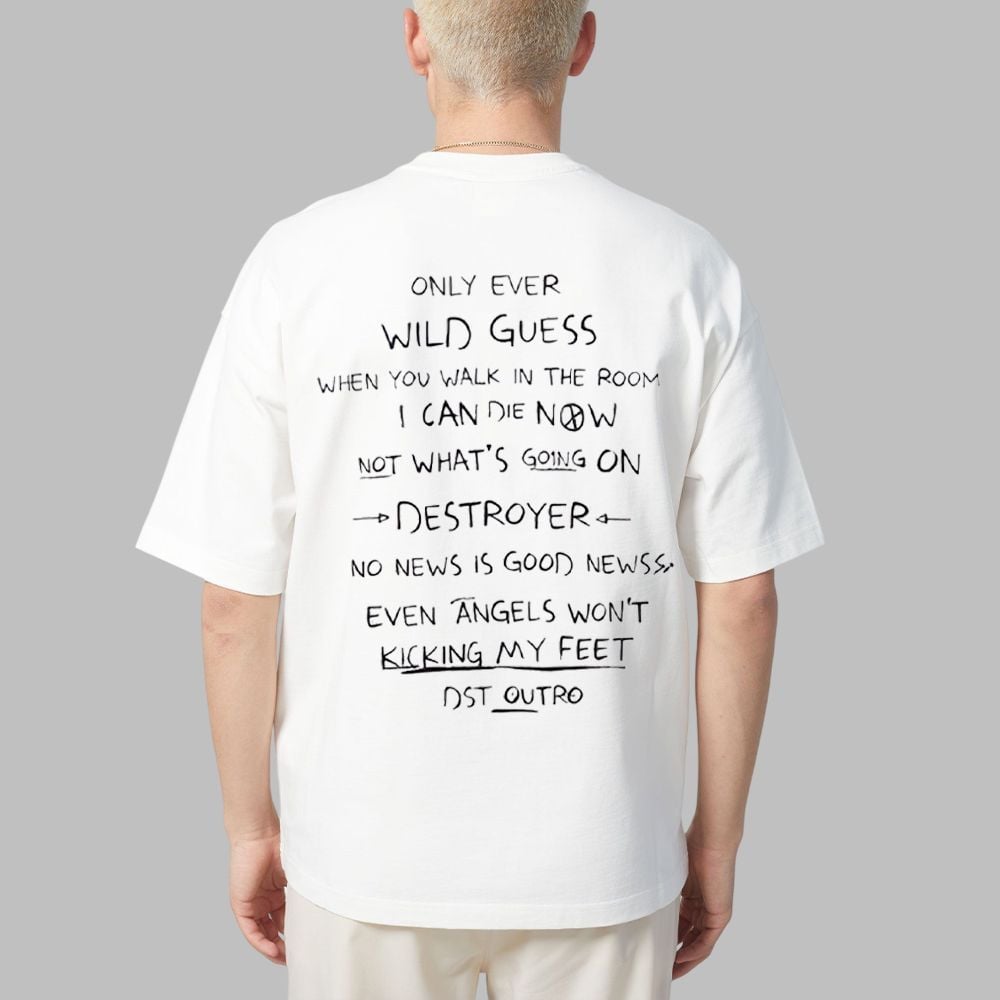 This shirt perfectly captures the aesthetic of Ruel’s musical evolution. The front features the powerful, declarative phrase “I WONT BE YOUR BABY ANYMORE” in a raw, handwritten script, echoing the personal and unfiltered emotion poured into his lyrics. But the story doesn’t stop there. The back of the shirt is a tribute to the album’s narrative, featuring a curated list of song titles and key phrases like “ONLY EVER WILD GUESS,” “I CAN DIE NOW,” “DESTROYER,” and “4TH WALL OUTRO.” This two-sided design transforms the shirt from a simple statement piece into a wearable tracklist, a conversation starter for fellow fans who will instantly recognize the references.